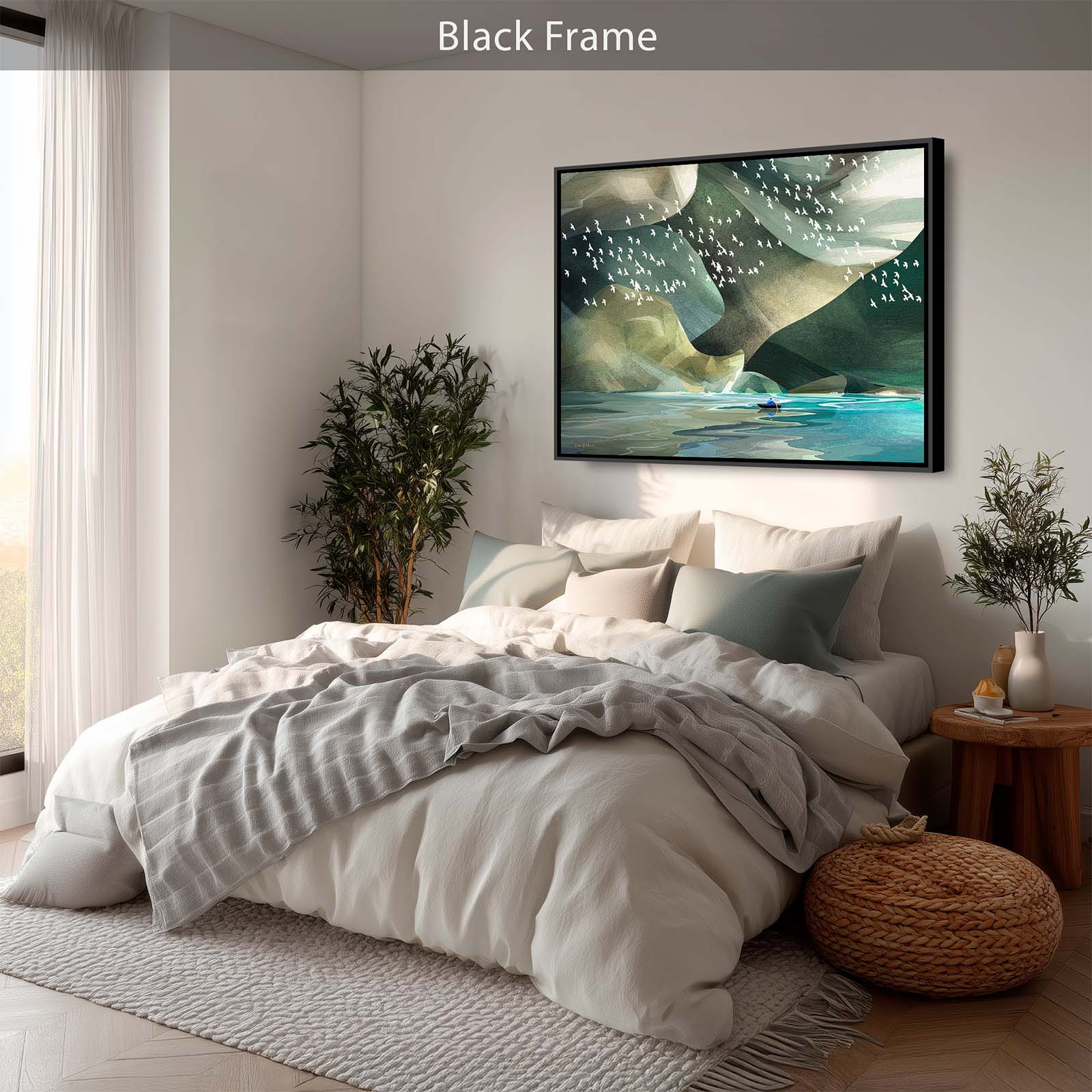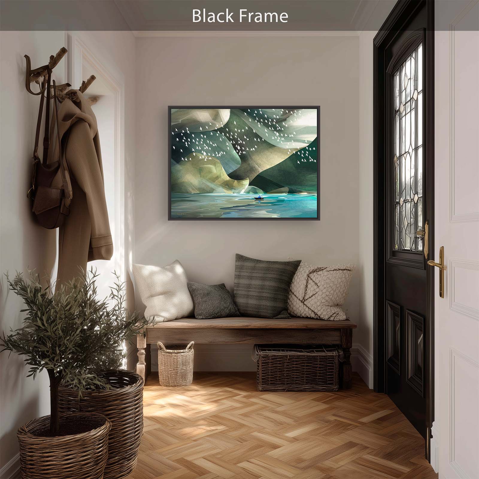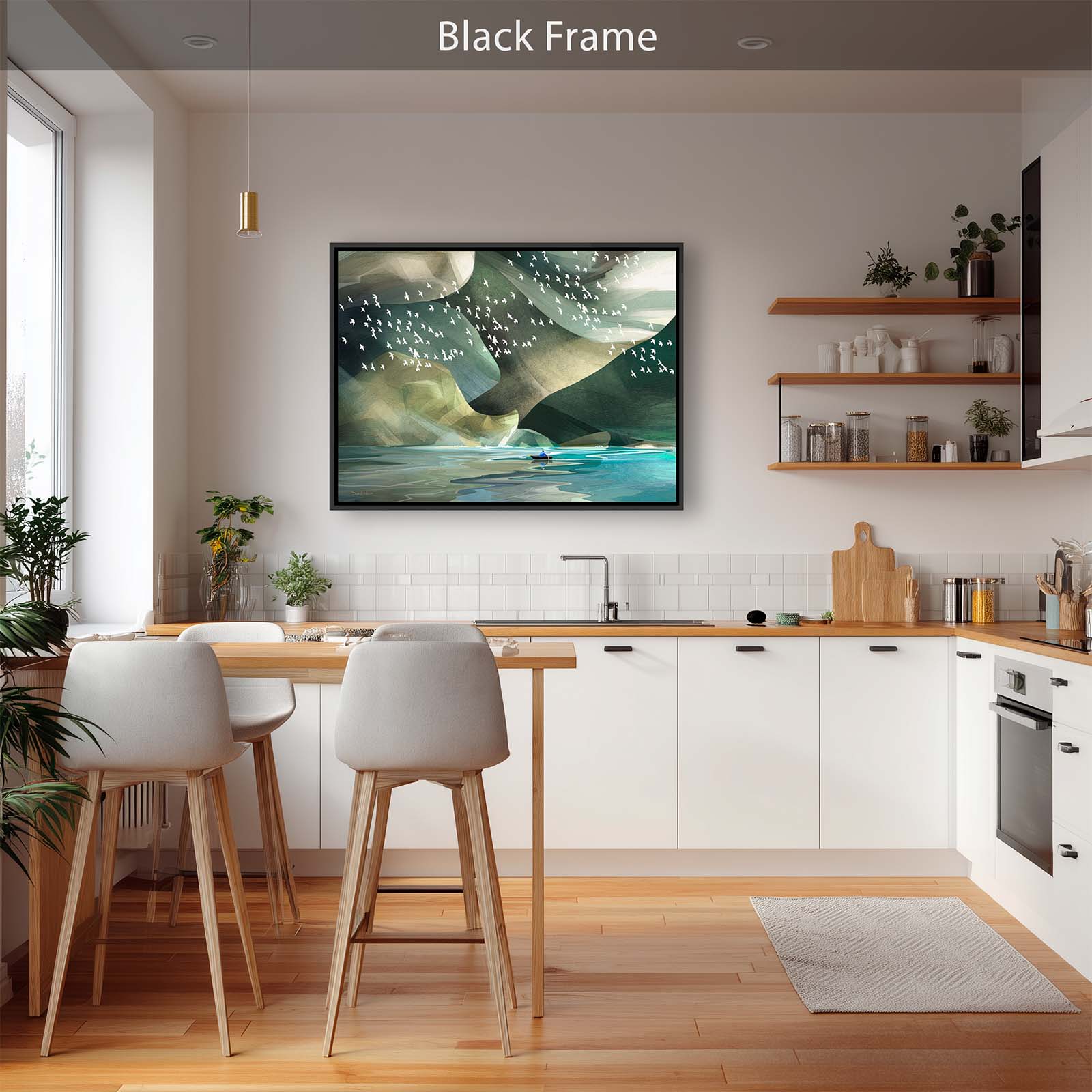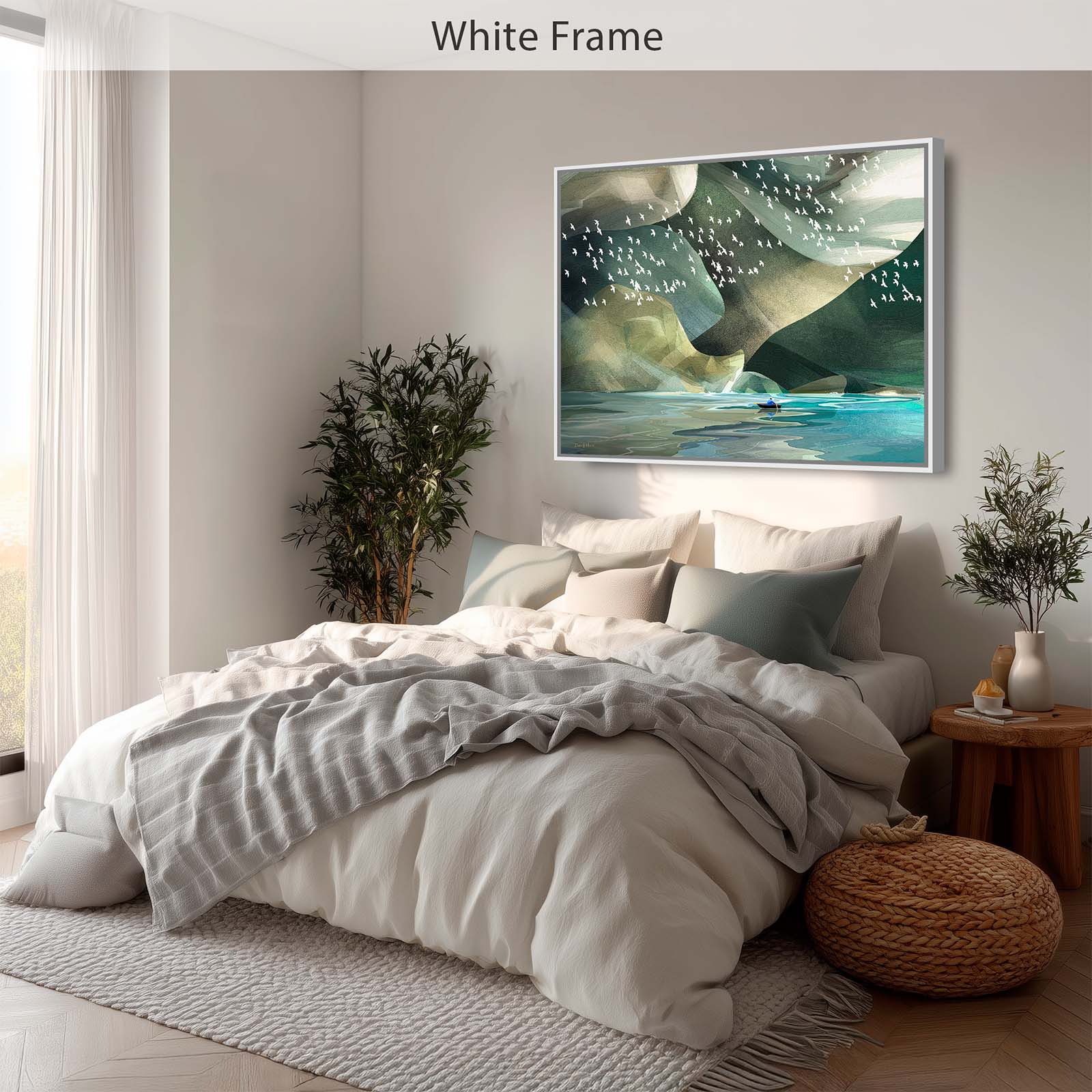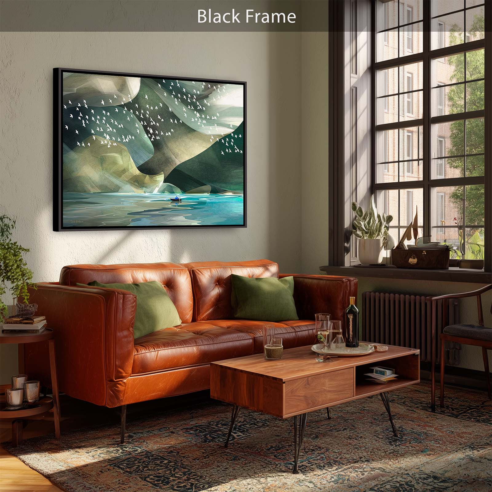 This detailed canvas print captures a solitary boater drifting beneath majestic seaside cliffs as a flock of seabirds arcs gracefully above. The delicate play of light and shadow brings movement and stillness together in perfect balance—creating a peaceful yet dynamic scene full of subtle, delightful shapes. Gentle, refined colors make this piece a harmonious fit for almost any room or décor style.
