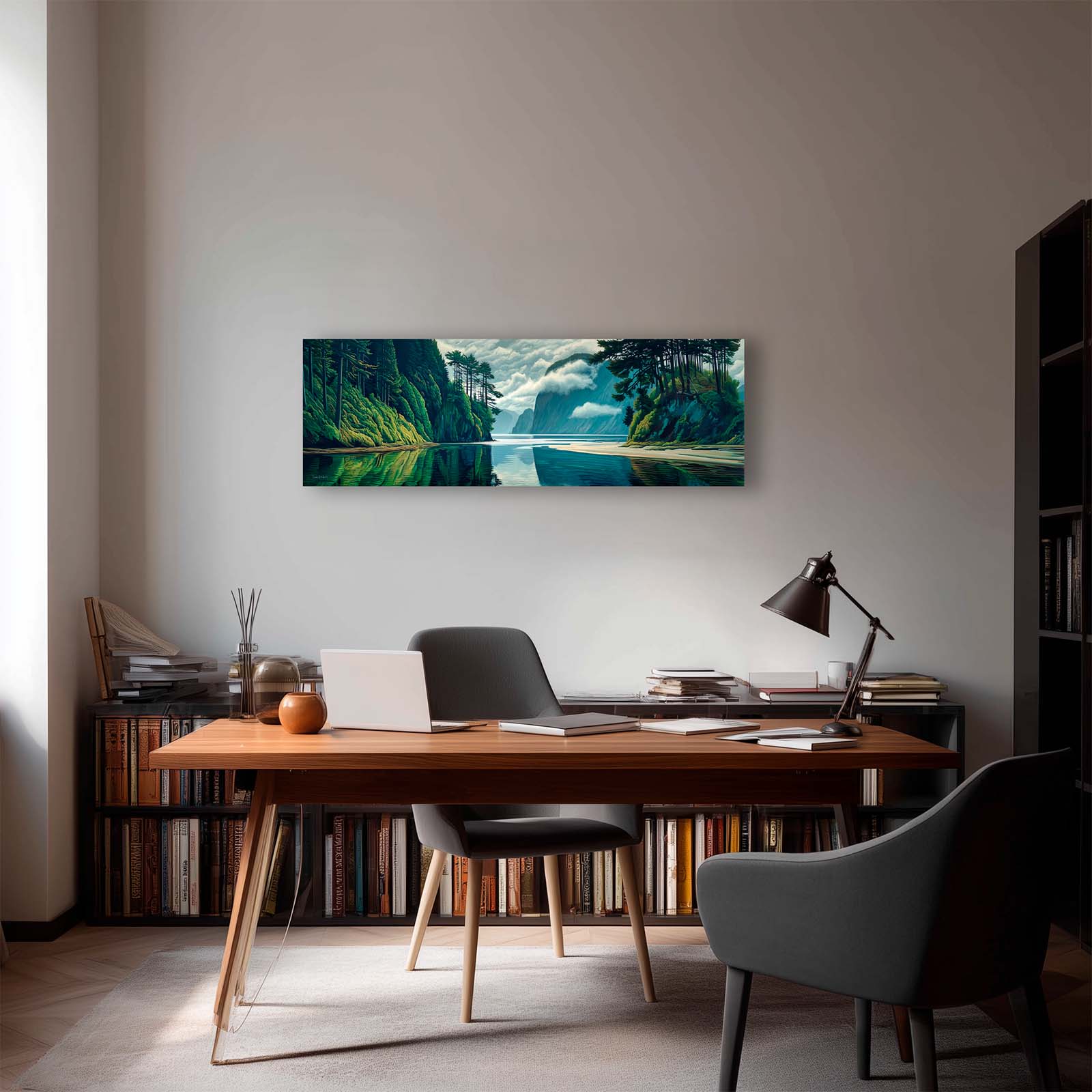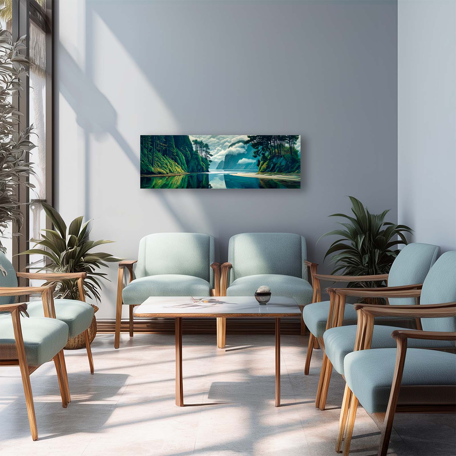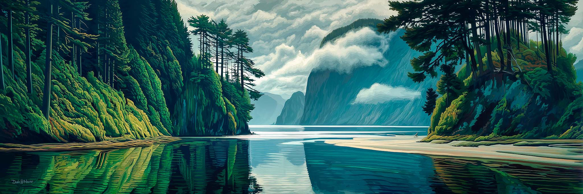 This naturalistic, illustrative canvas print captures the serene beauty of a perfect day on the water. From the vantage point at the end of a tranquil inlet, forested mountains rise gracefully from the sea, their forms mirrored flawlessly in the glassy surface below. Gentle blues and greens blend with soft light and shadow, creating a scene of pure stillness and harmony.