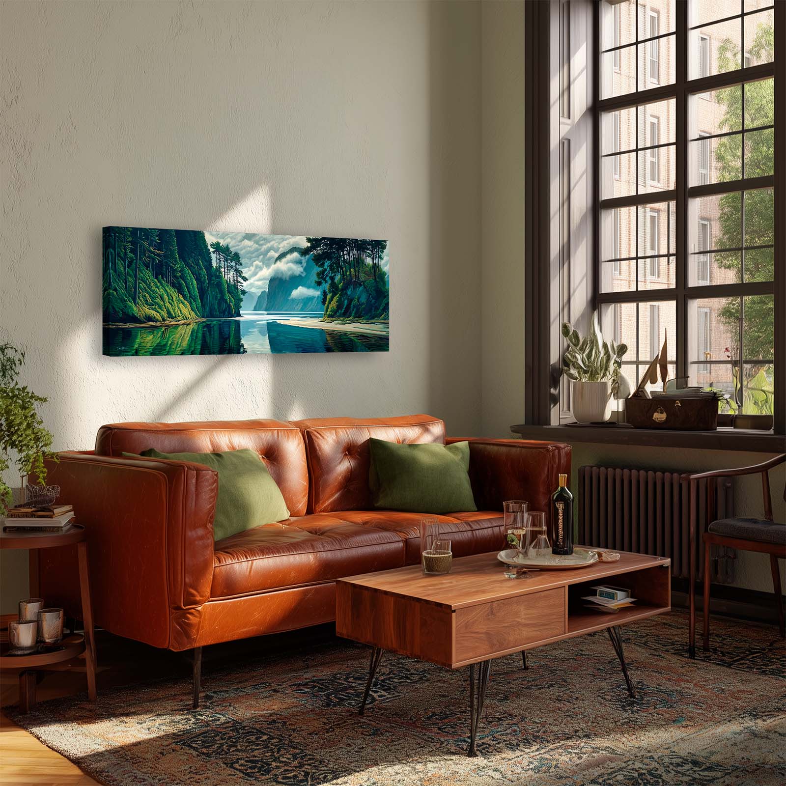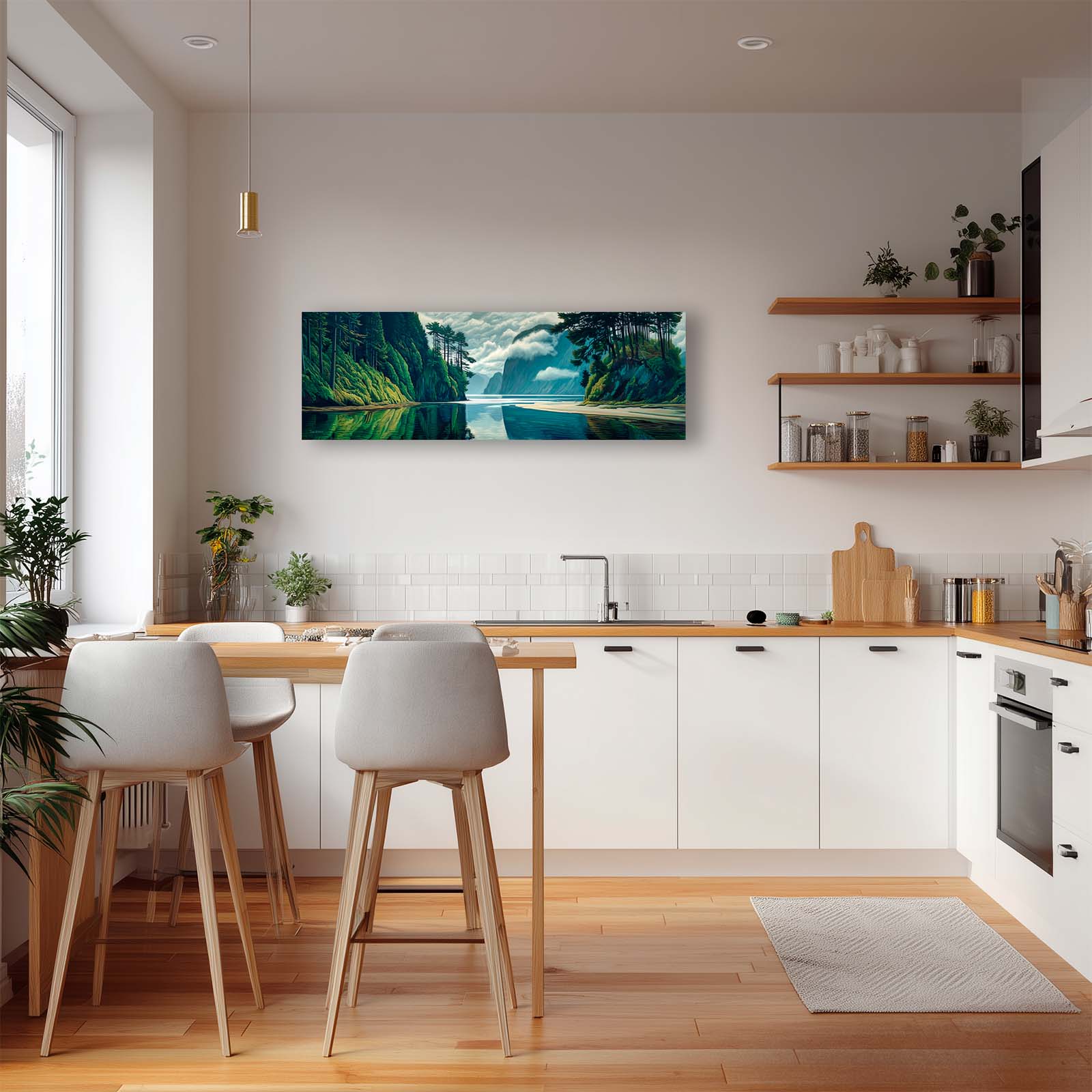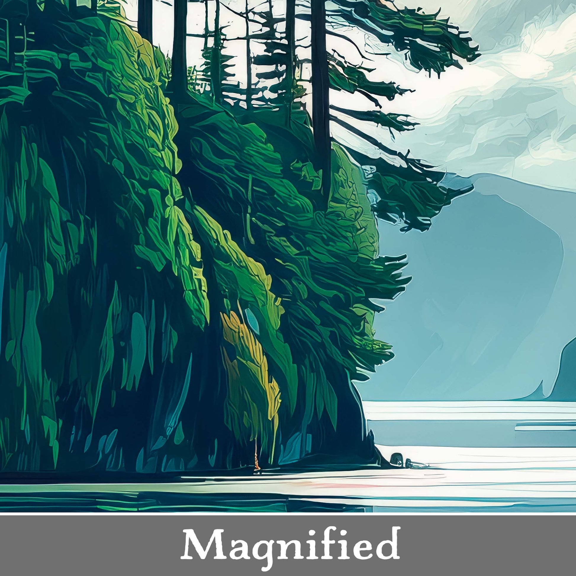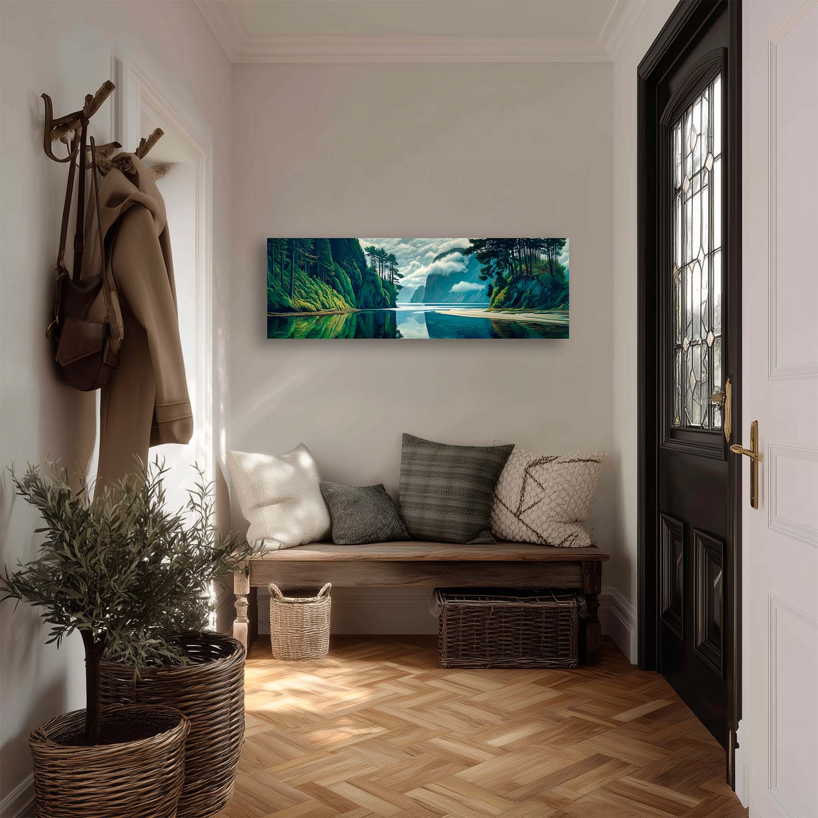 This naturalistic, illustrative canvas print captures the serene beauty of a perfect day on the water. From the vantage point at the end of a tranquil inlet, forested mountains rise gracefully from the sea, their forms mirrored flawlessly in the glassy surface below. Gentle blues and greens blend with soft light and shadow, creating a scene of pure stillness and harmony.