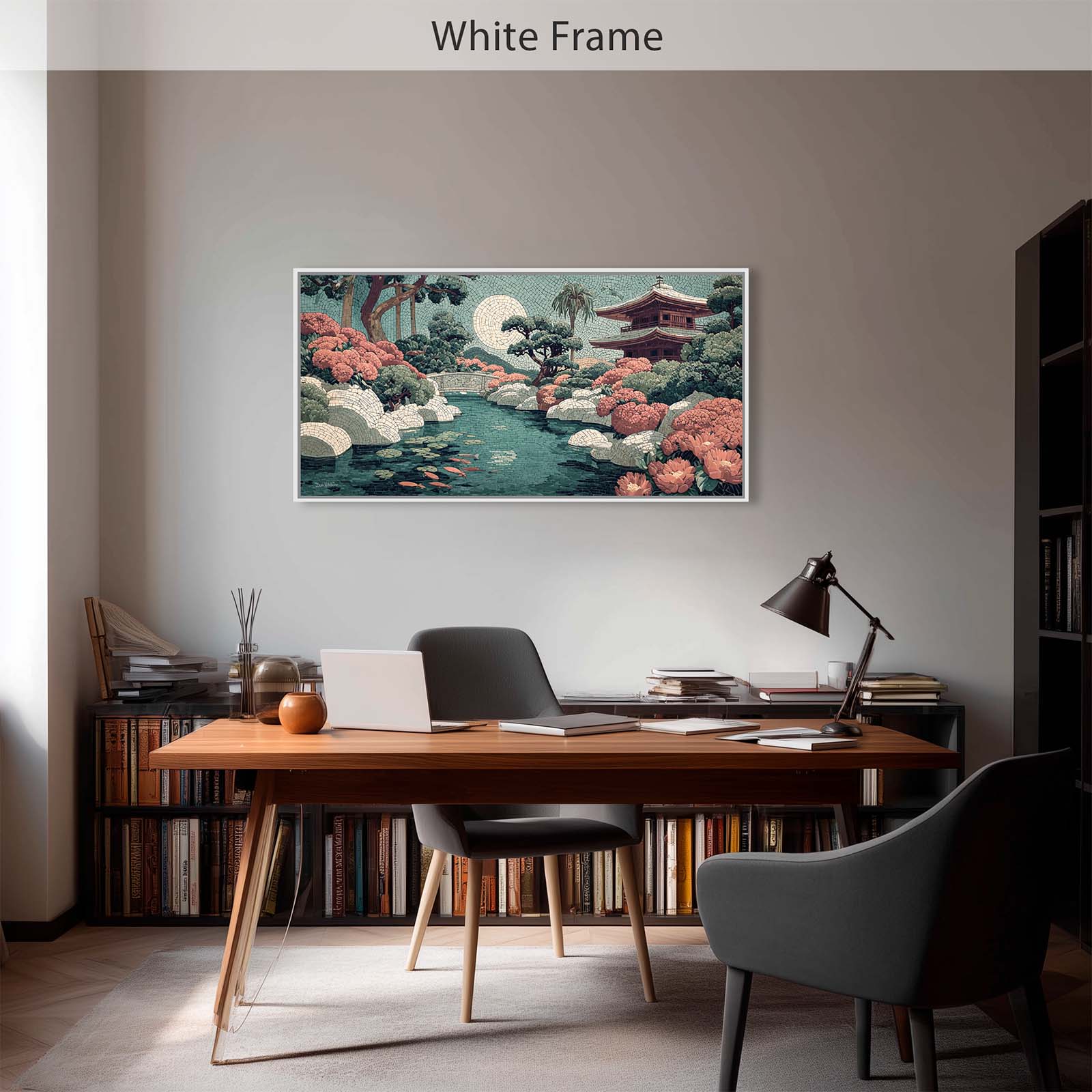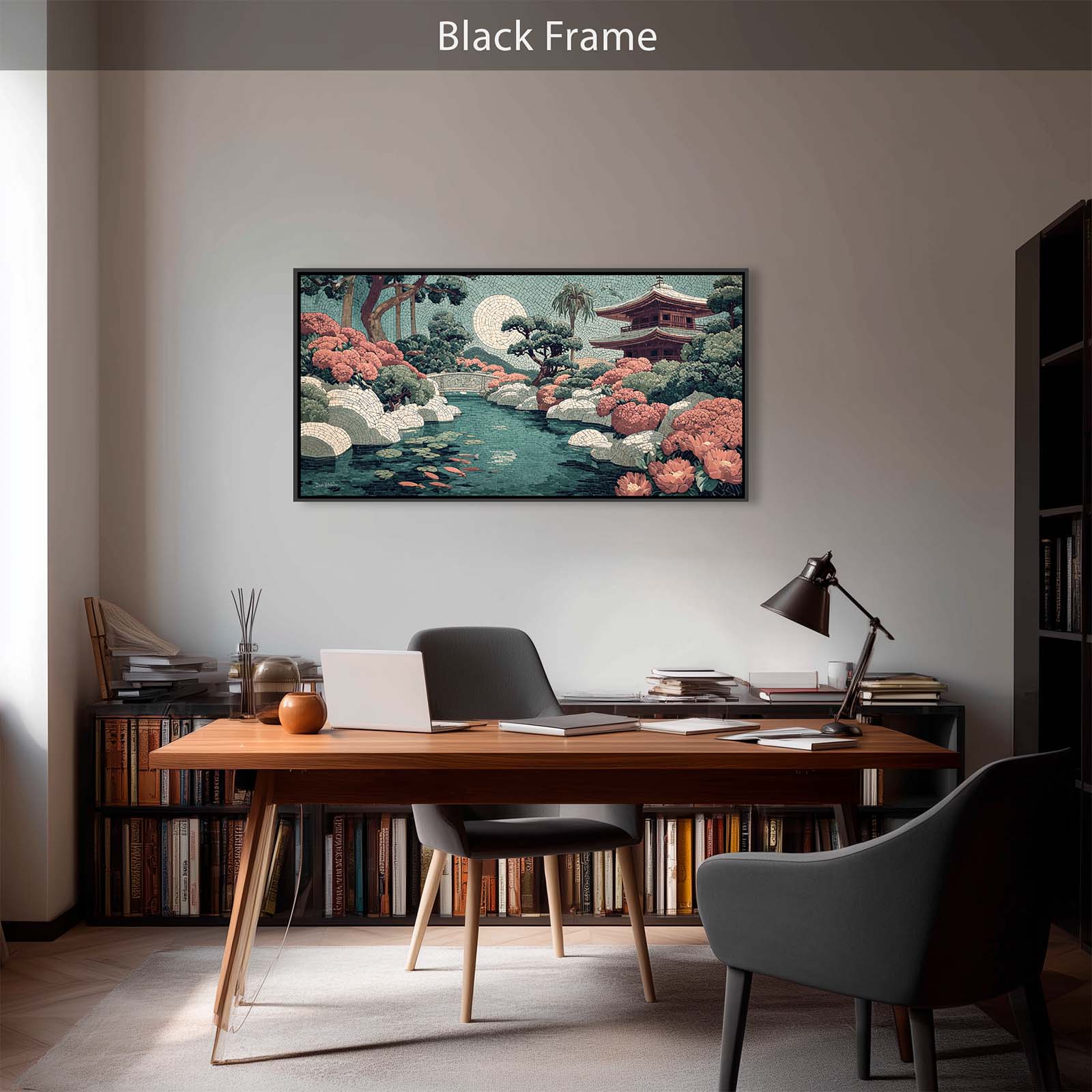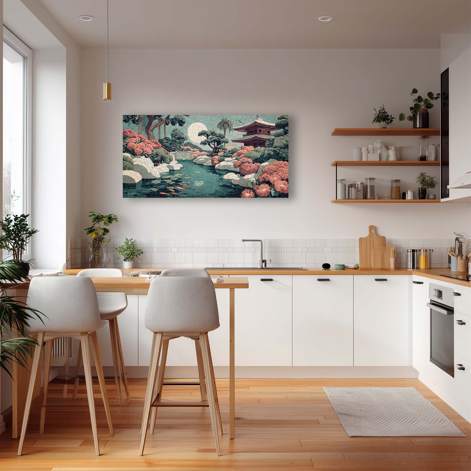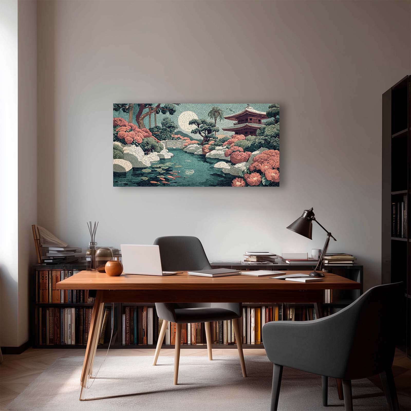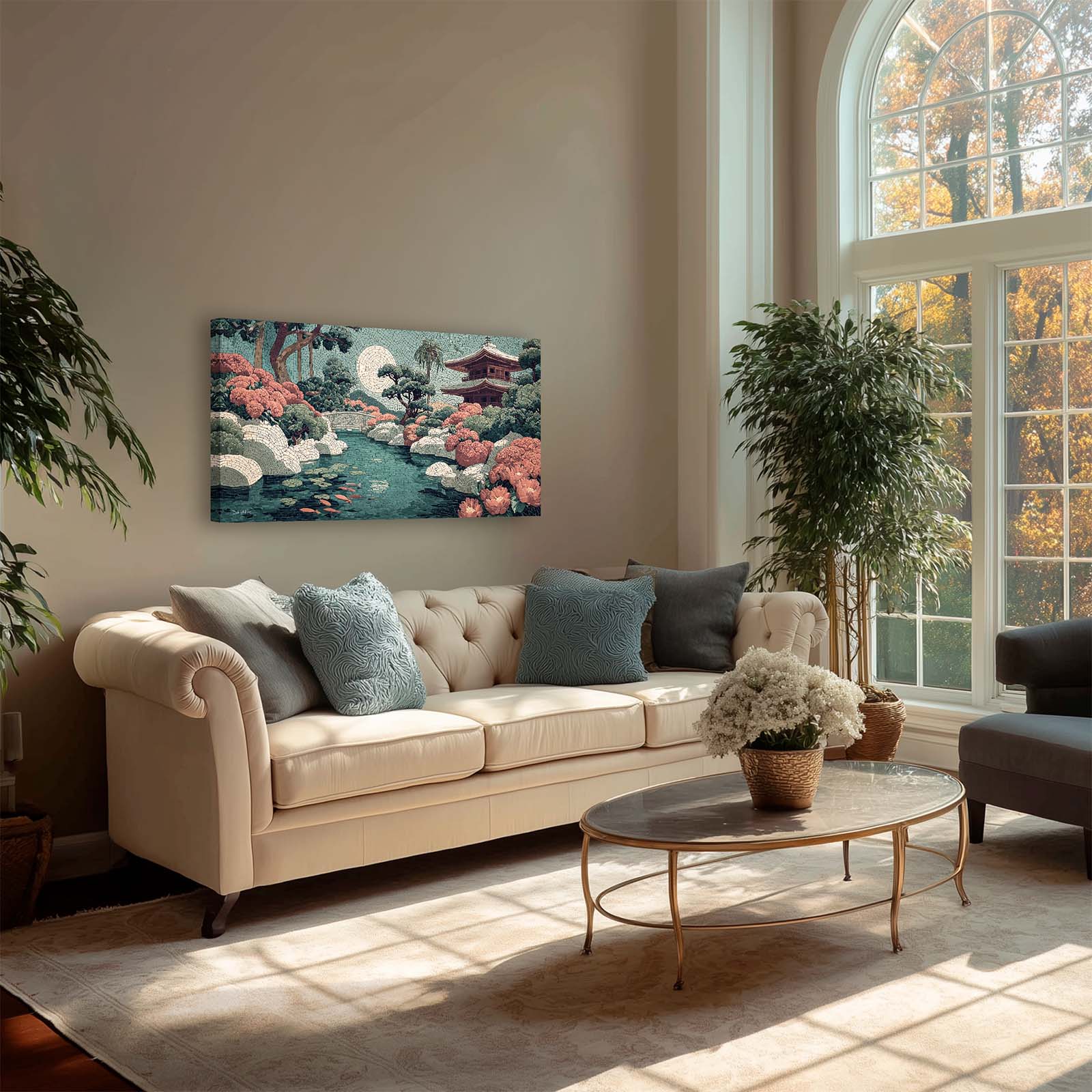 Elevate your space with this stunning giclee canvas print, featuring a serene teahouse, shimmering stream, and koi pond under a full moon. Rendered in mosaic style, it adds elegance and tranquility to any room in your home or office.