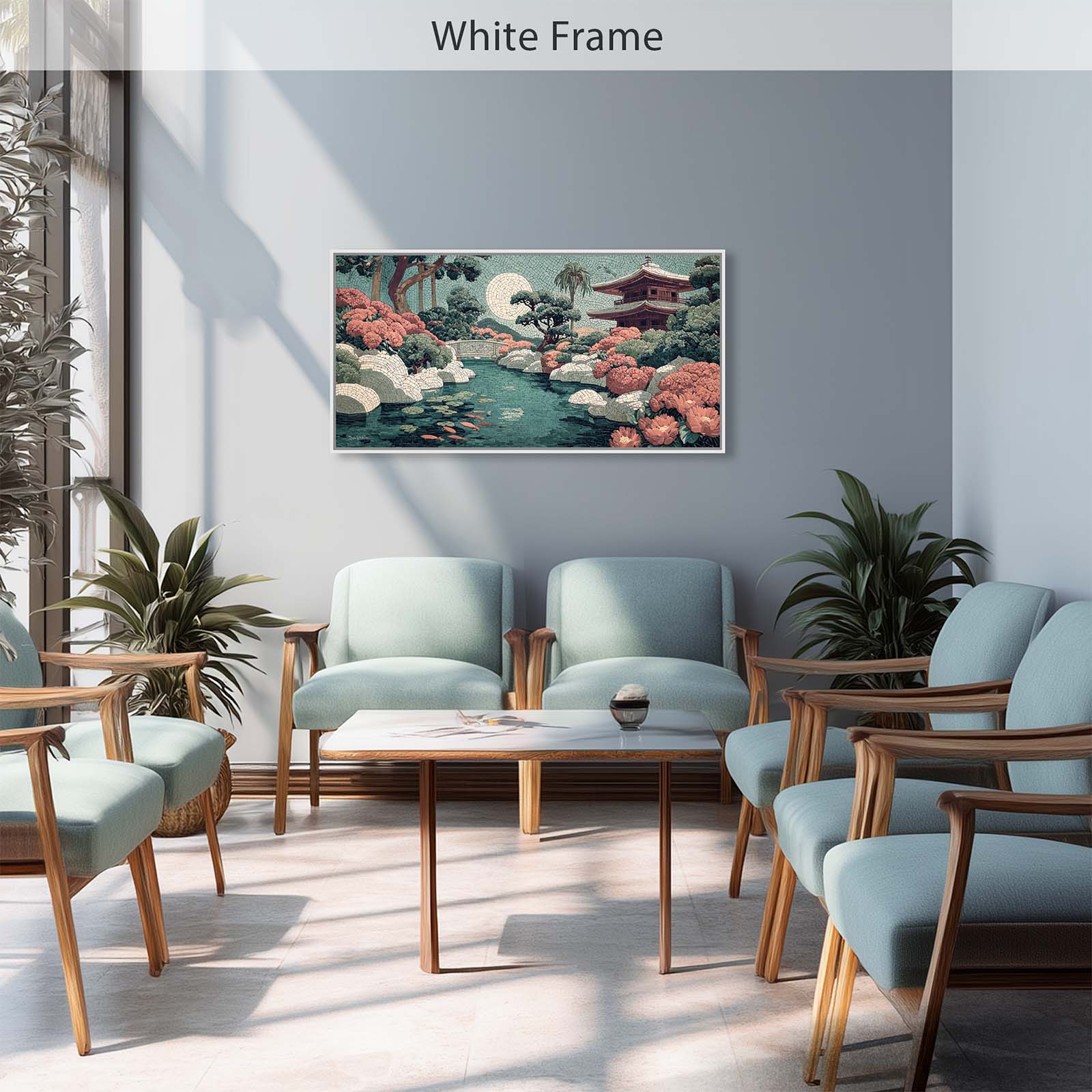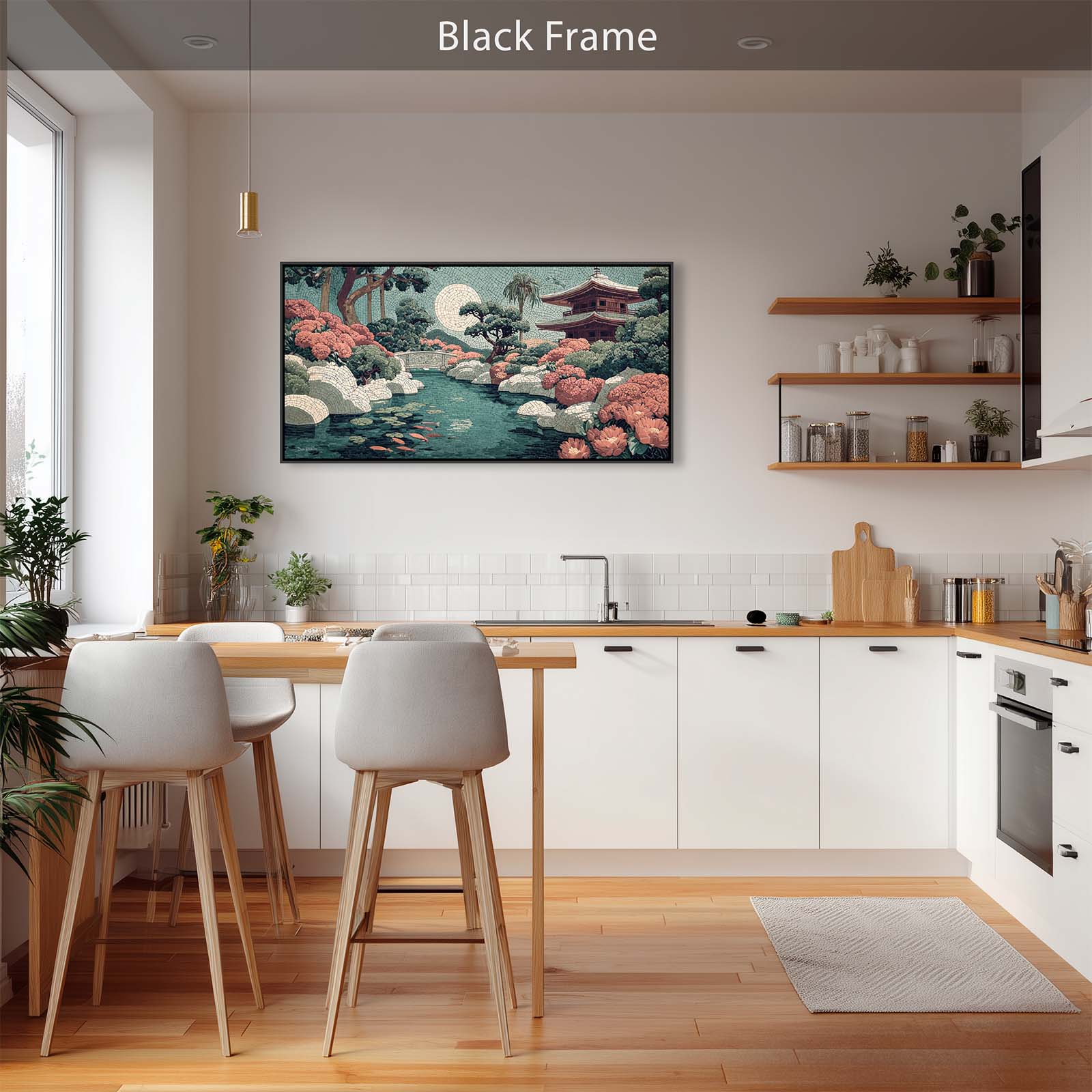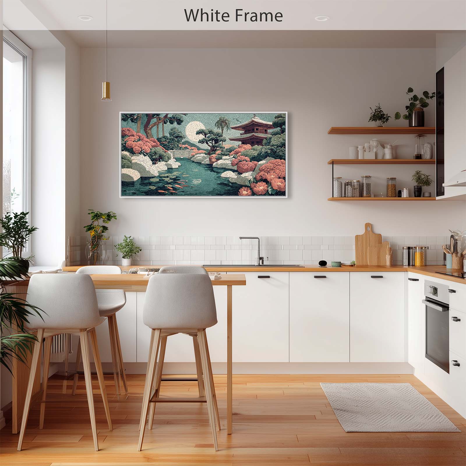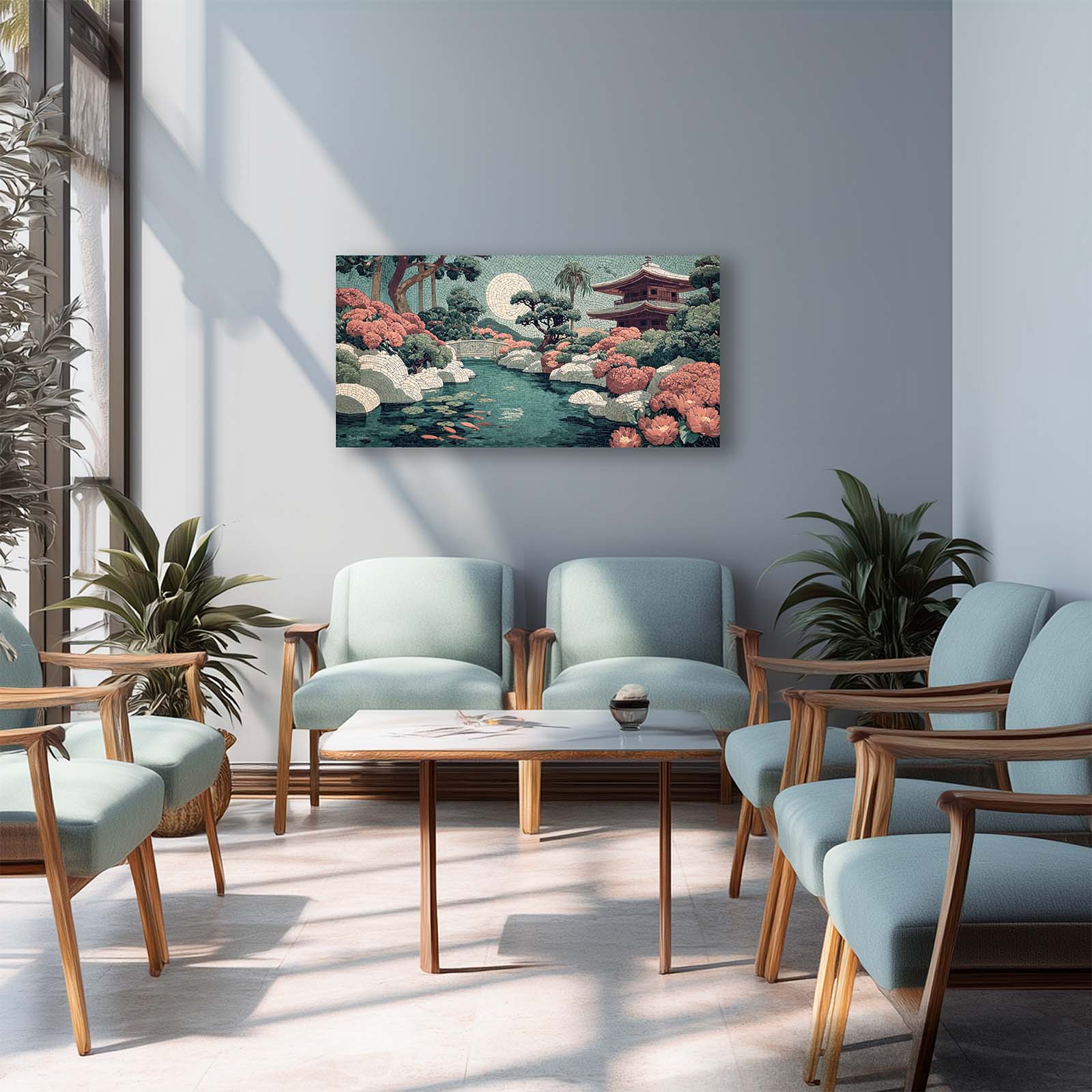 Elevate your space with this stunning giclee canvas print, featuring a serene teahouse, shimmering stream, and koi pond under a full moon. Rendered in mosaic style, it adds elegance and tranquility to any room in your home or office.