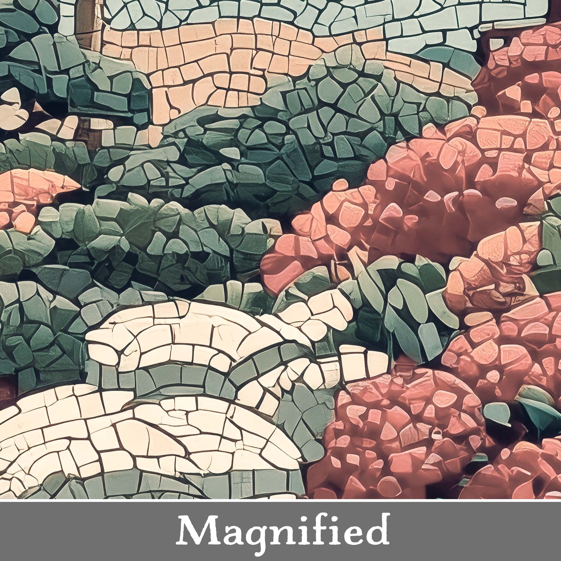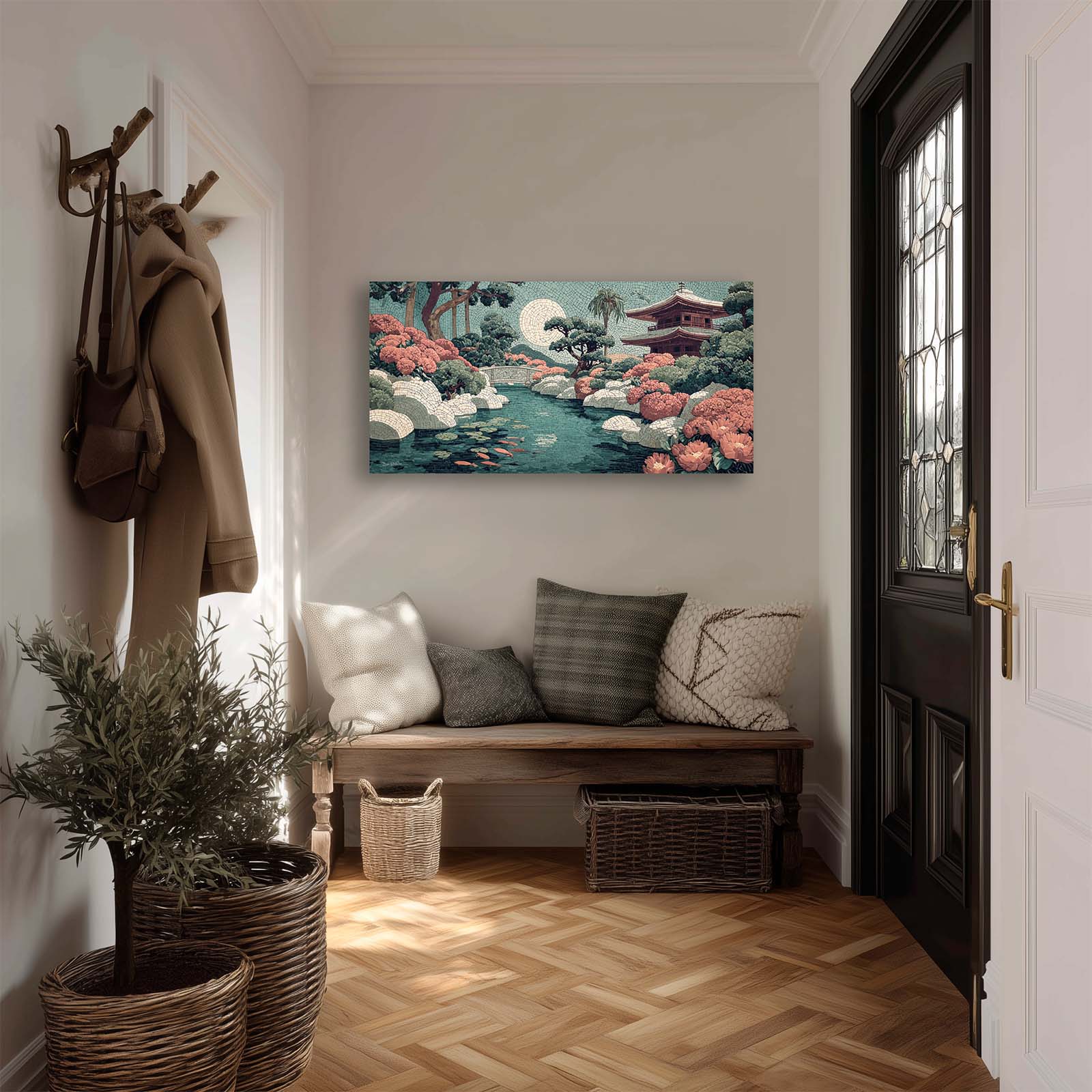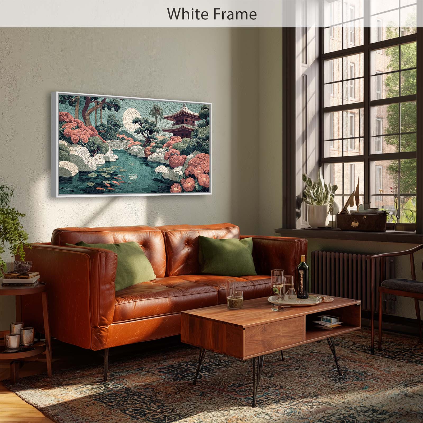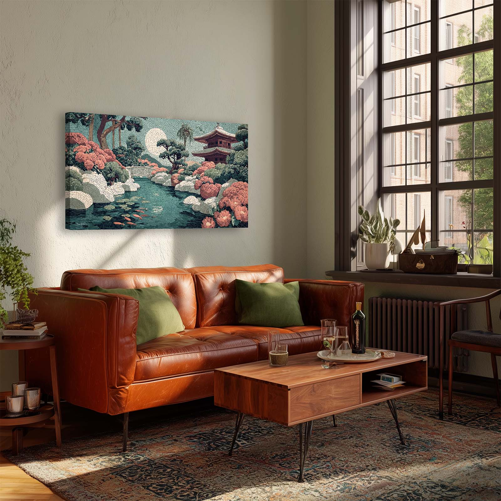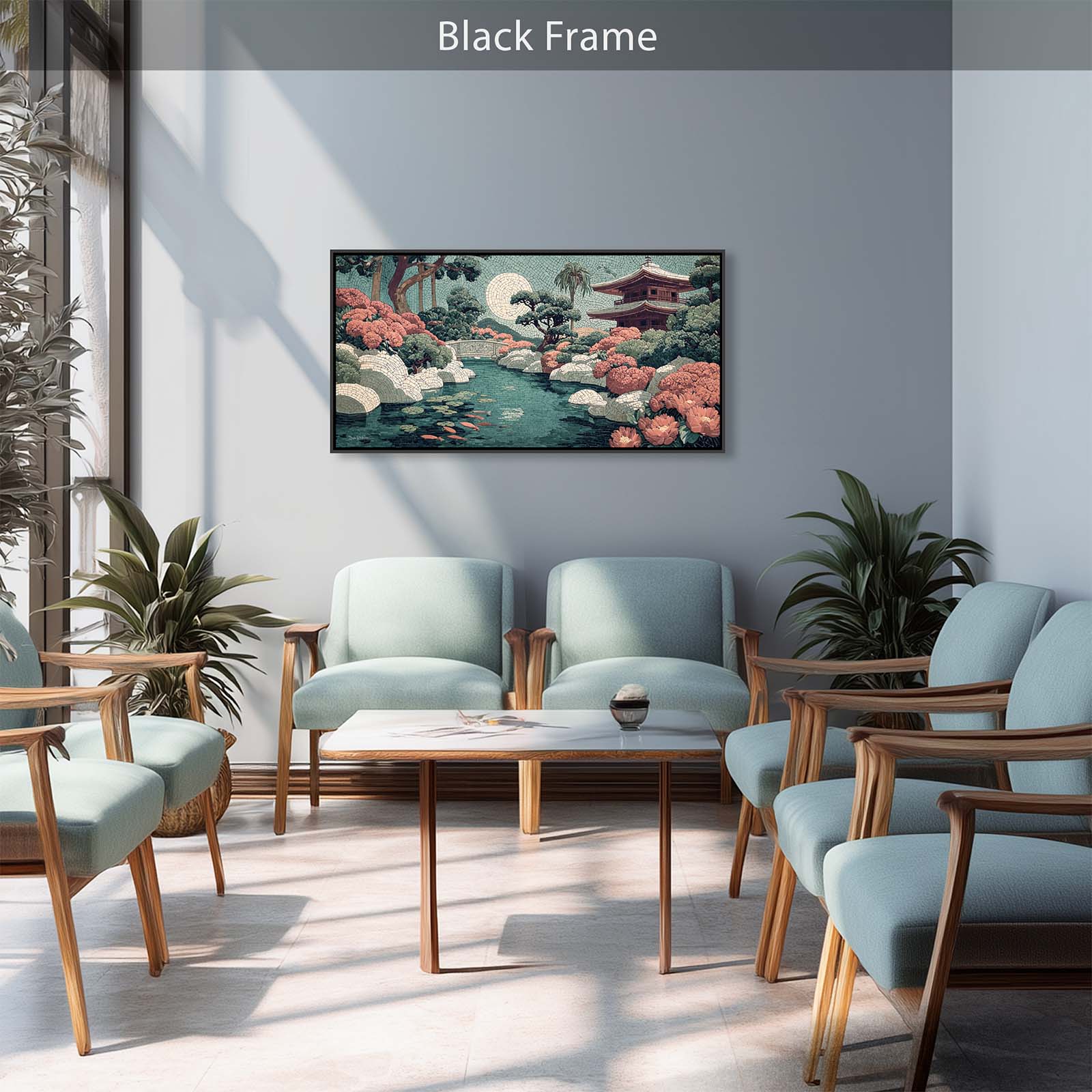 Elevate your space with this stunning giclee canvas print, featuring a serene teahouse, shimmering stream, and koi pond under a full moon. Rendered in mosaic style, it adds elegance and tranquility to any room in your home or office.