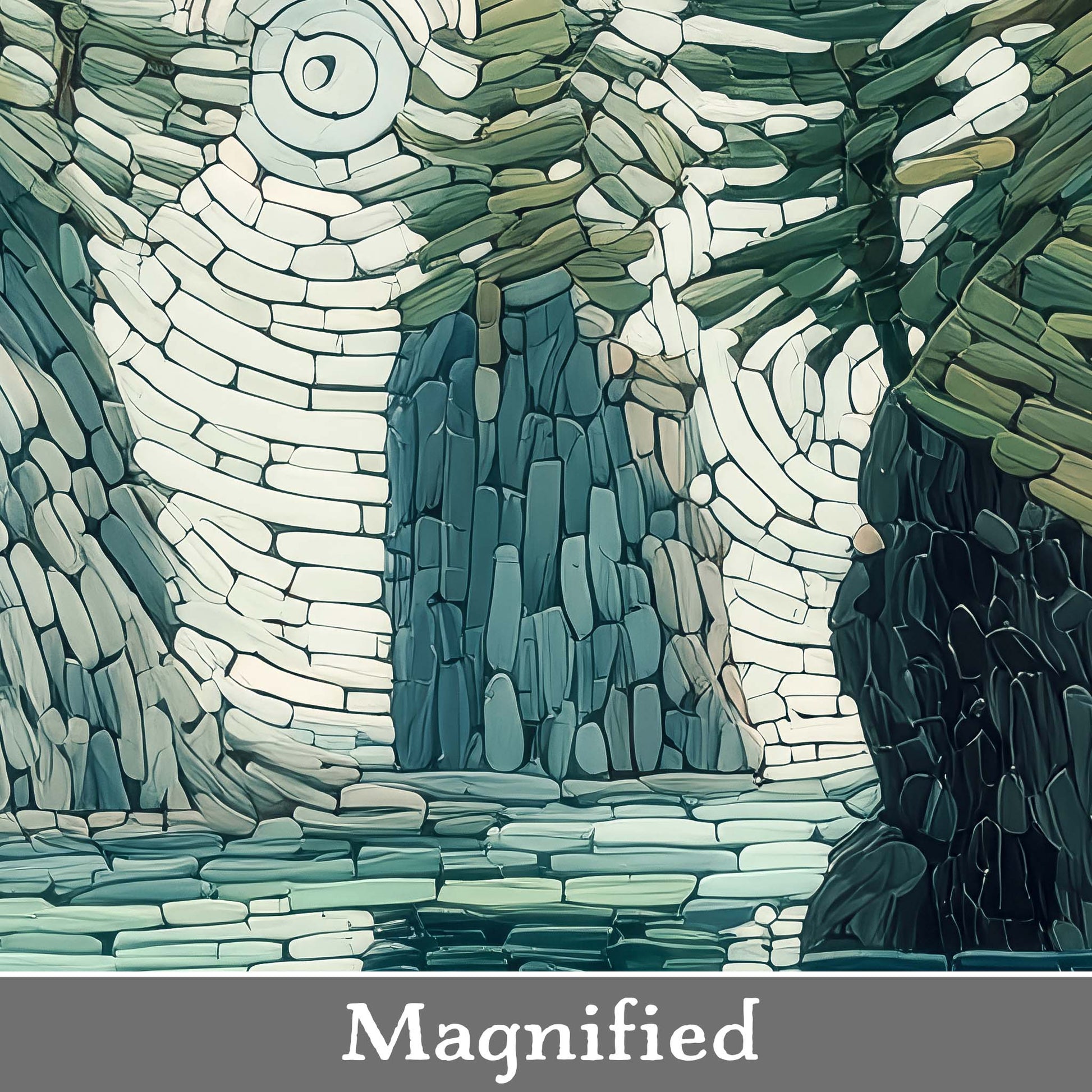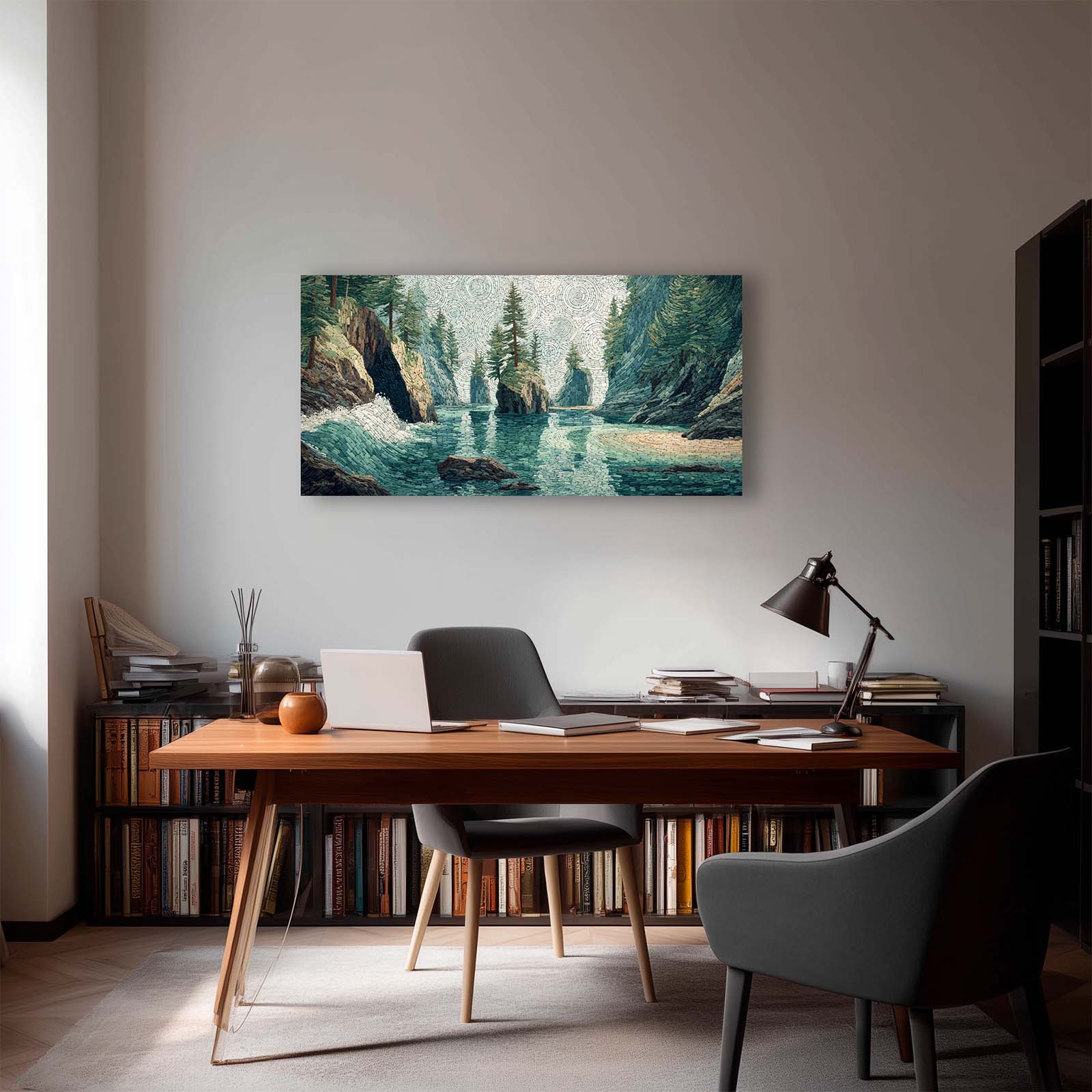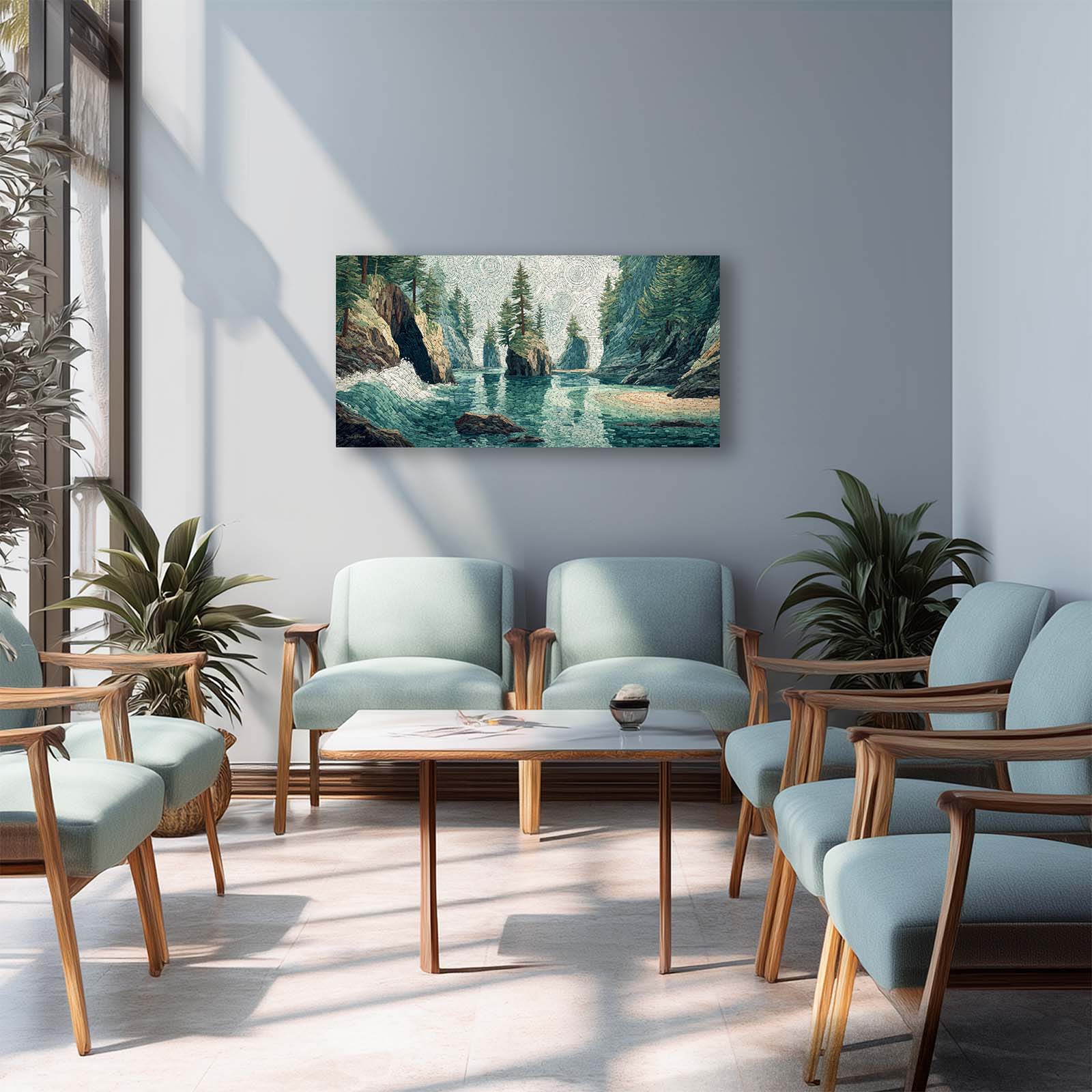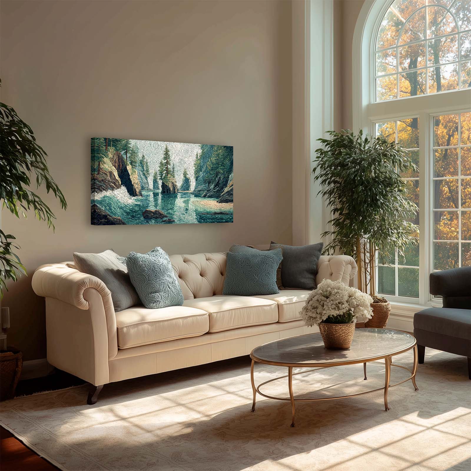 Enhance your space with this giclee canvas print of a small sea stack in a Pacific Northwest coastal inlet, rendered in mosaic style. Its serene beauty complements most rooms, adding natural charm and visual interest to your home or office.