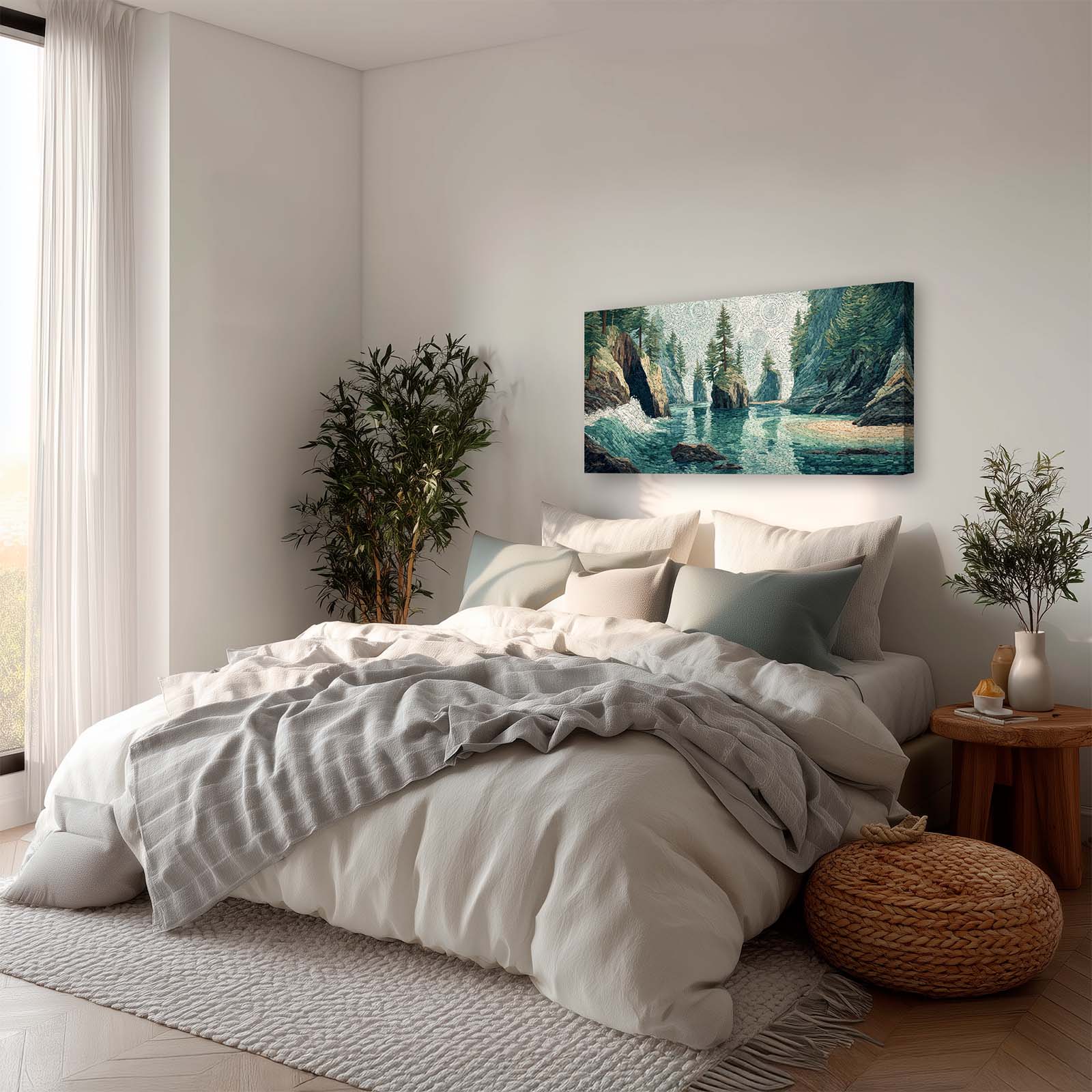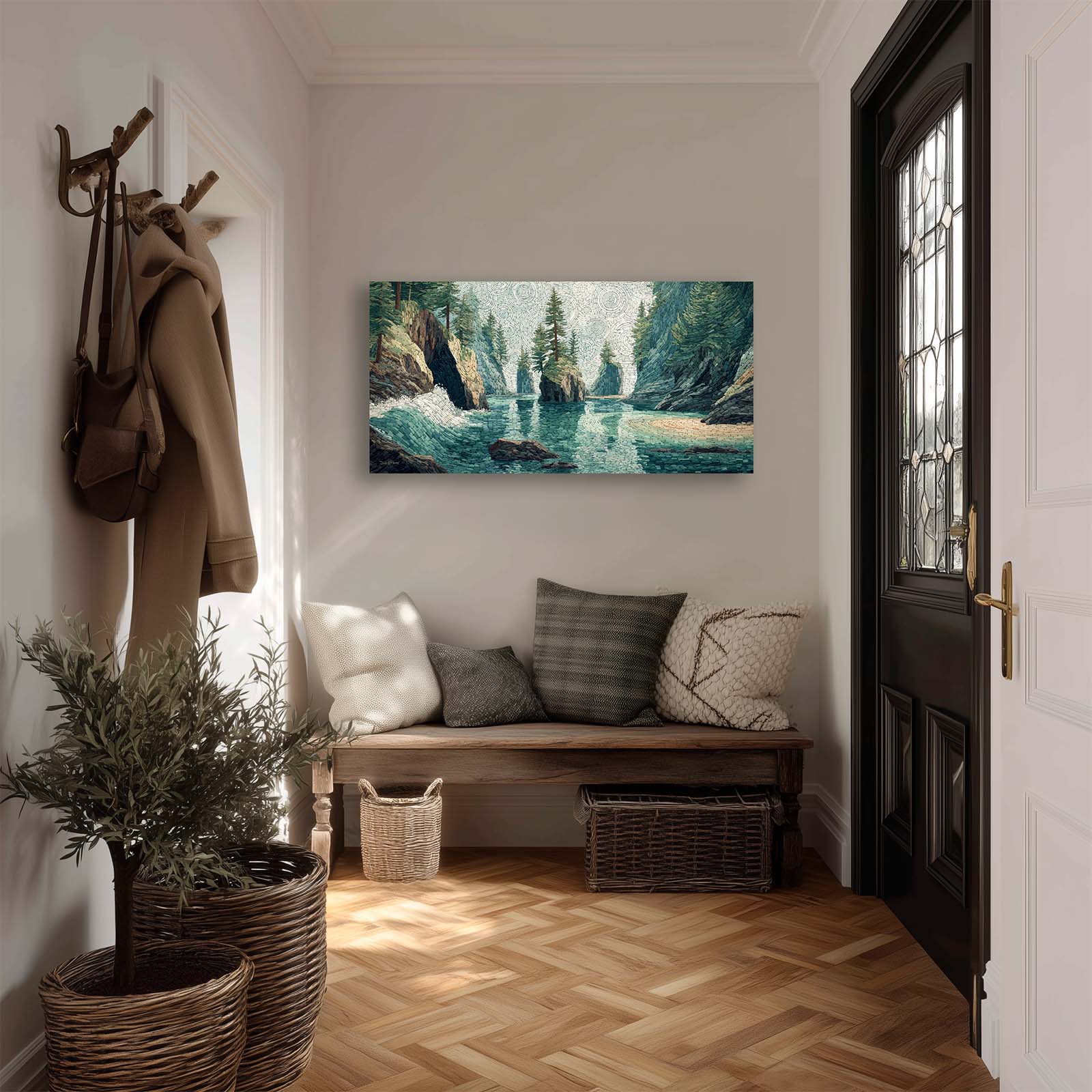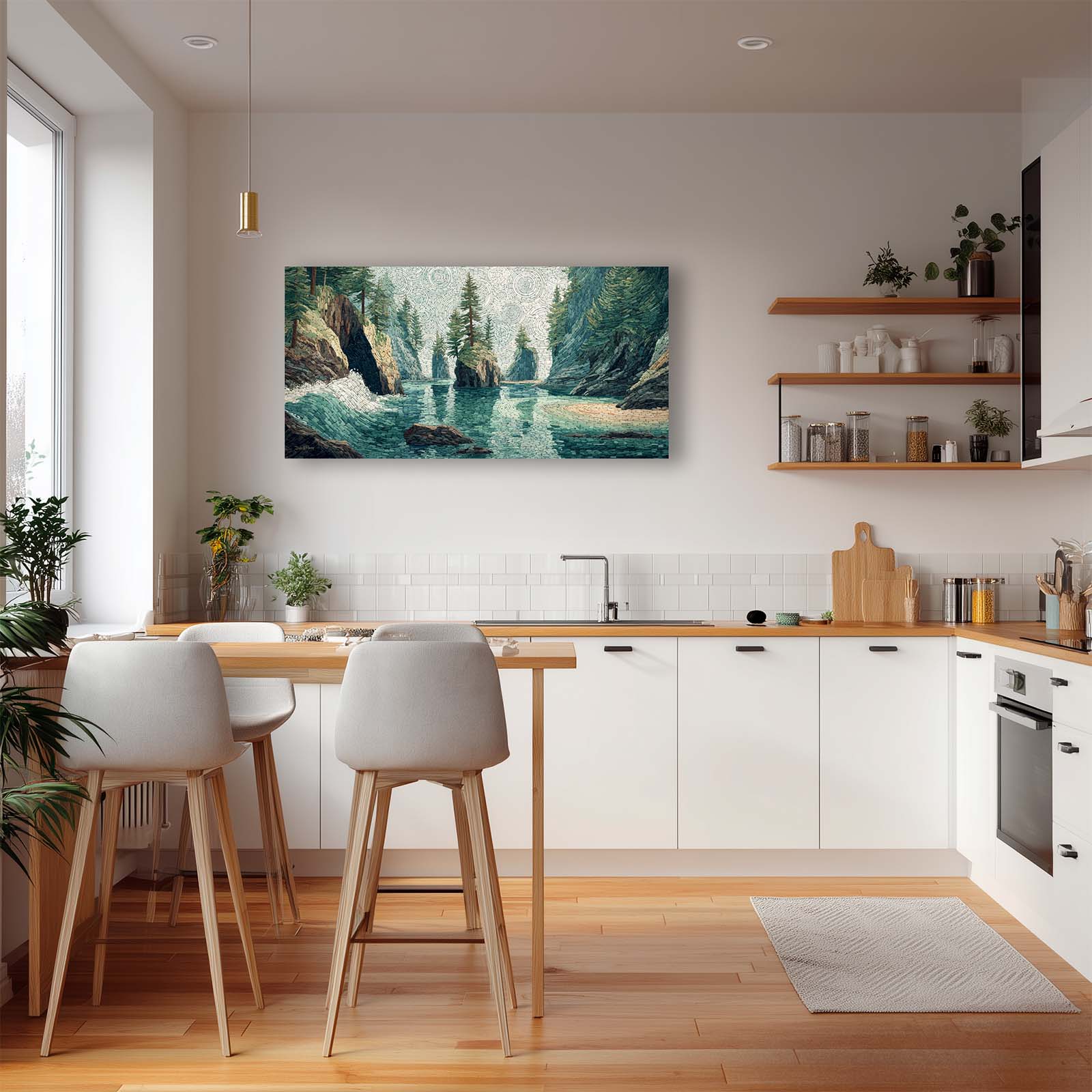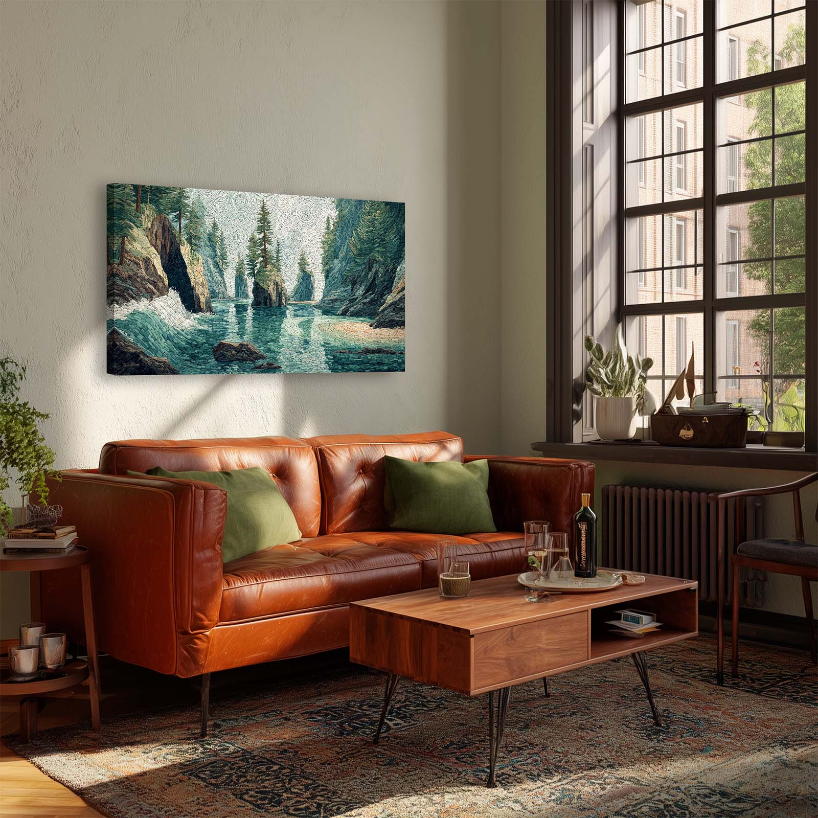 Enhance your space with this giclee canvas print of a small sea stack in a Pacific Northwest coastal inlet, rendered in mosaic style. Its serene beauty complements most rooms, adding natural charm and visual interest to your home or office.