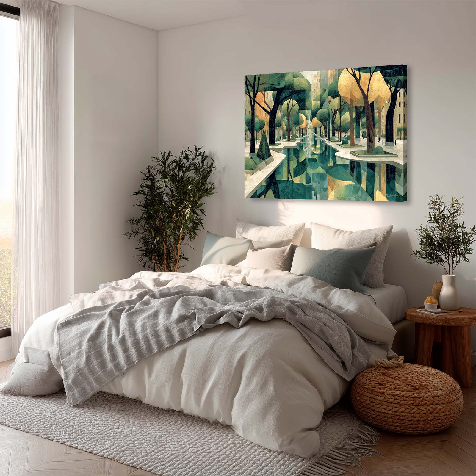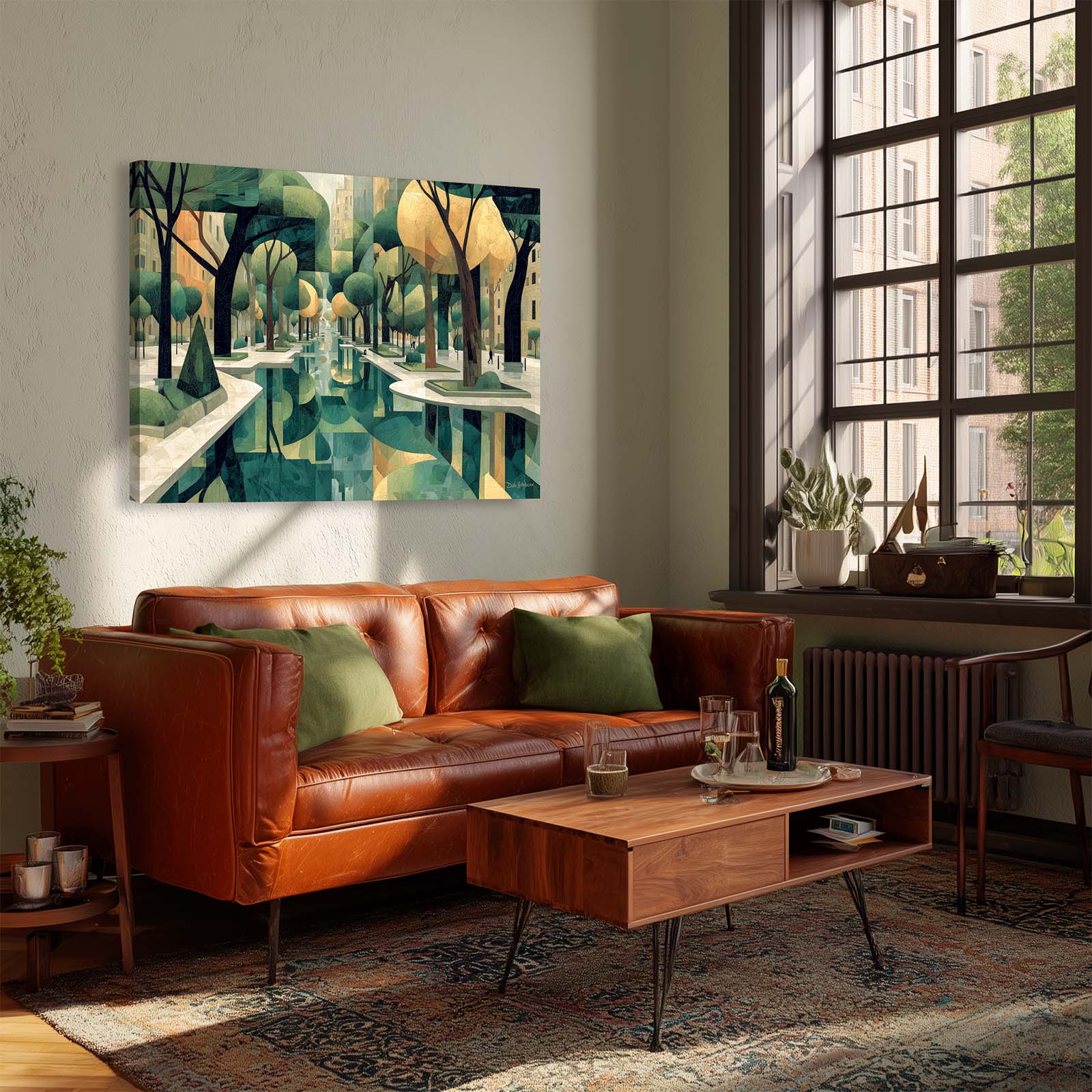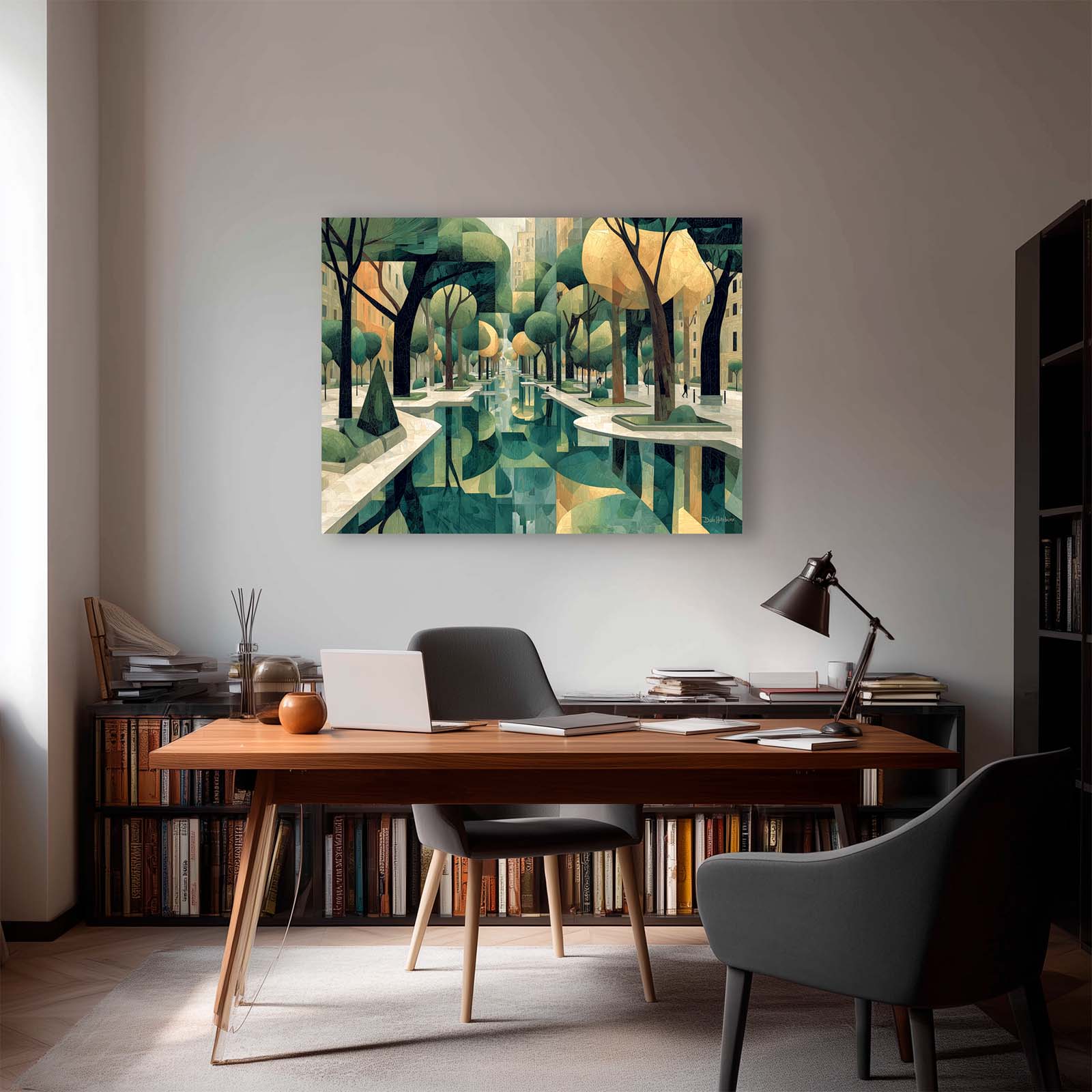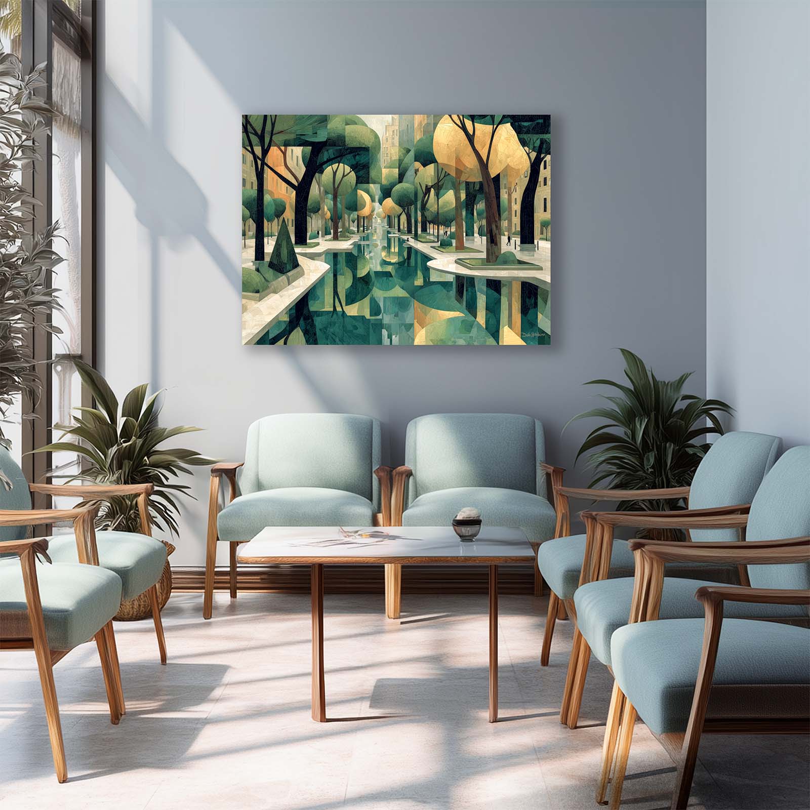Bring the charm of a serene urban park into your space with this impressionistic canvas print. The tranquil pool and lush surroundings can add elegance and calm to a room.