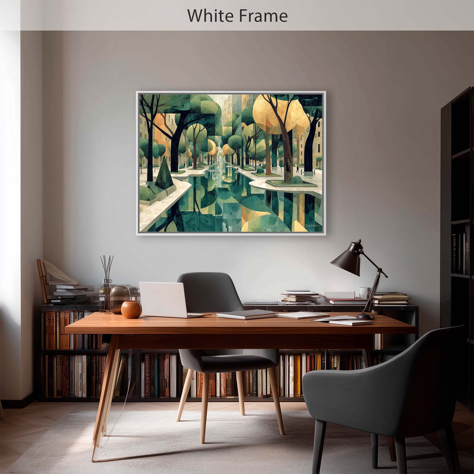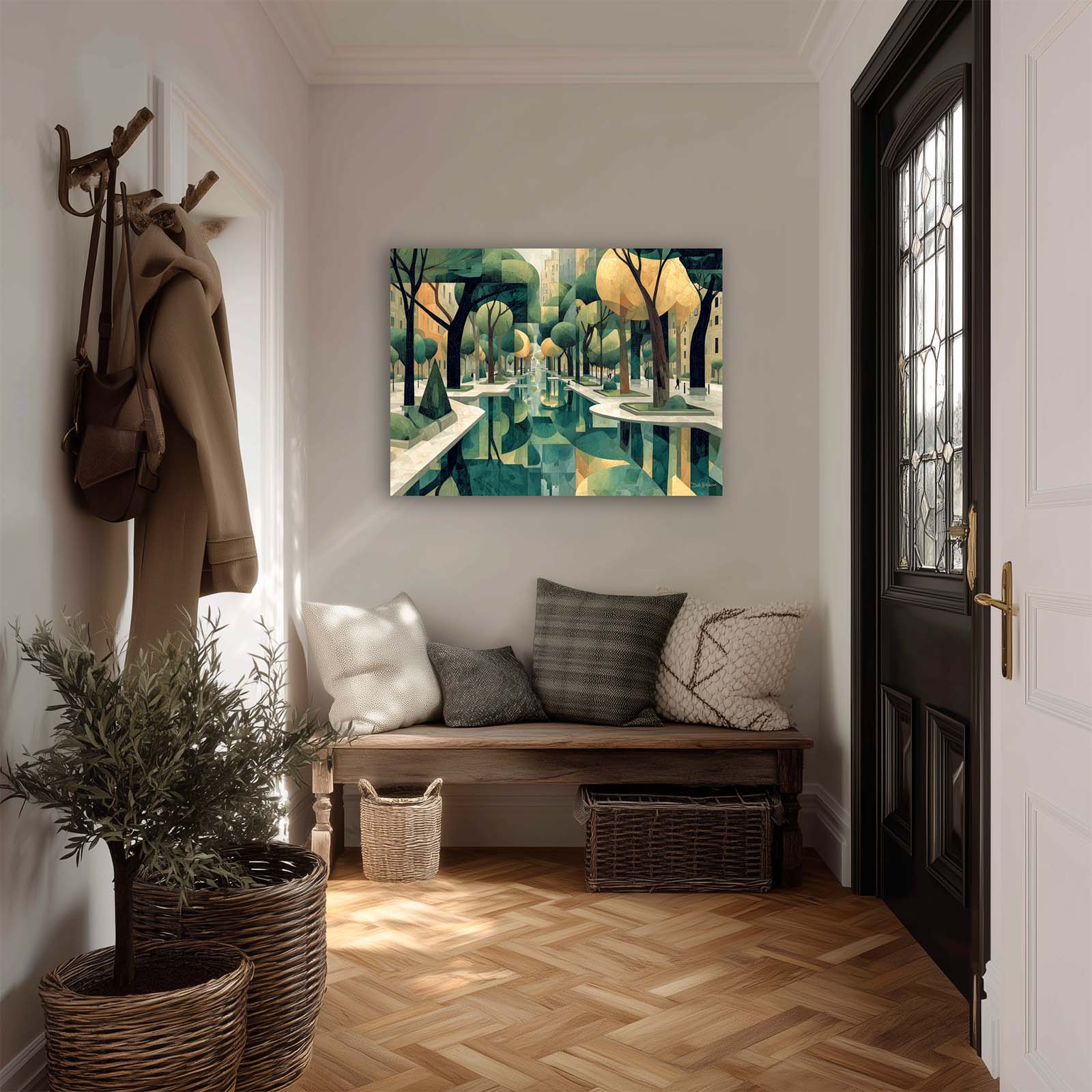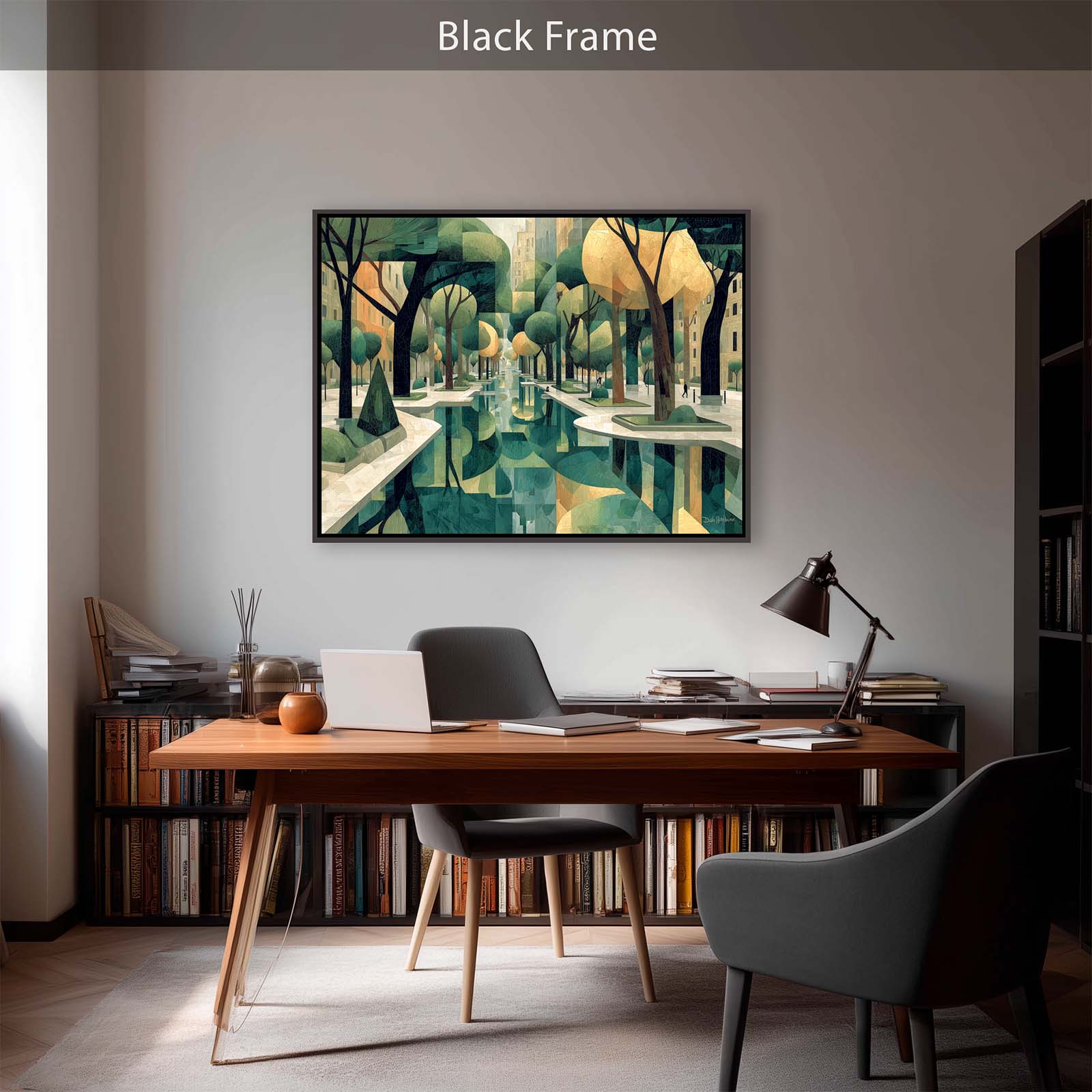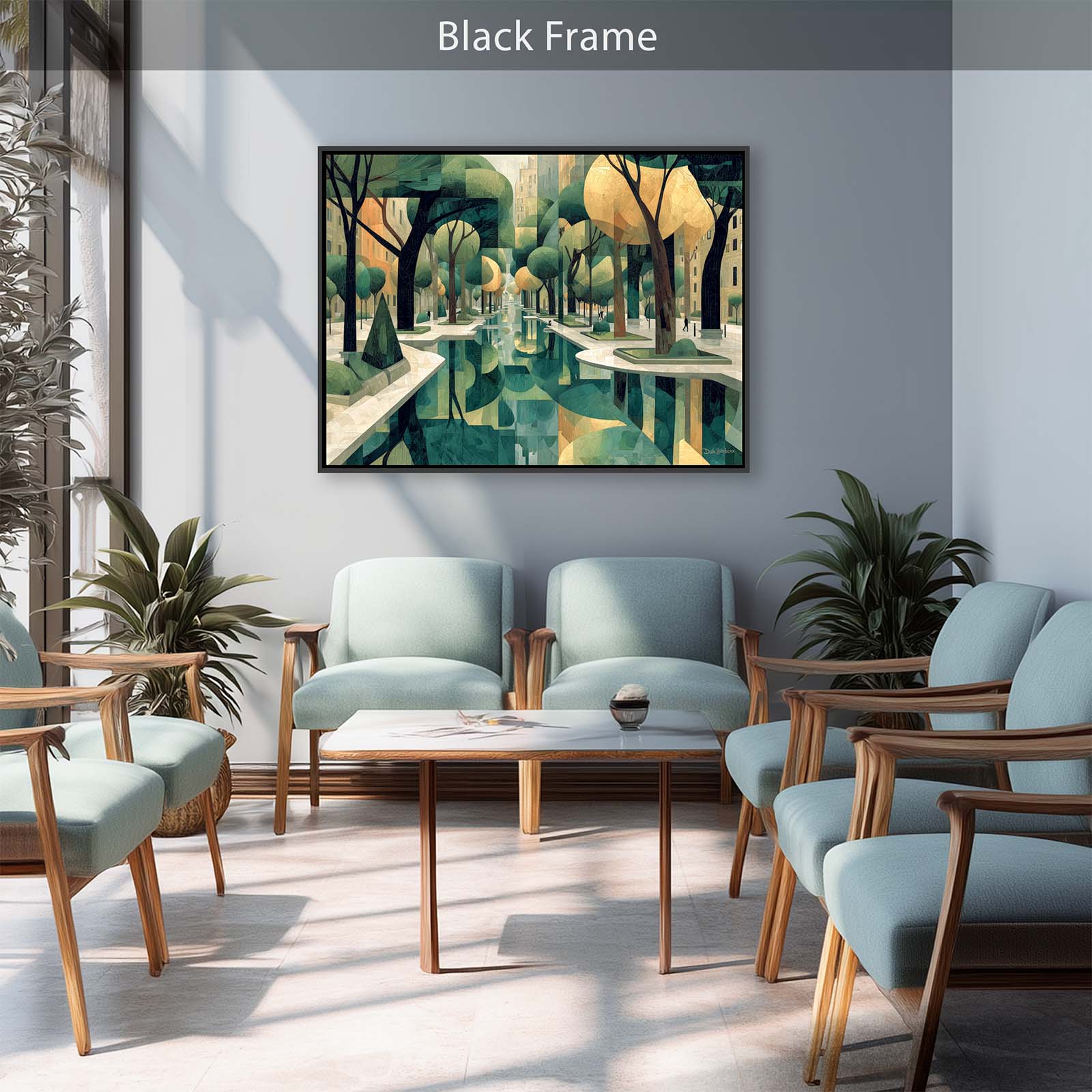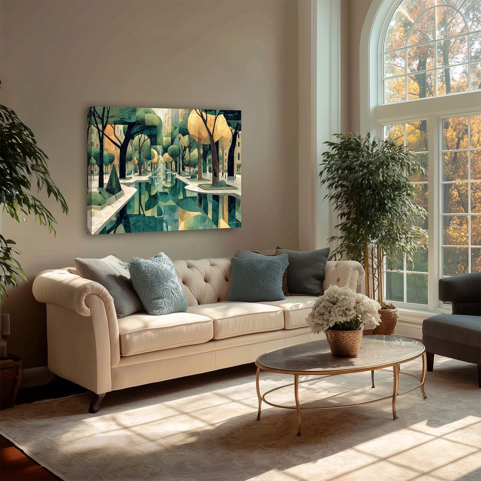 Bring the charm of a serene urban park into your space with this impressionistic canvas print. The tranquil pool and lush surroundings can add elegance and calm to a room.