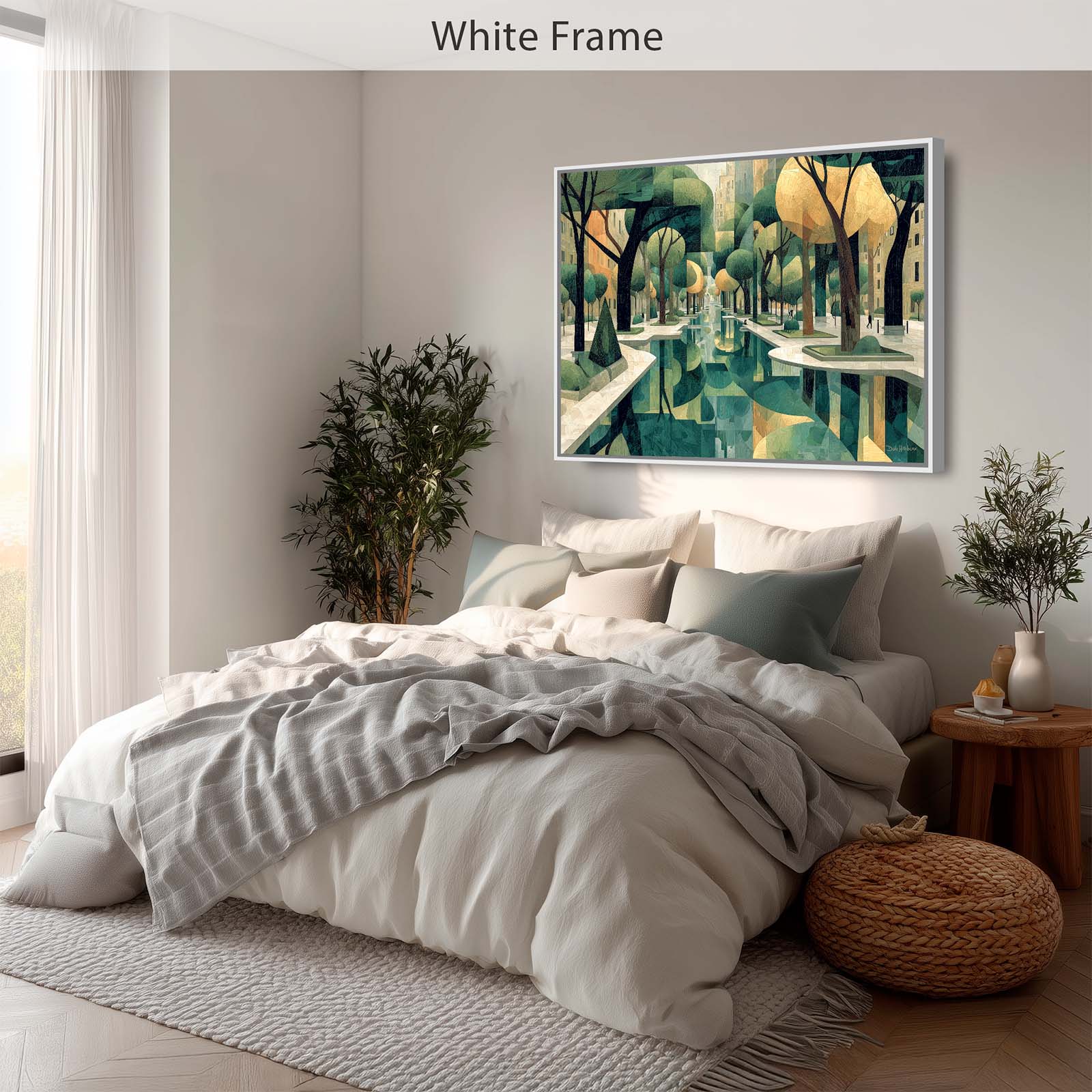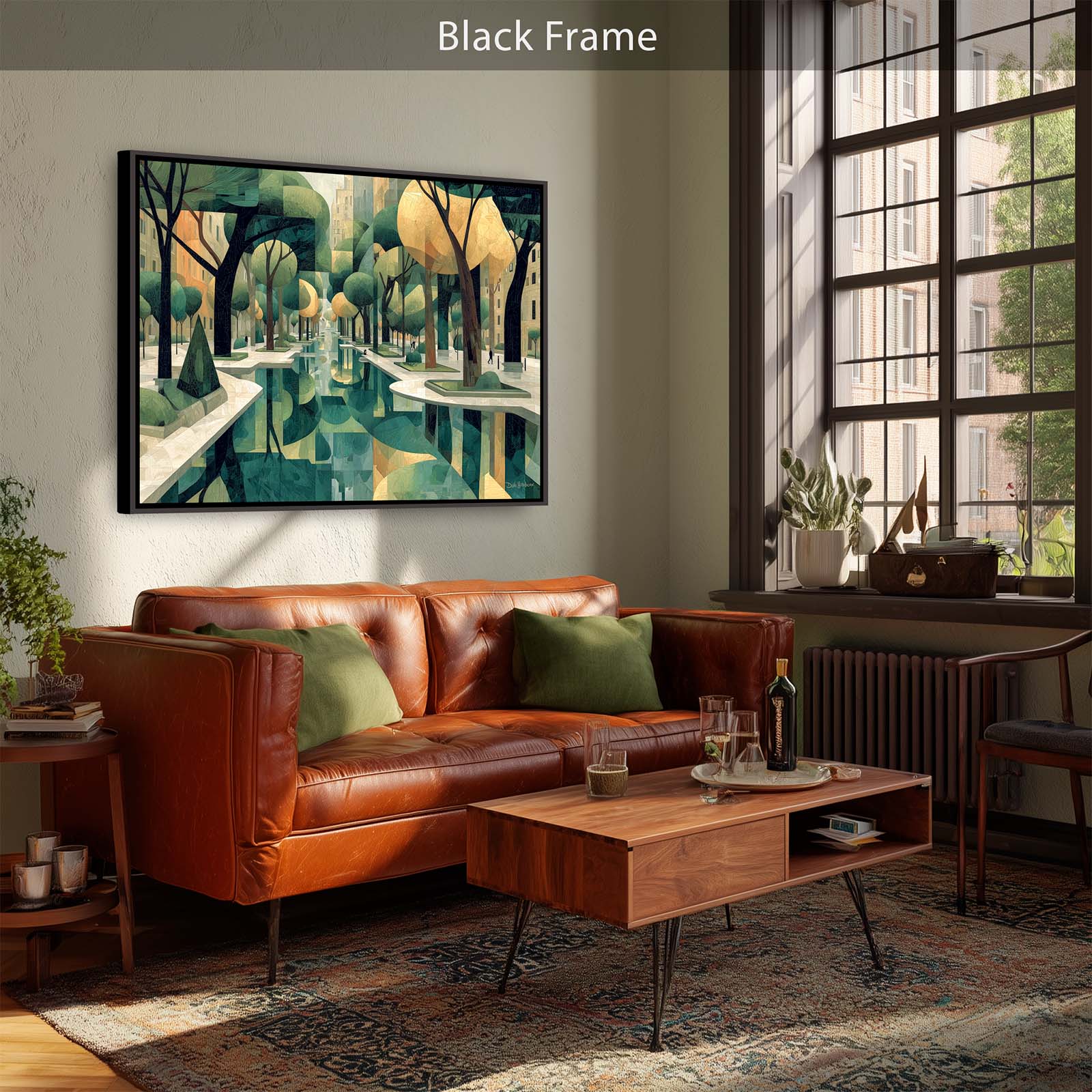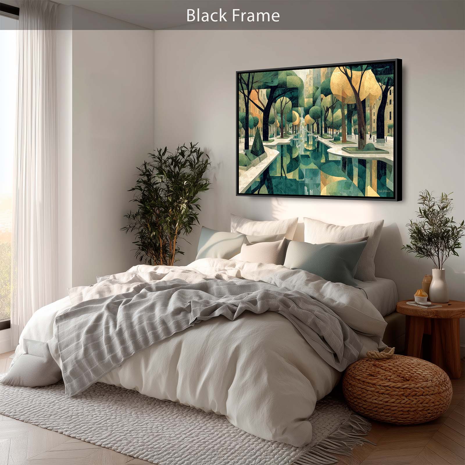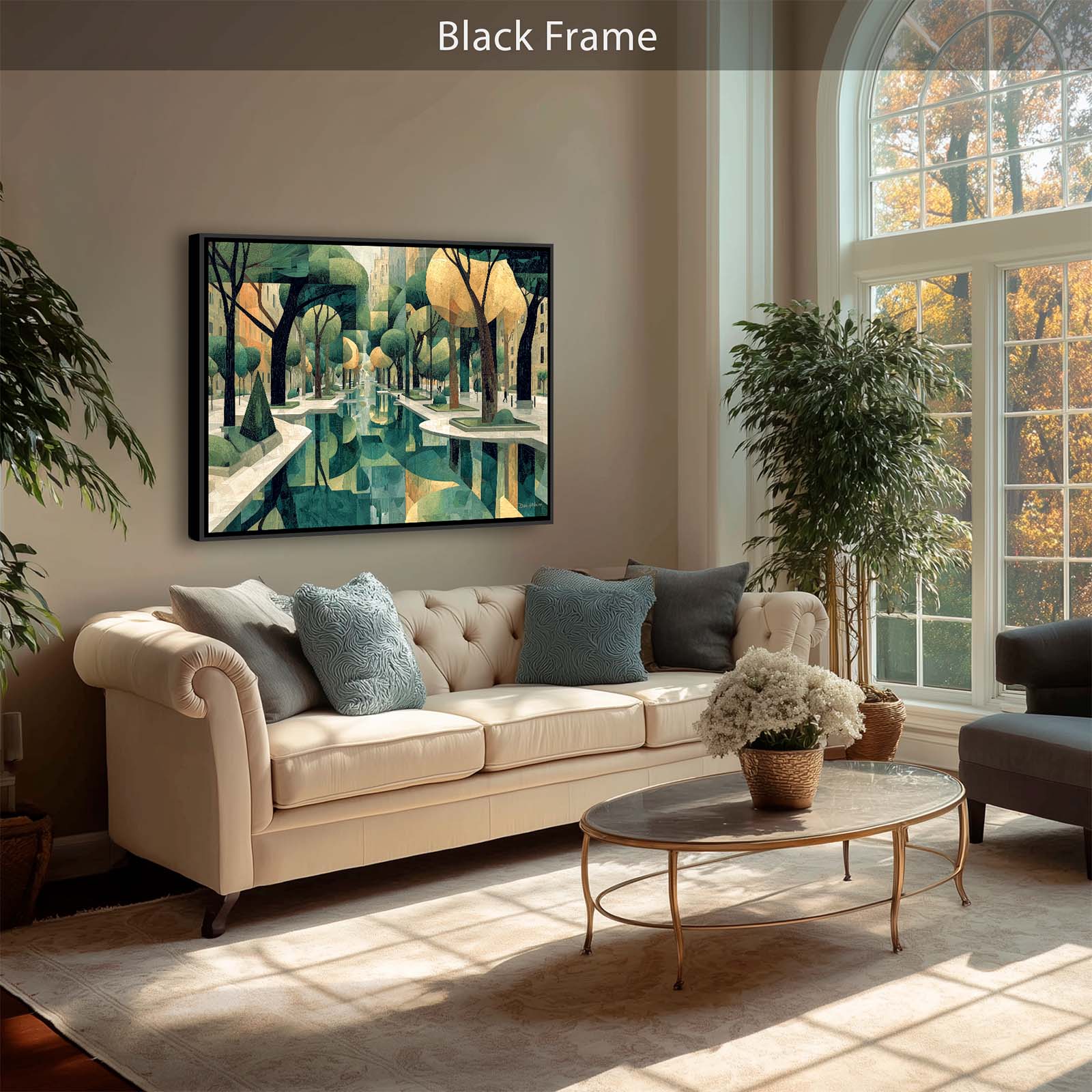 Bring the charm of a serene urban park into your space with this impressionistic canvas print. The tranquil pool and lush surroundings can add elegance and calm to a room.