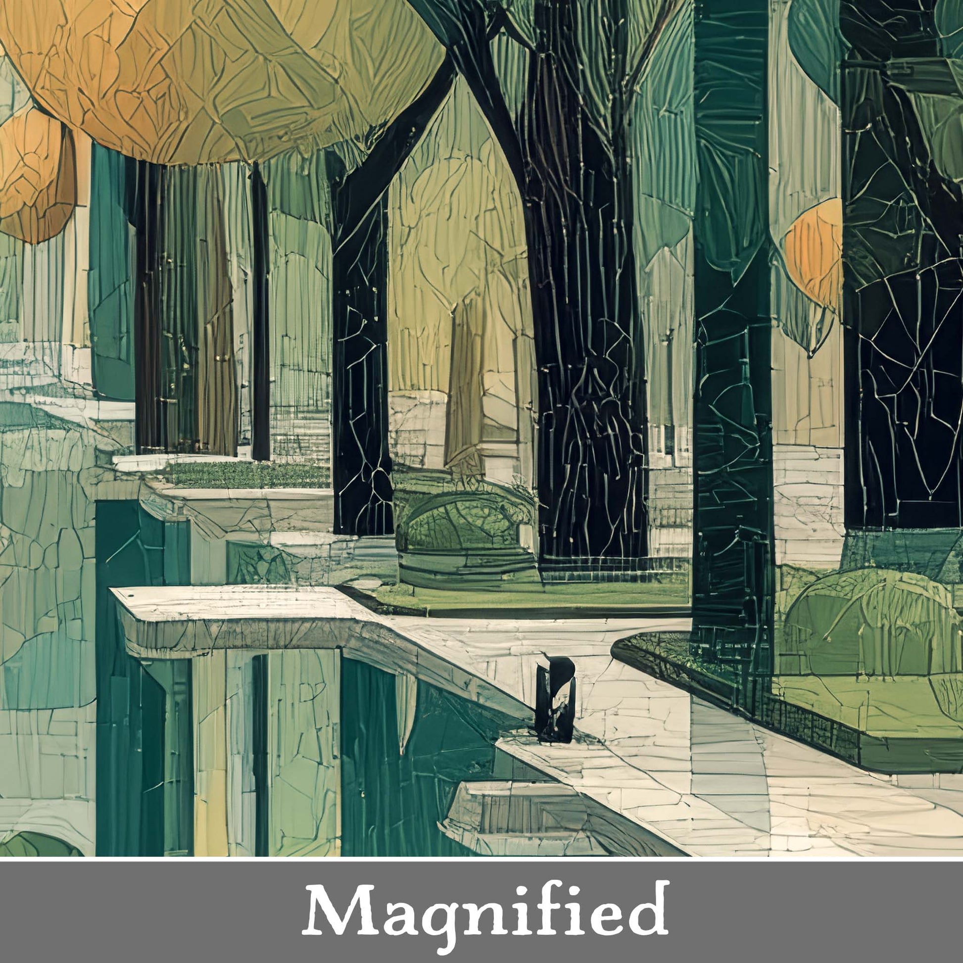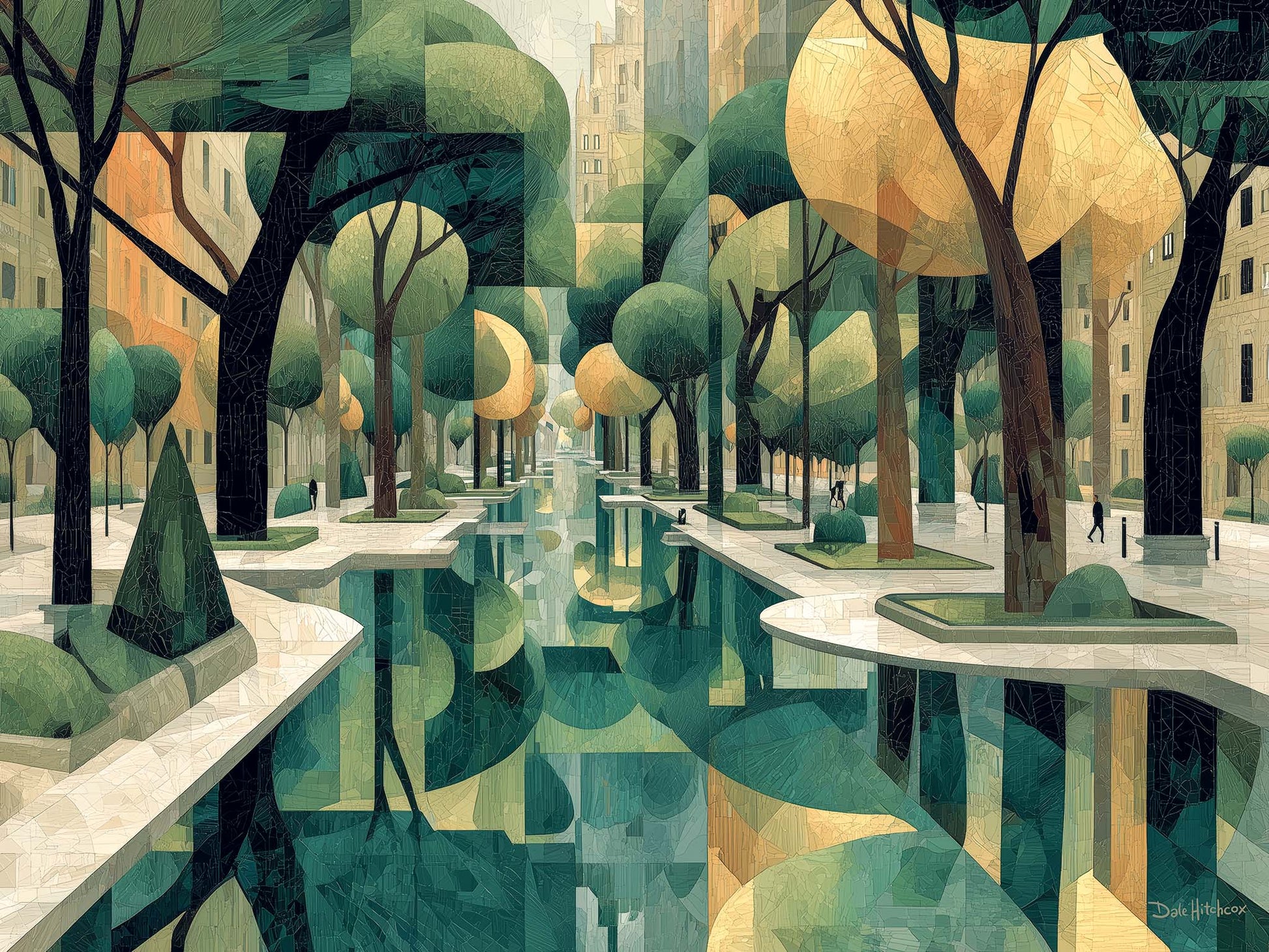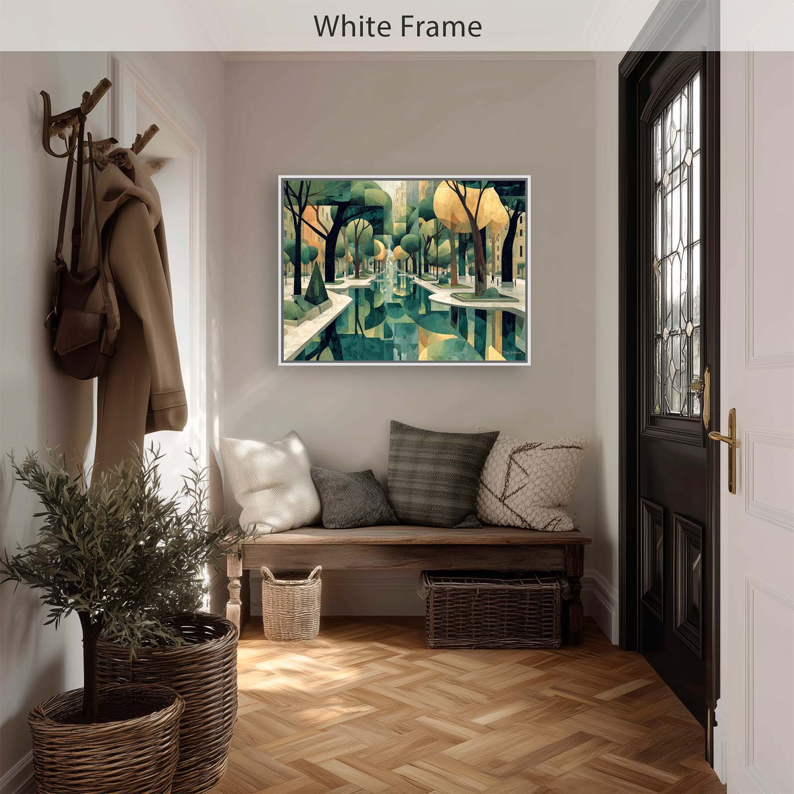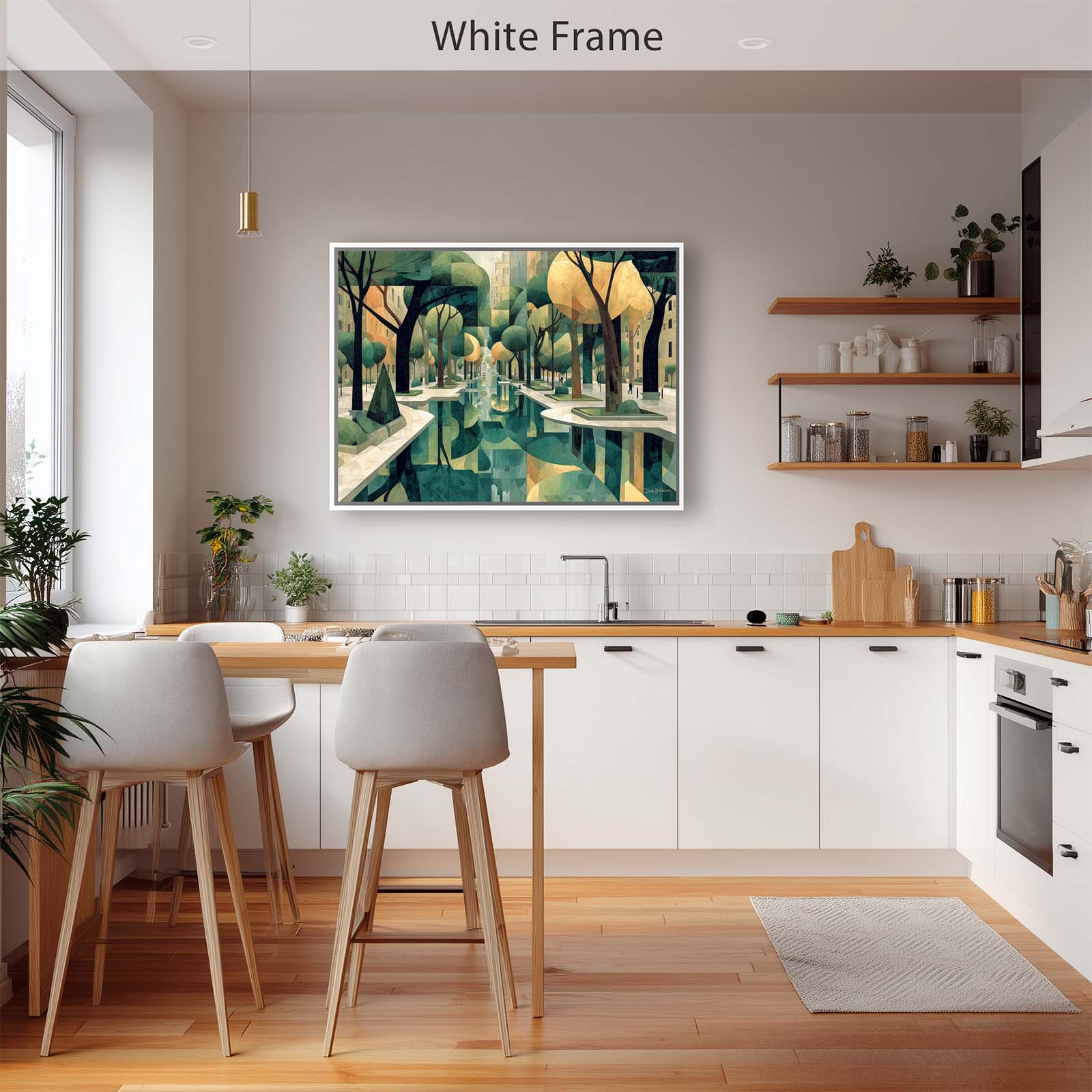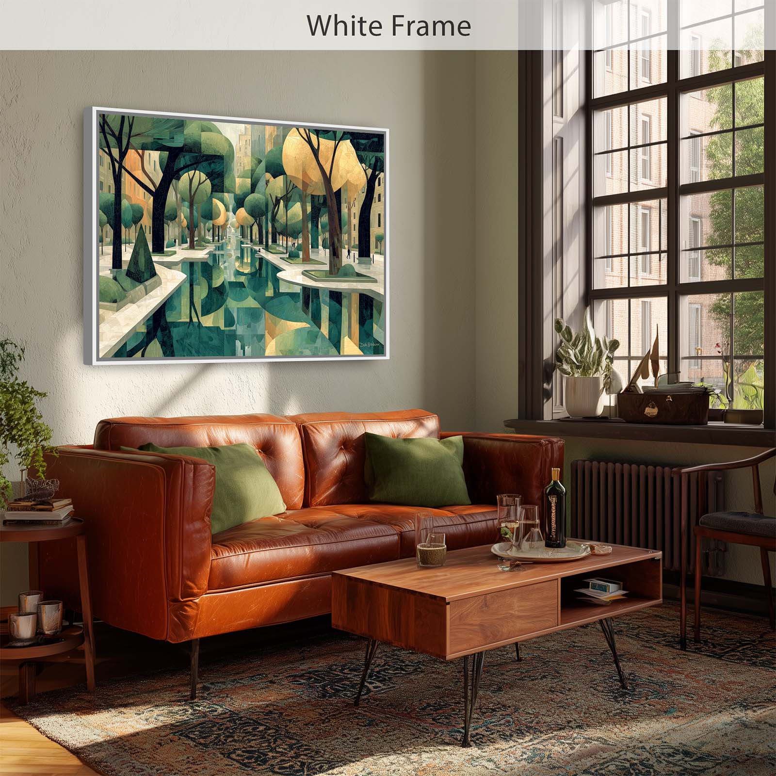 Bring the charm of a serene urban park into your space with this impressionistic canvas print. The tranquil pool and lush surroundings can add elegance and calm to a room.