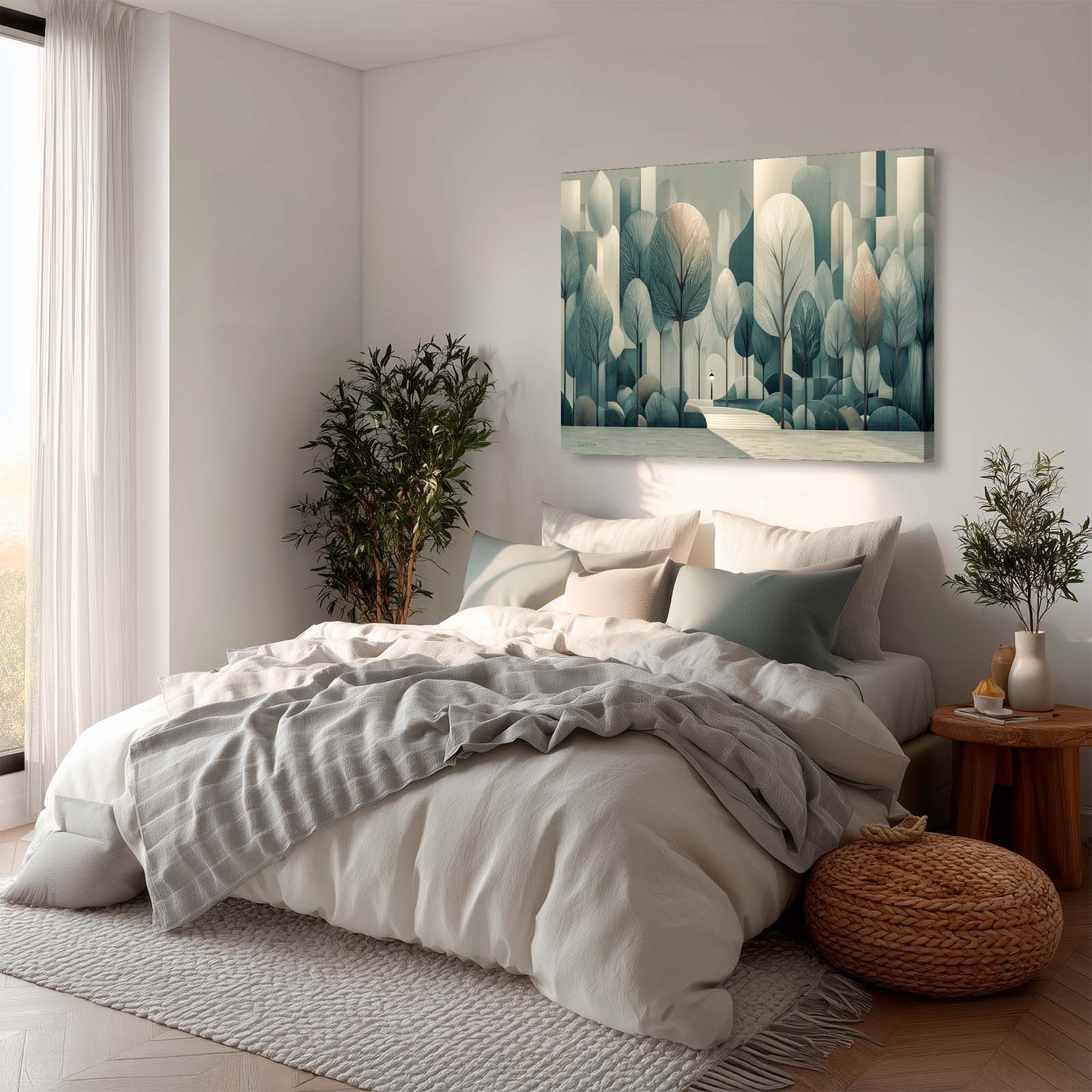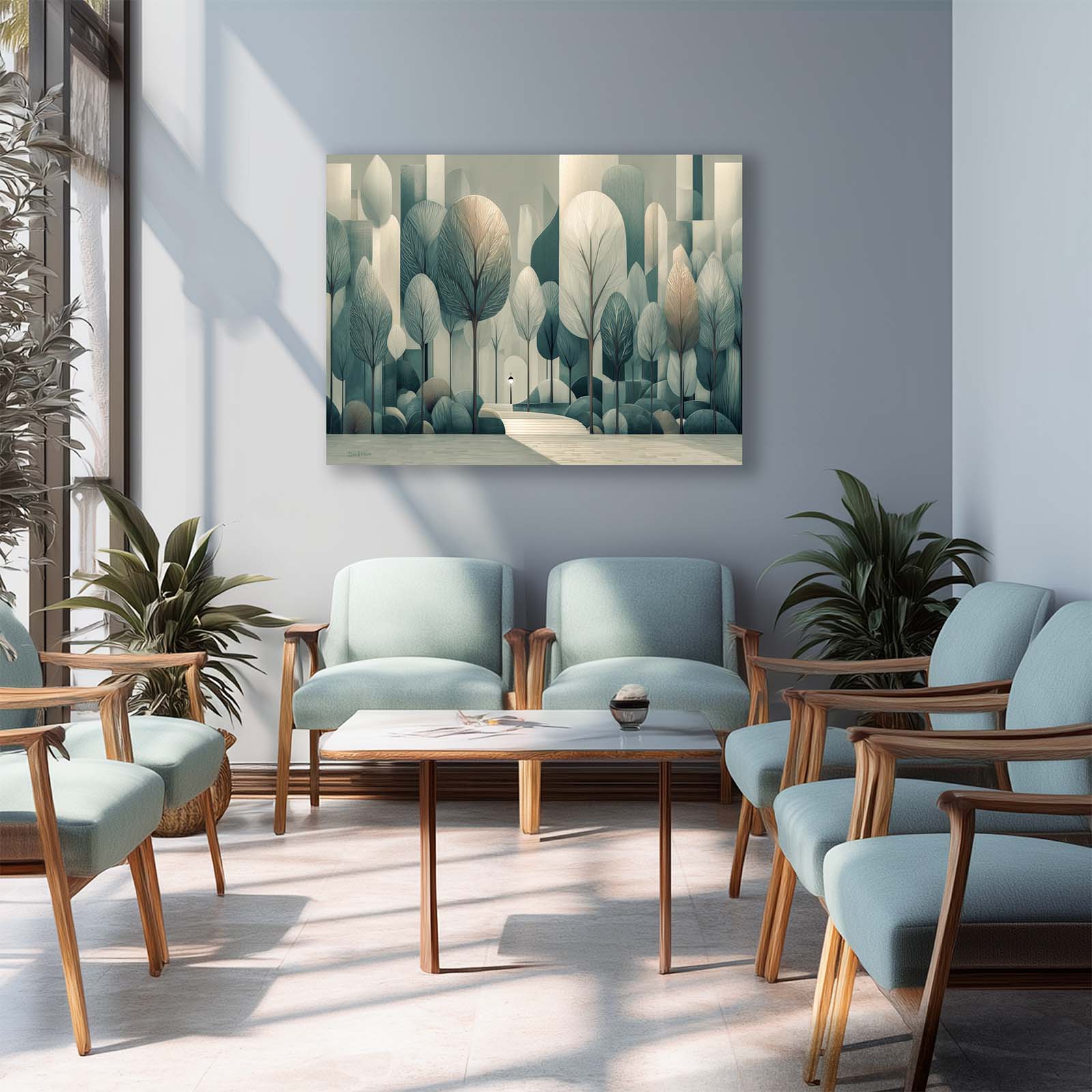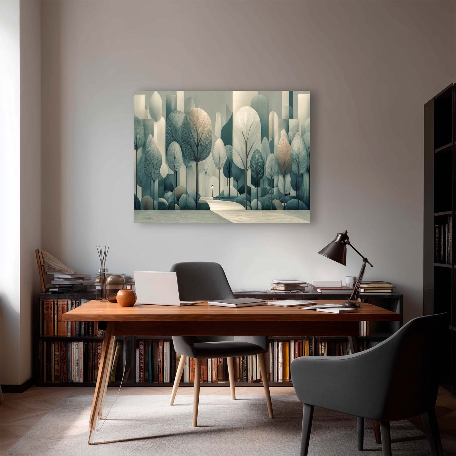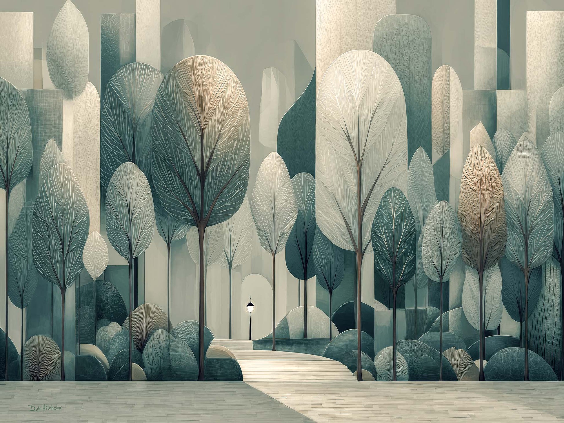 Step into serenity with this semi-cubist canvas print, capturing silvery trees and city steps in a subtle, enchanting scene. Perfect for adding refined beauty to a room.