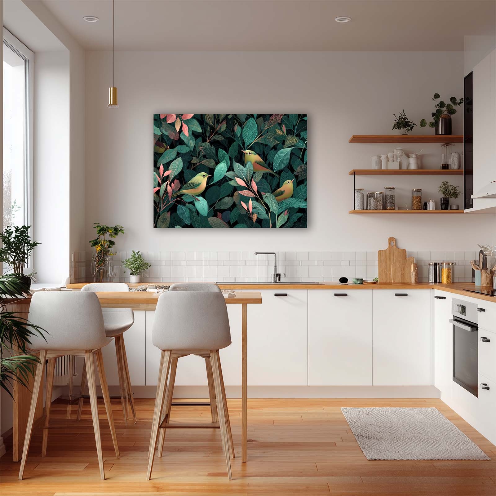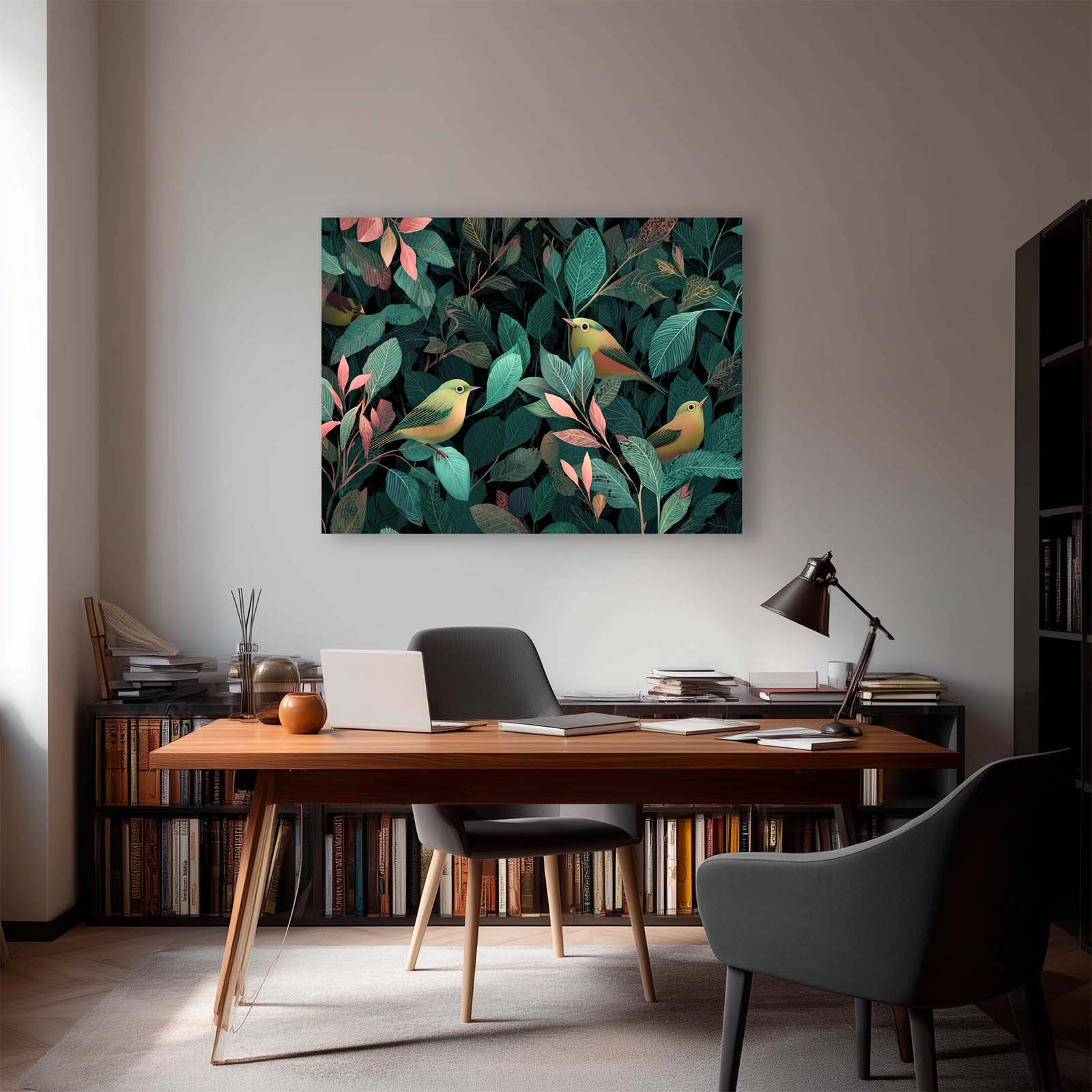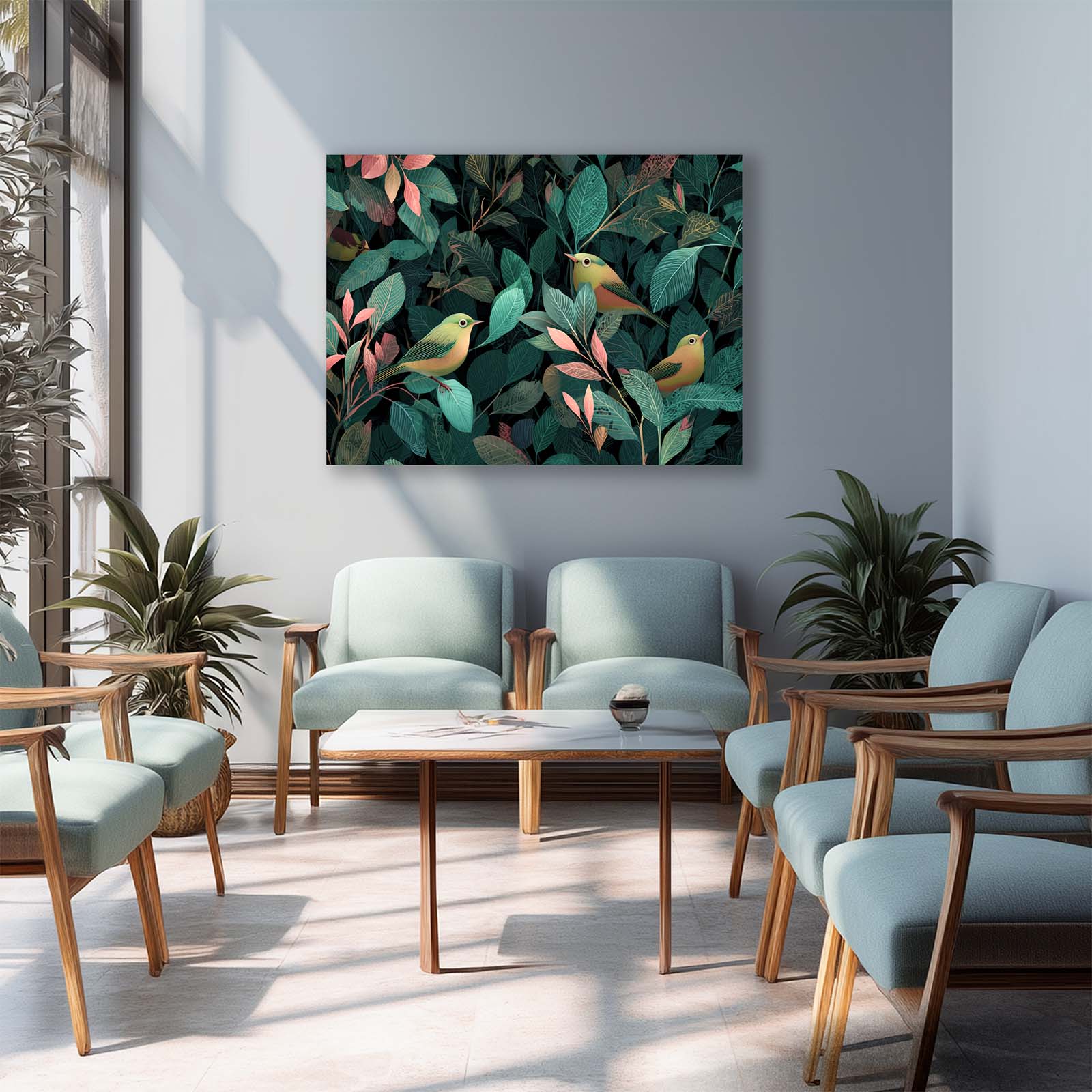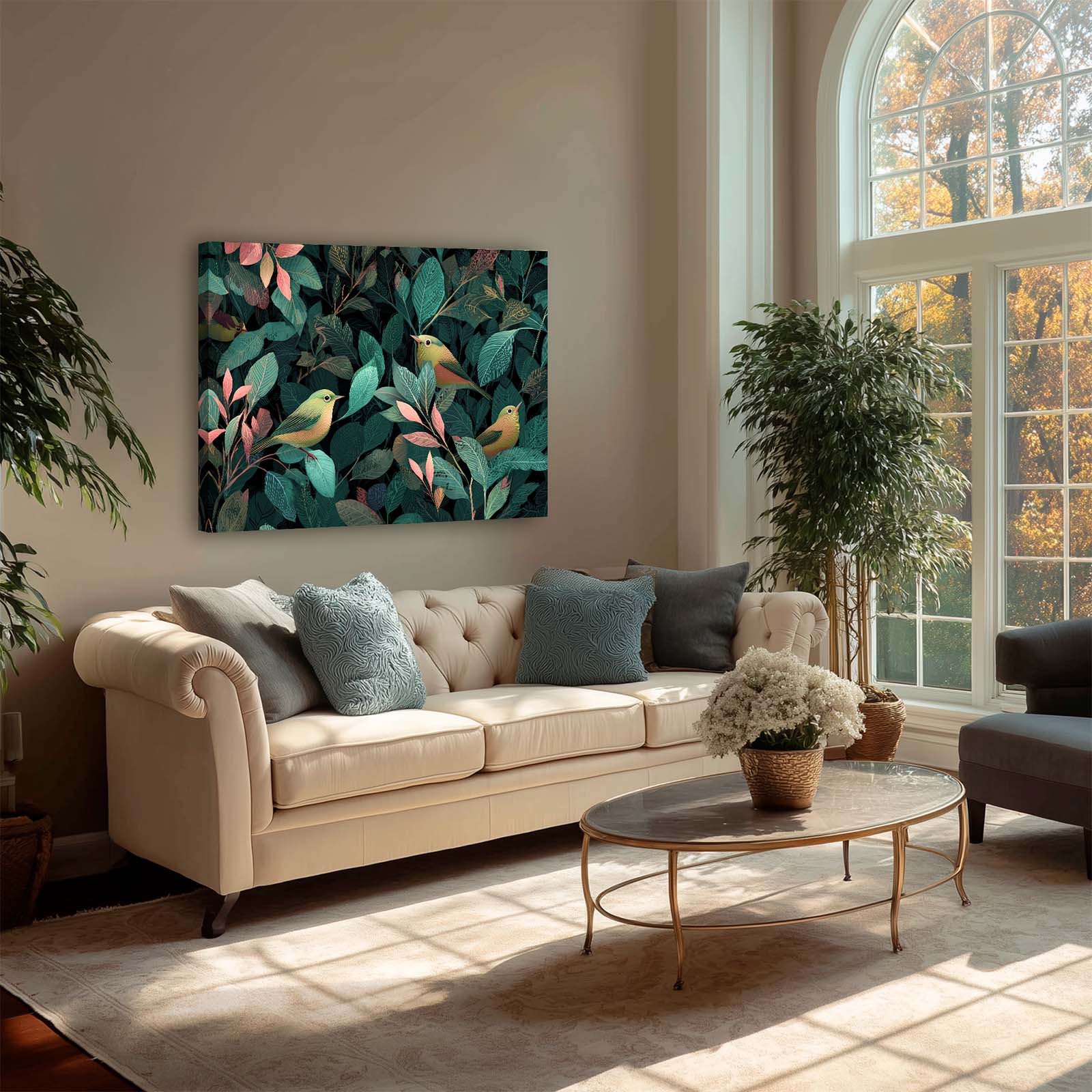 Delight in the charm of nature with this whimsical canvas print featuring three playful birds nestled in lush tree foliage. Its joyful colors and lighthearted style bring warmth, personality, and a touch of enchantment to any room, perfectly complementing a variety of decor styles. Printed on premium giclée canvas, it’s a timeless piece that brightens your home or office