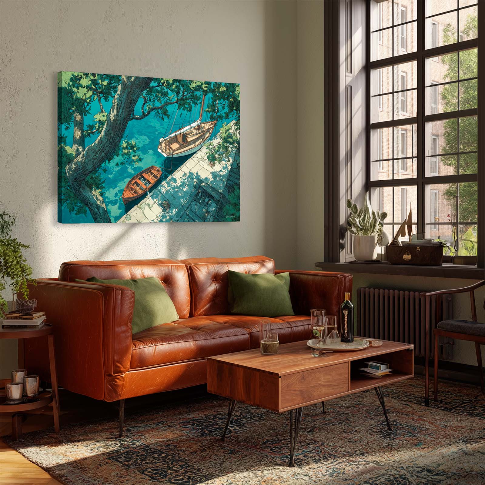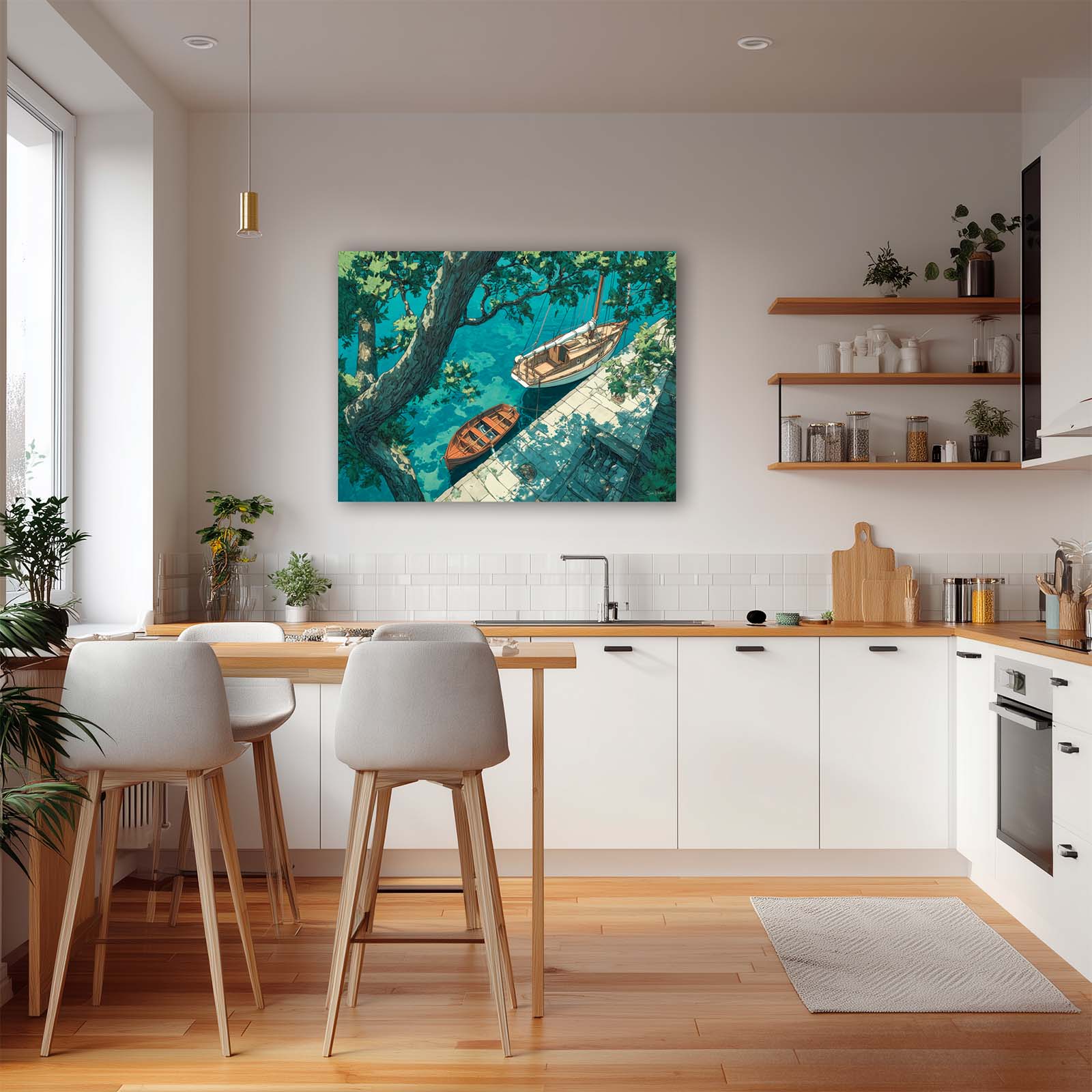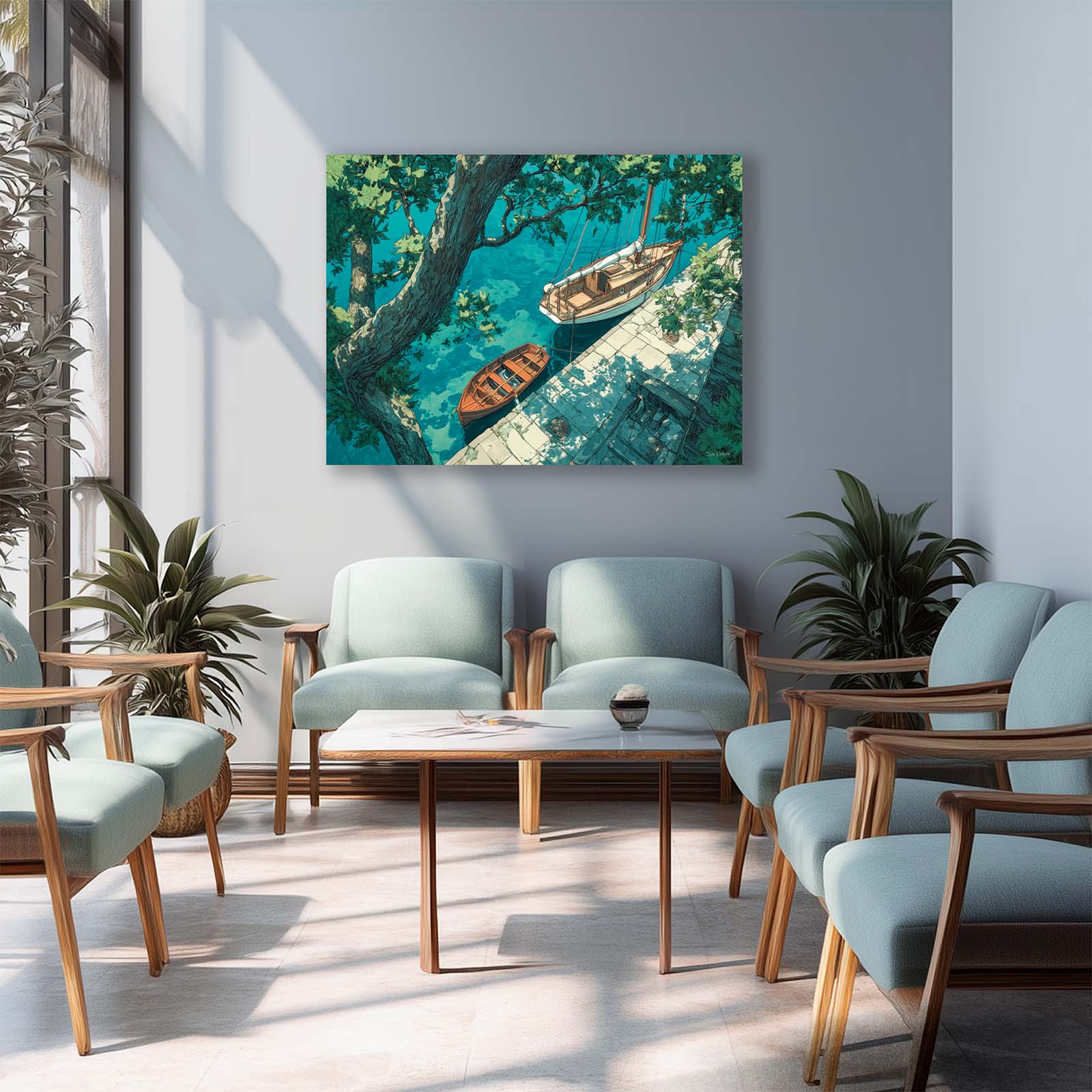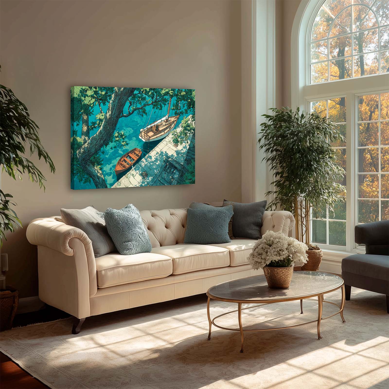 Bask in the tranquil glow of summer with Two Boats, a serene aerial view of a sailboat and rowboat resting gently at a sun-dappled dock. Shaded by leafy trees and rendered in soft aquas and greens, this peaceful scene brings a sense of light, calm and natural rhythm into any space.
