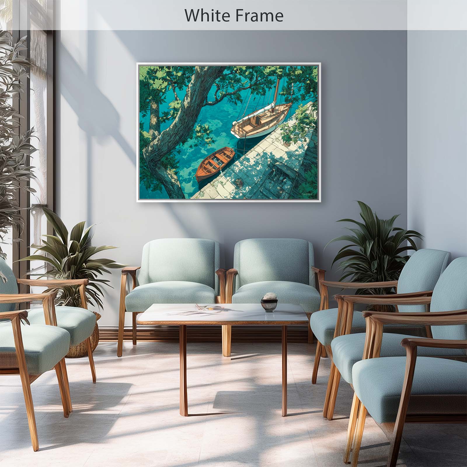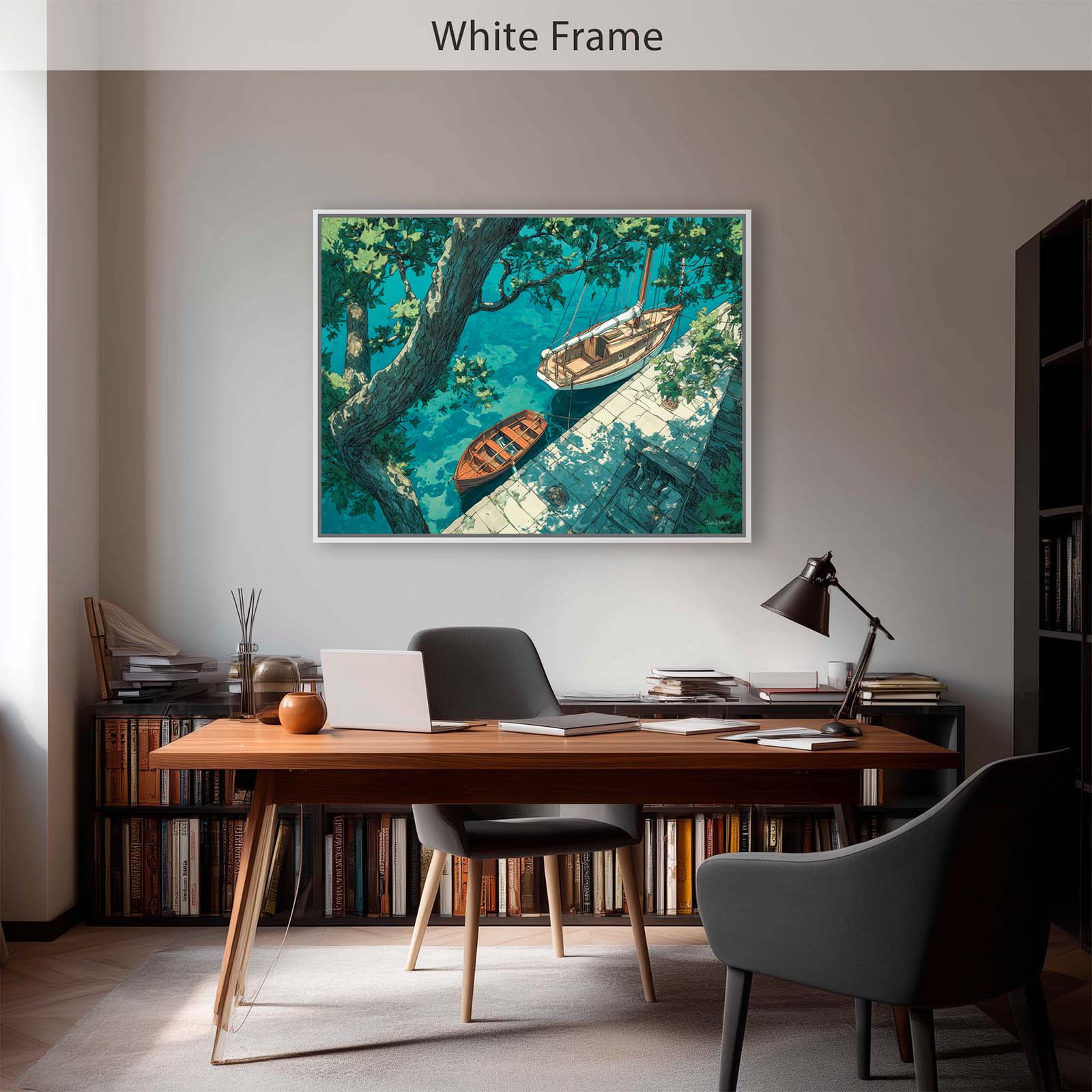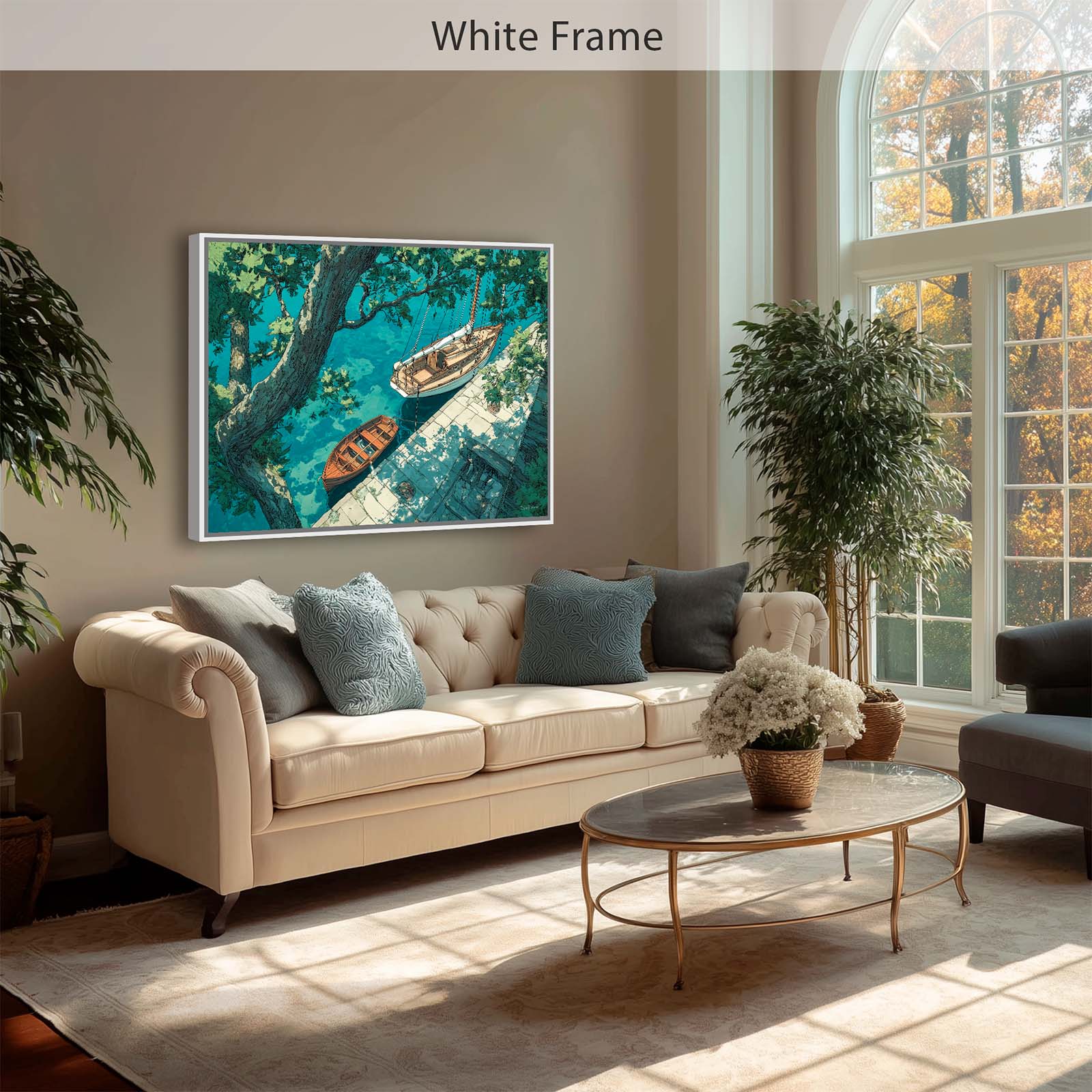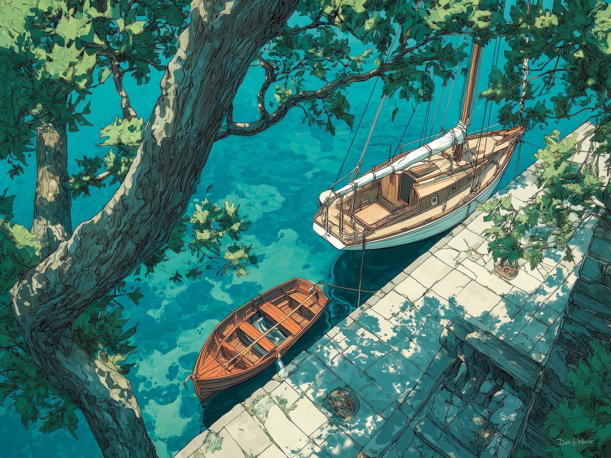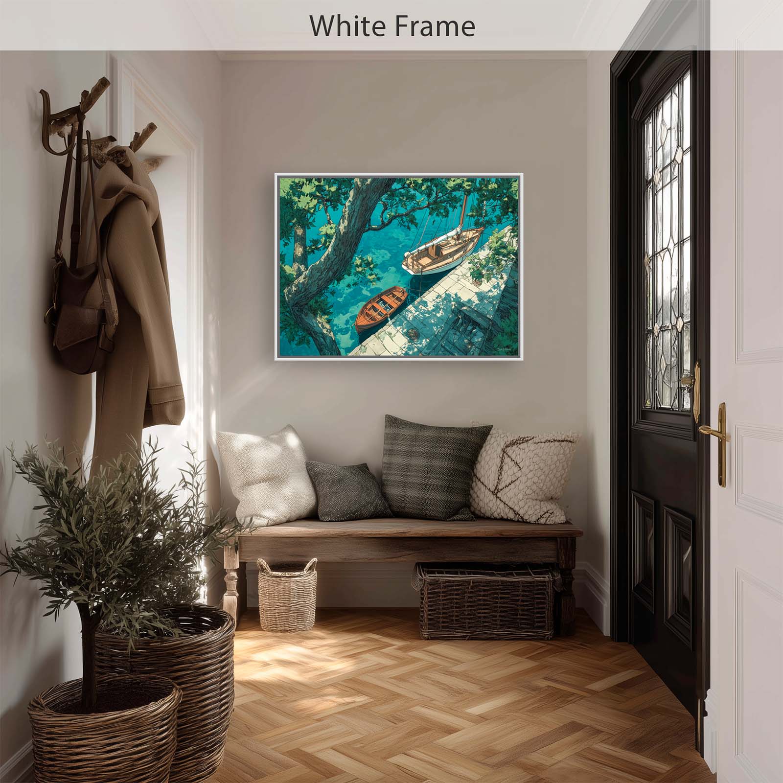 Bask in the tranquil glow of summer with Two Boats, a serene aerial view of a sailboat and rowboat resting gently at a sun-dappled dock. Shaded by leafy trees and rendered in soft aquas and greens, this peaceful scene brings a sense of light, calm and natural rhythm into any space.