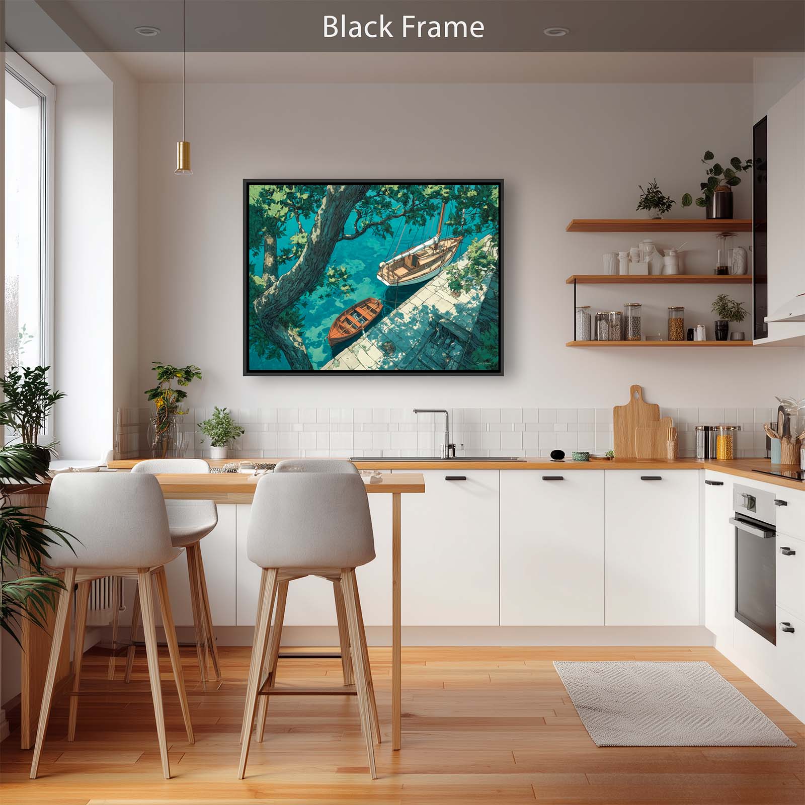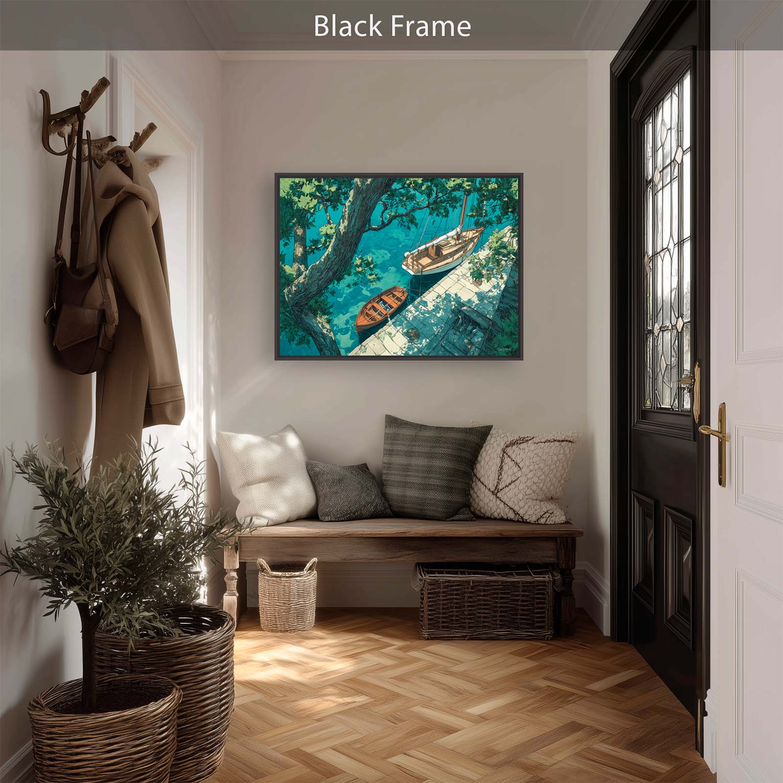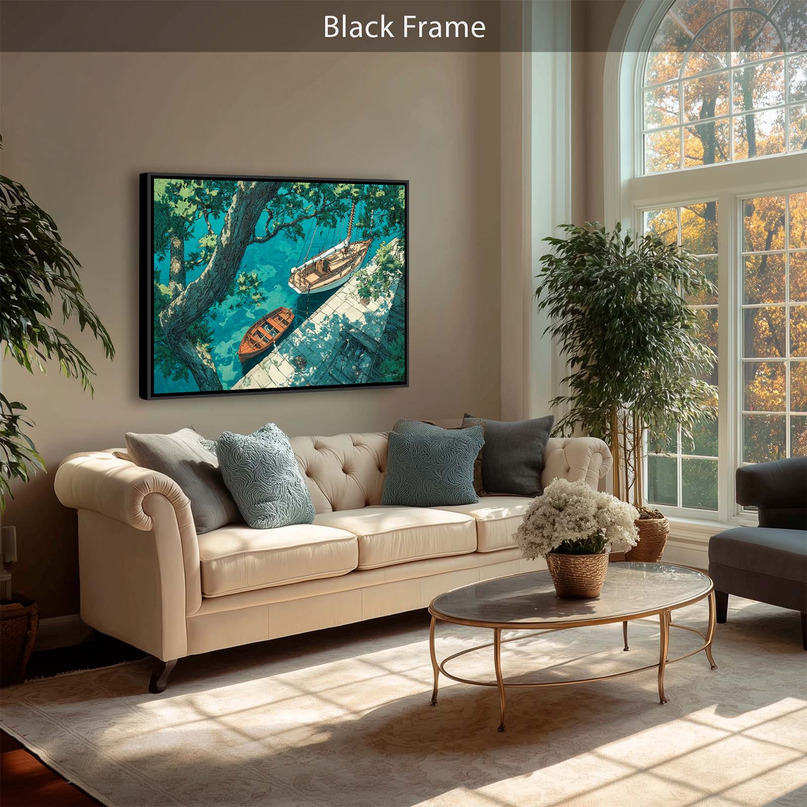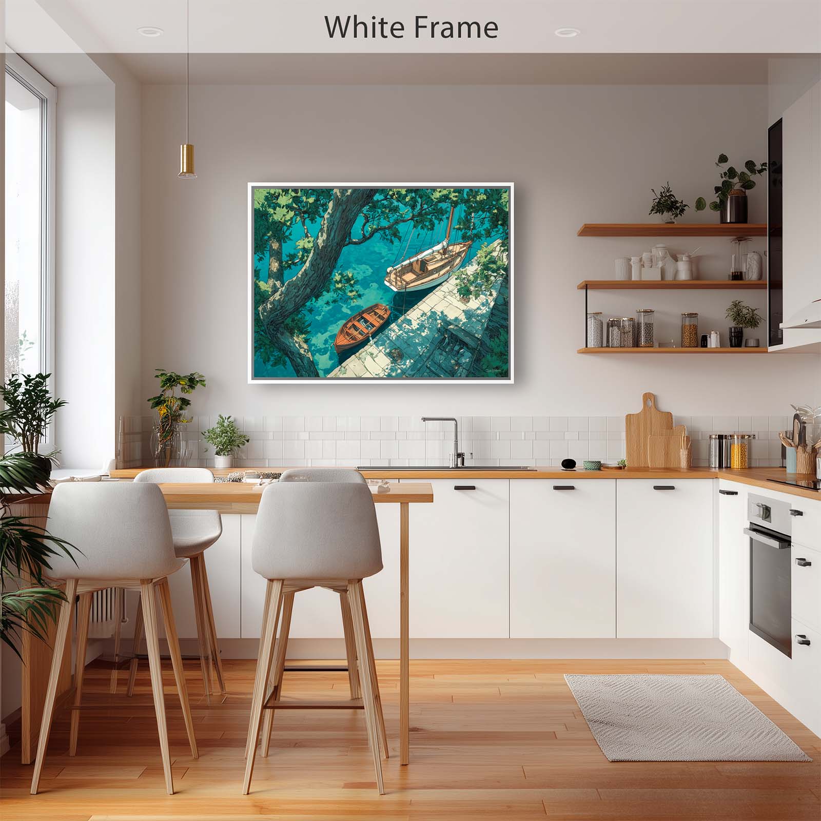 Bask in the tranquil glow of summer with Two Boats, a serene aerial view of a sailboat and rowboat resting gently at a sun-dappled dock. Shaded by leafy trees and rendered in soft aquas and greens, this peaceful scene brings a sense of light, calm and natural rhythm into any space.