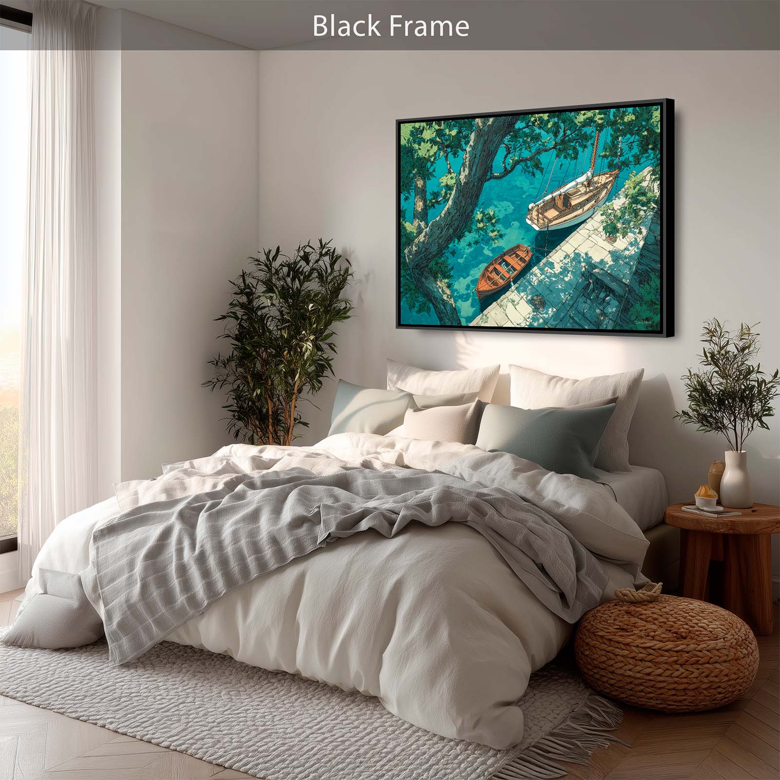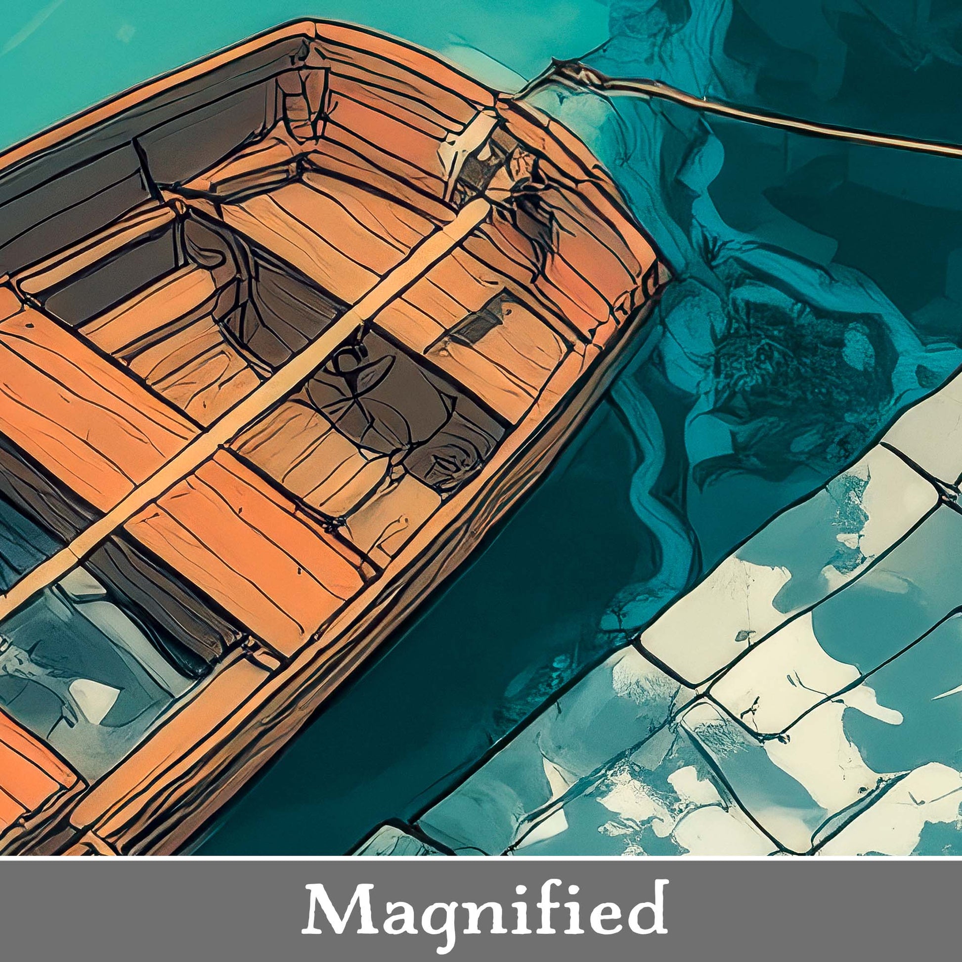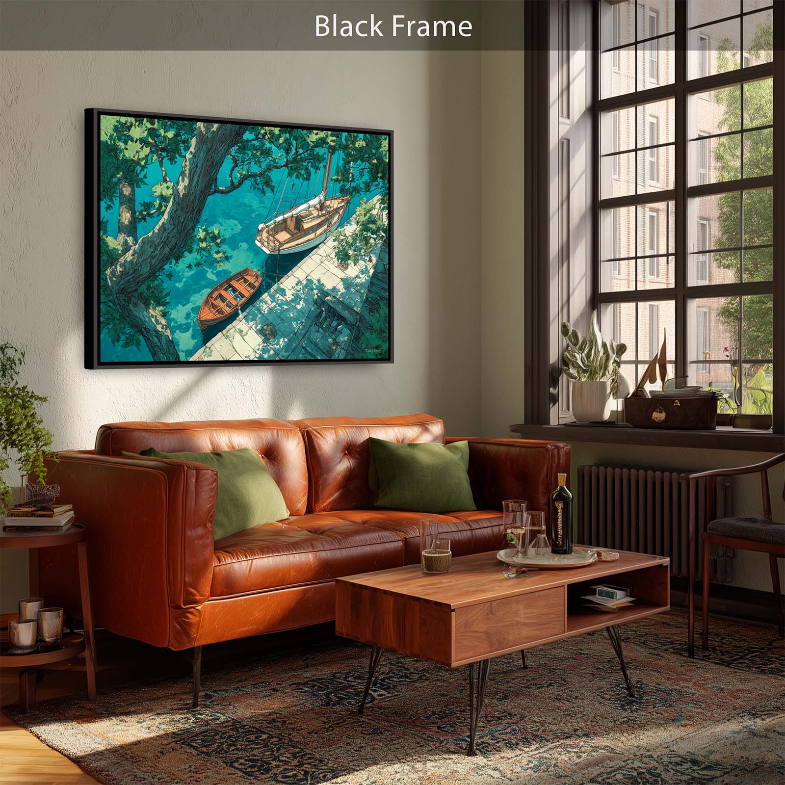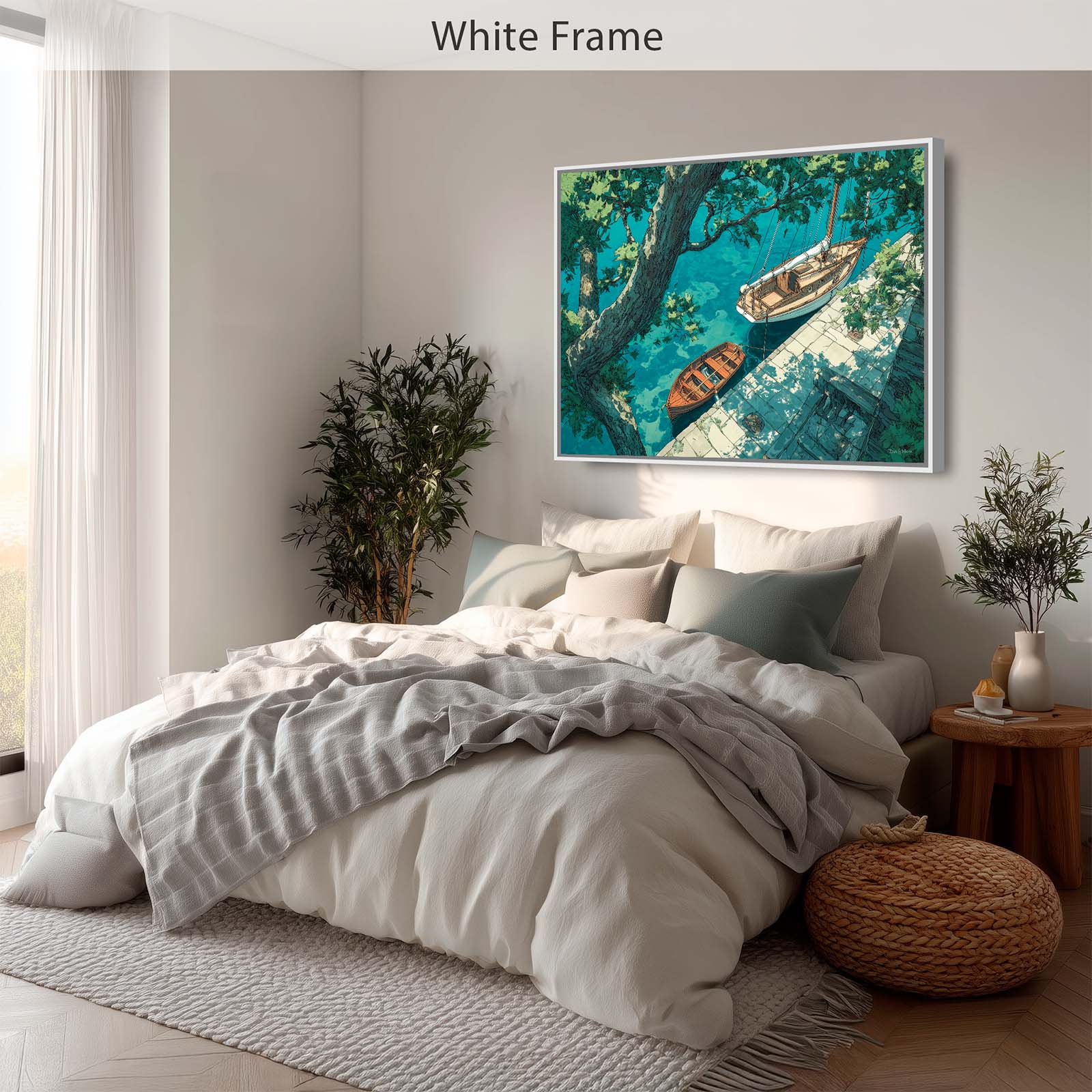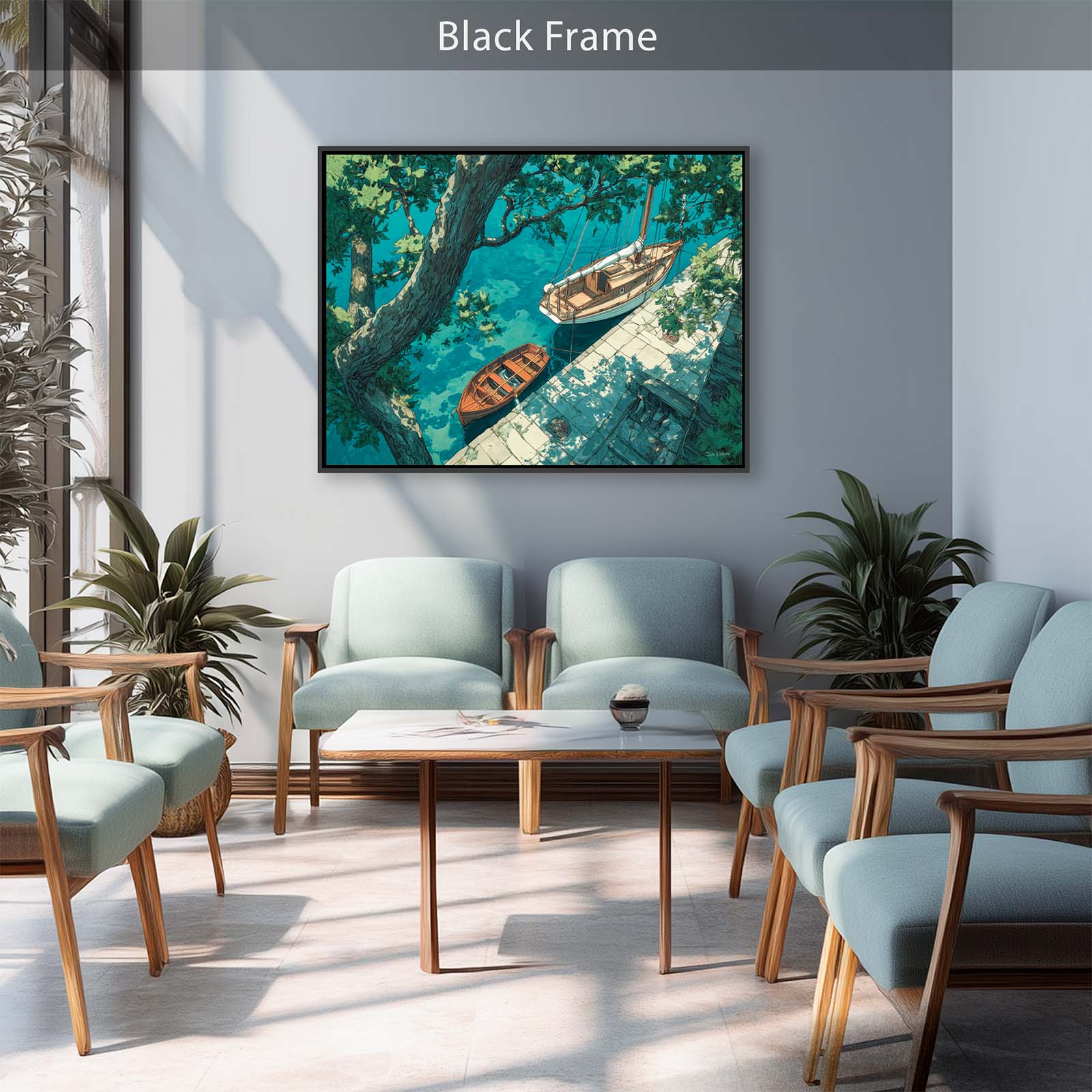 Bask in the tranquil glow of summer with Two Boats, a serene aerial view of a sailboat and rowboat resting gently at a sun-dappled dock. Shaded by leafy trees and rendered in soft aquas and greens, this peaceful scene brings a sense of light, calm and natural rhythm into any space.