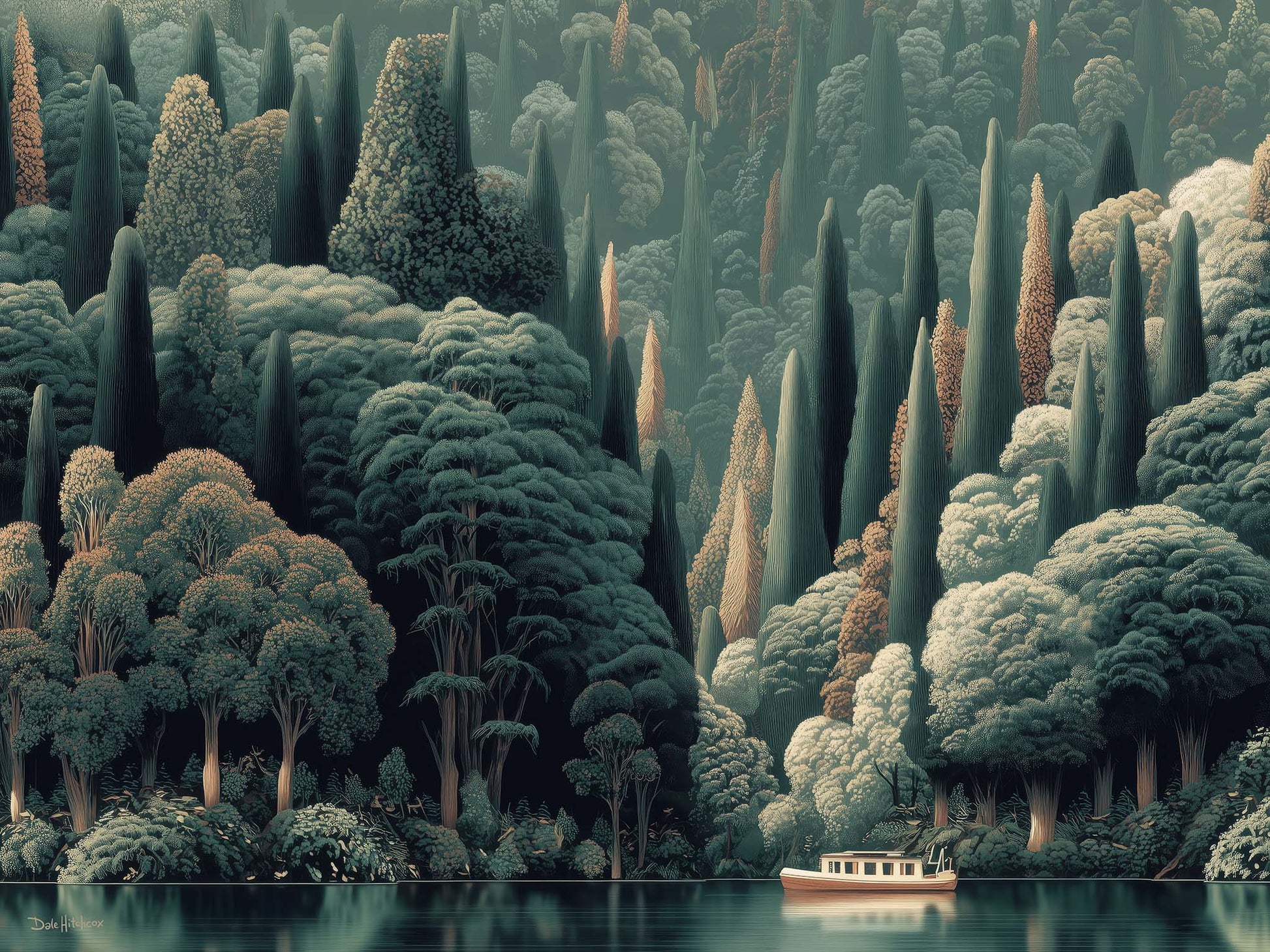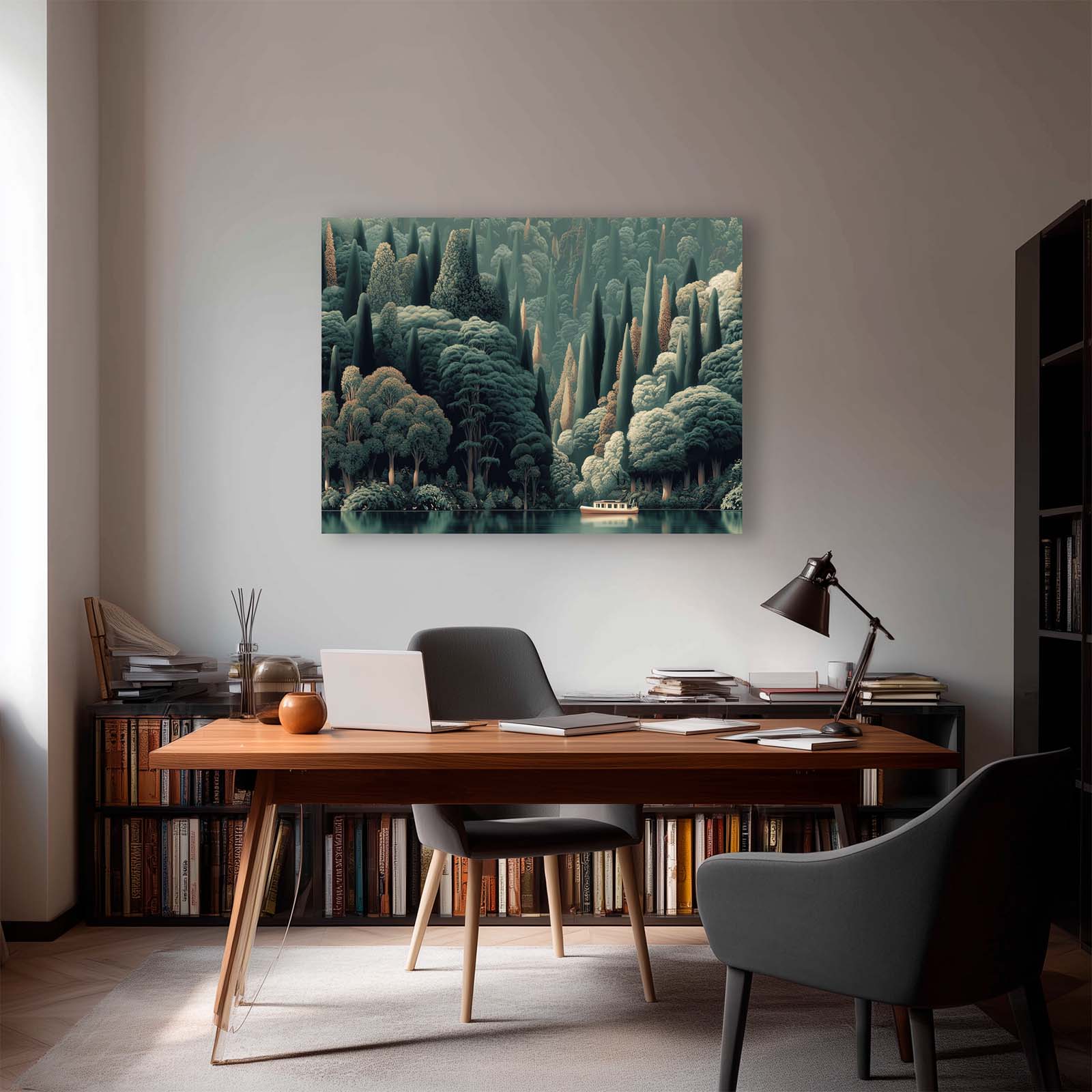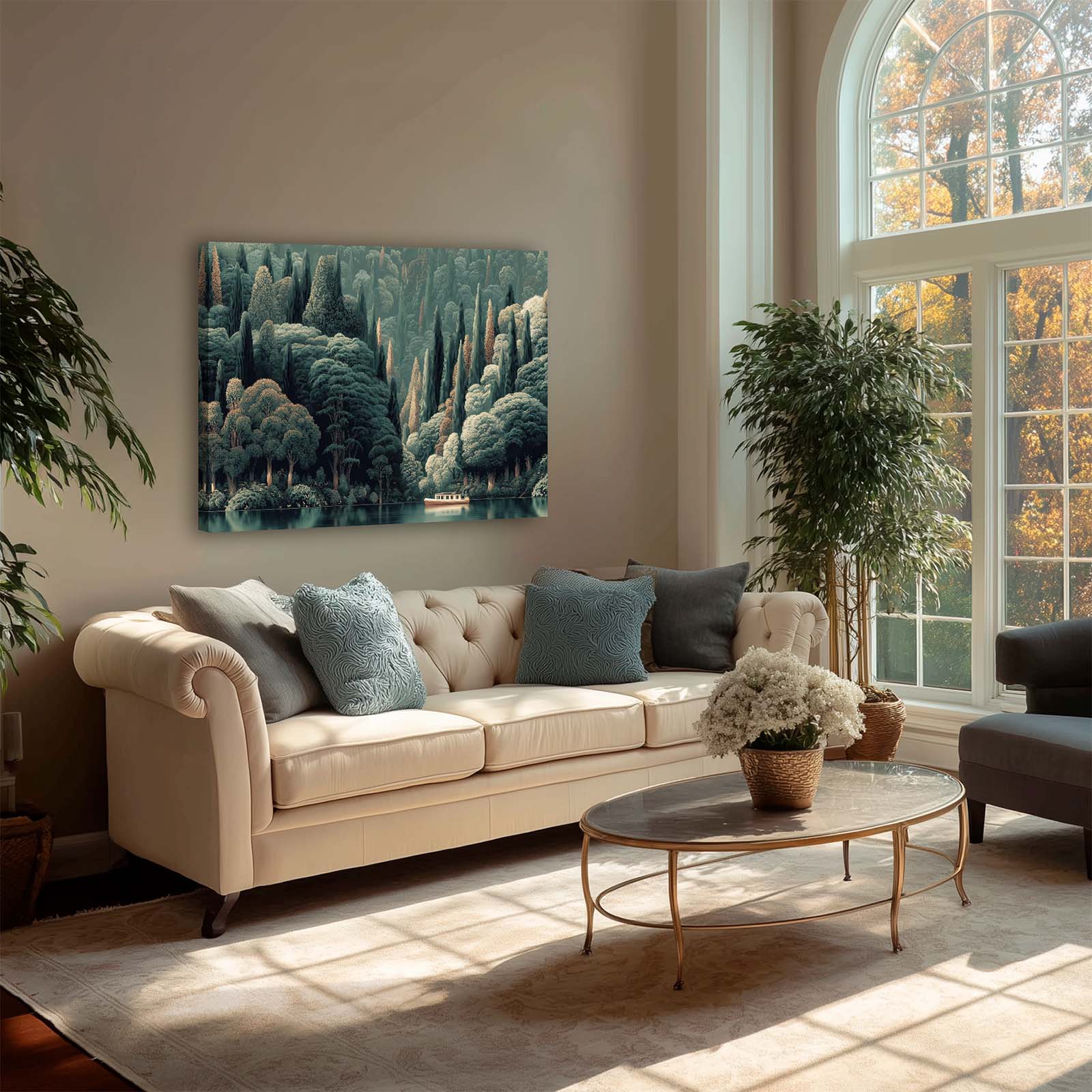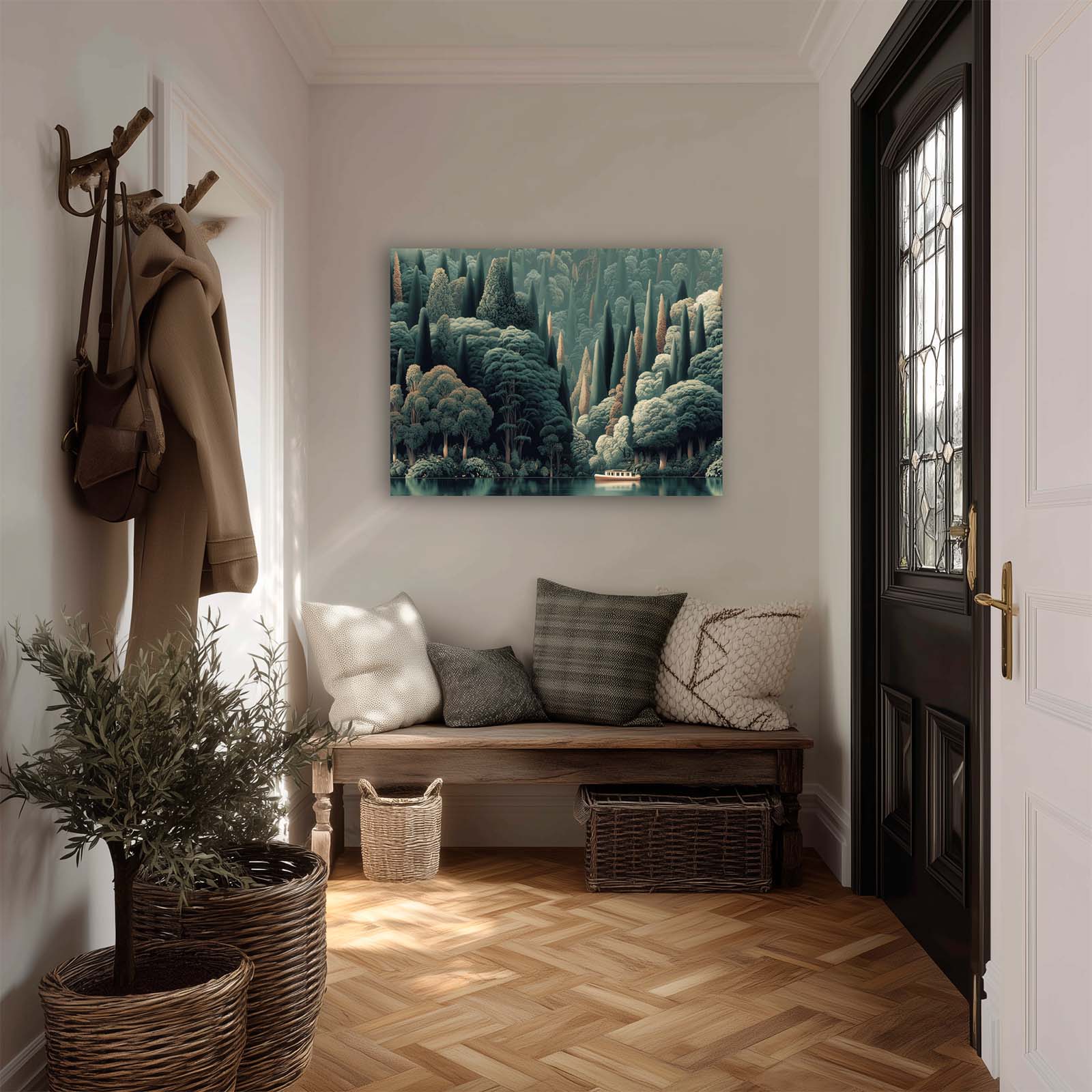 Enhance any space with this stunning giclee canvas print. A lone boat glides along the water at the base of a lush, forested hillside, capturing tranquility and natural beauty. Its versatile style complements almost any decor, bringing calm, interest, and elegance to your home or office.