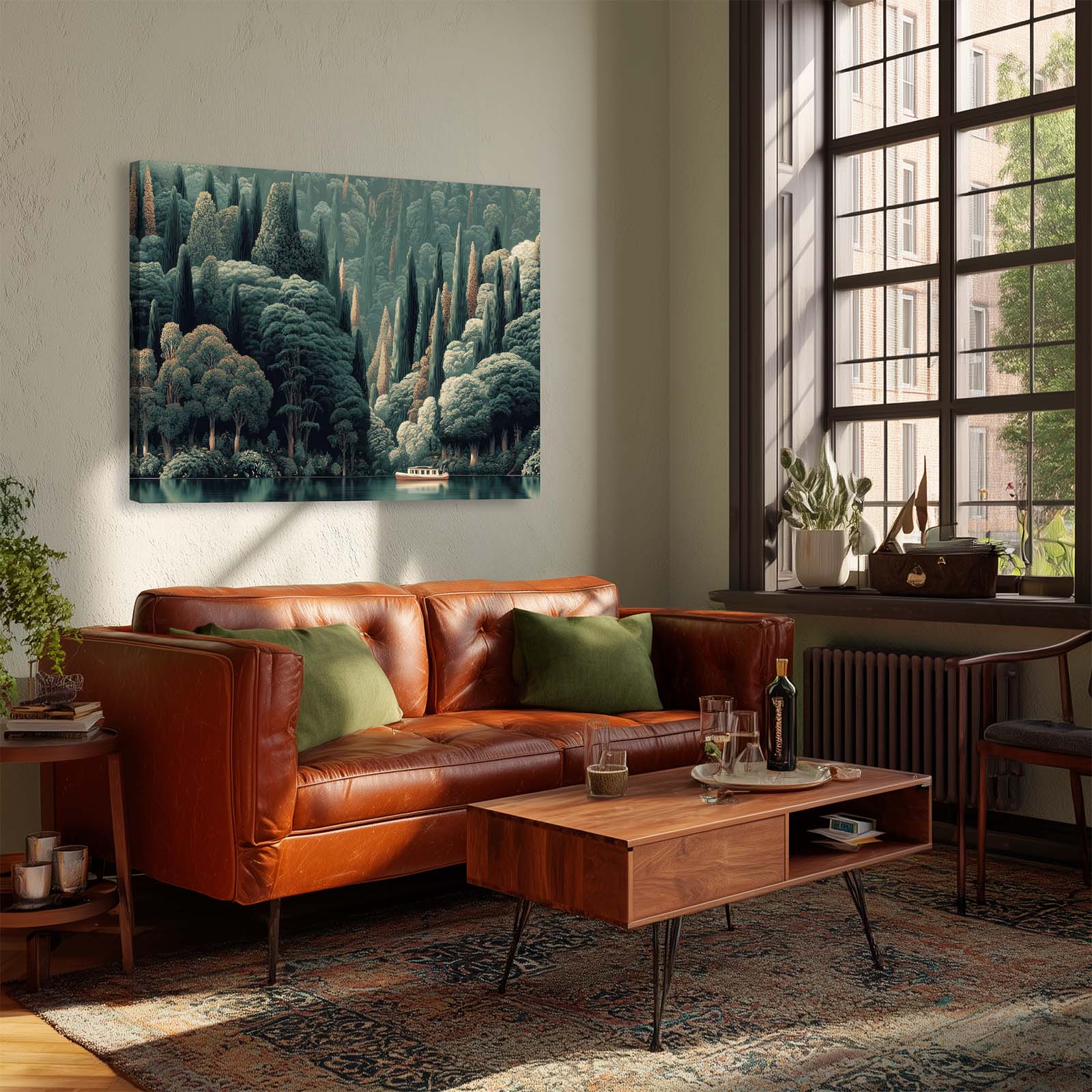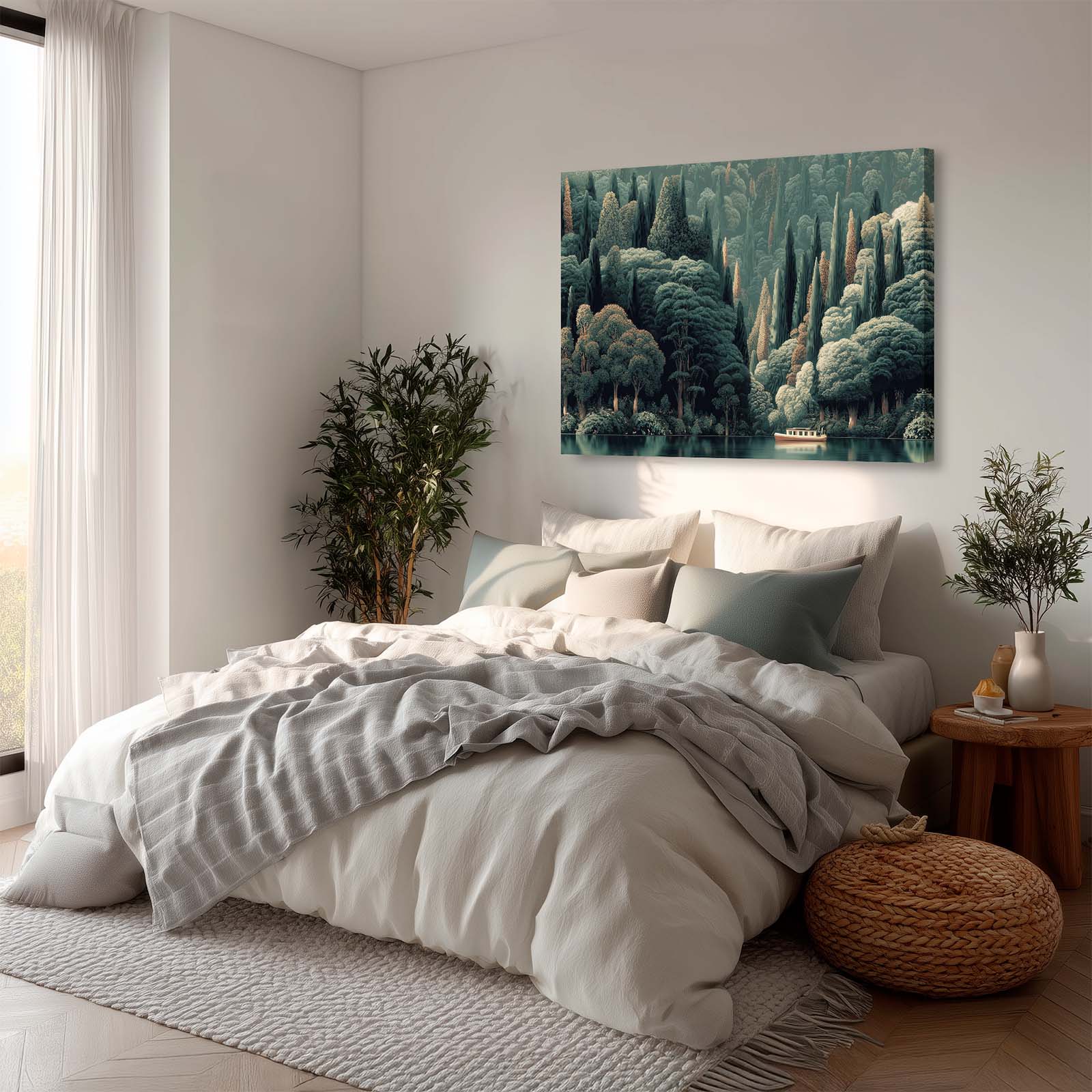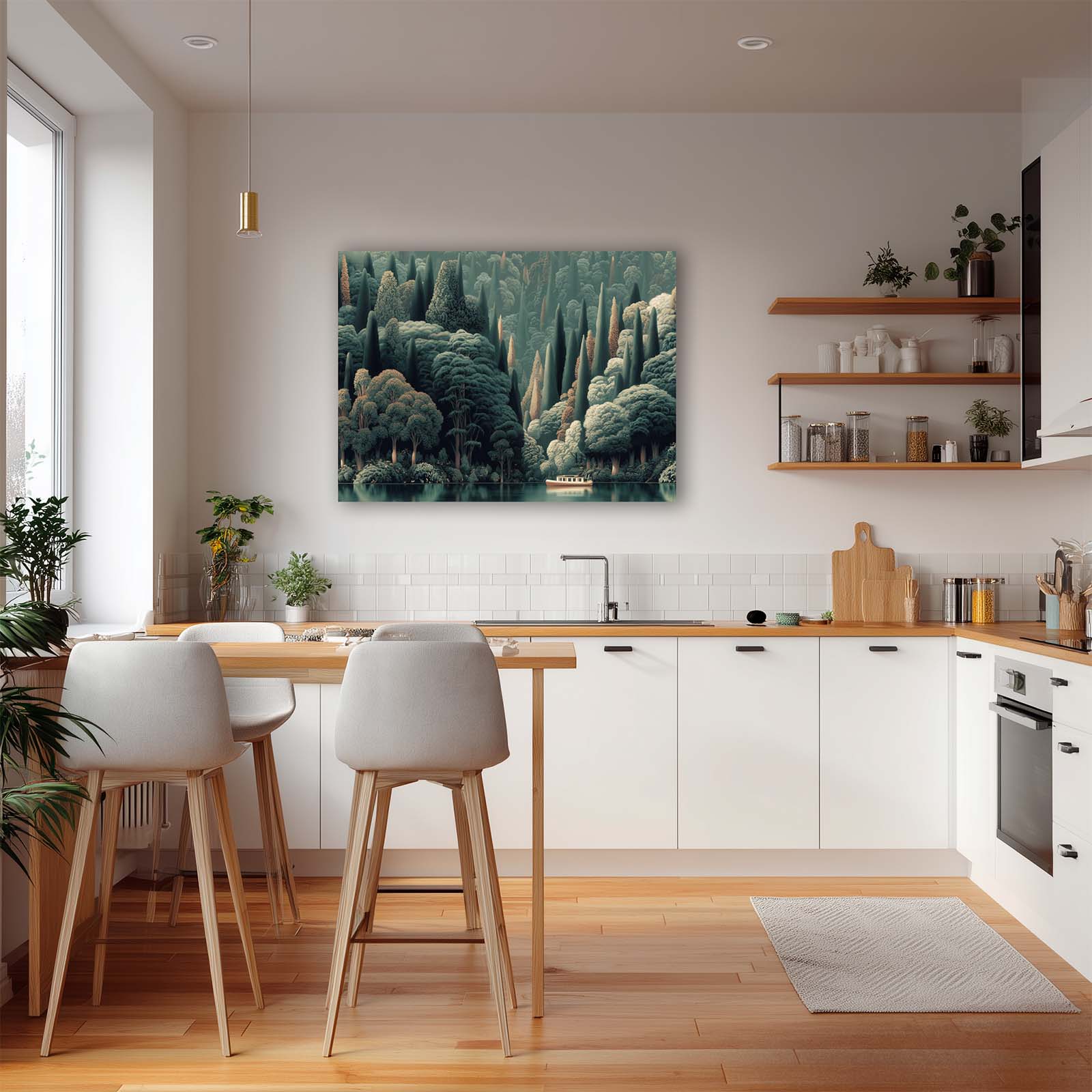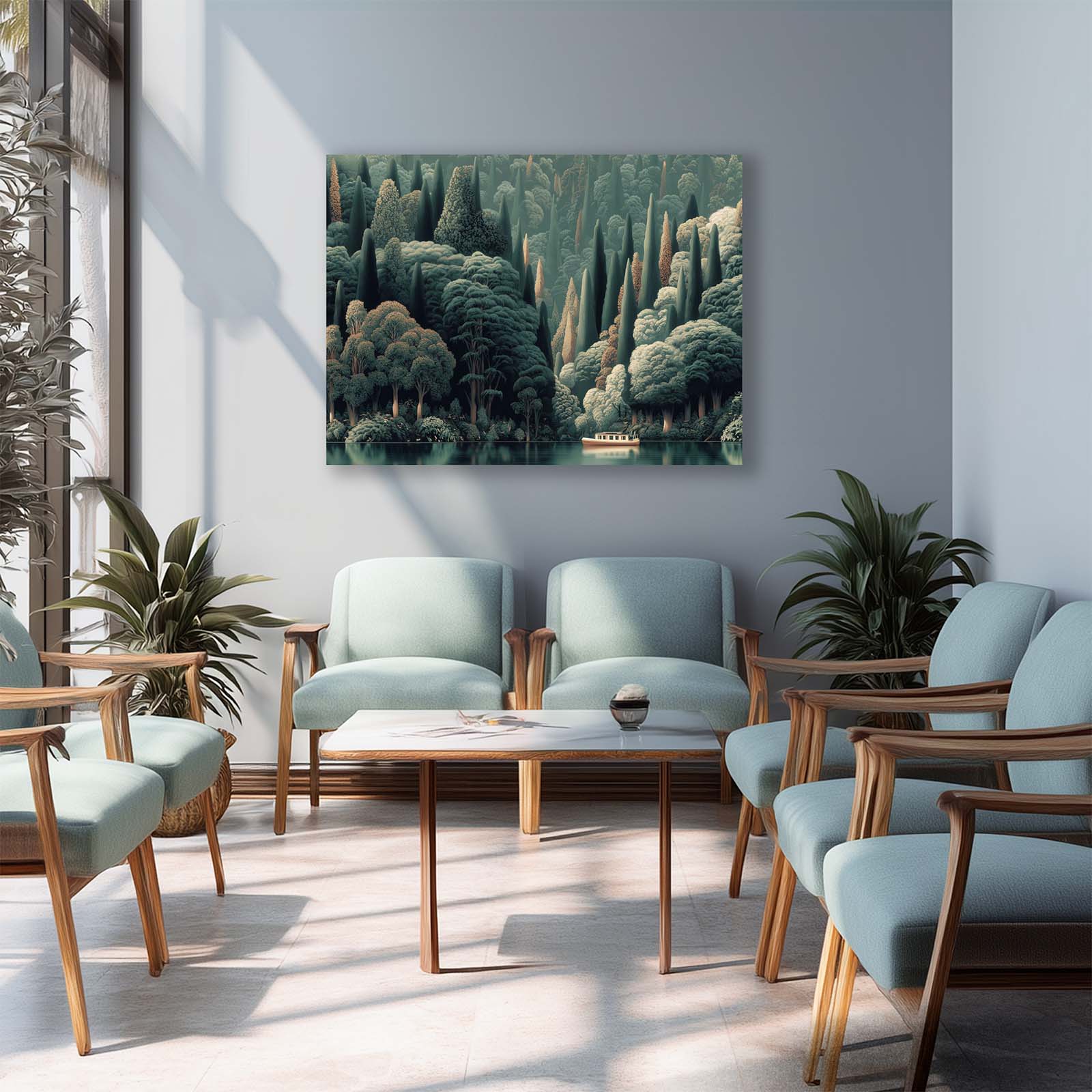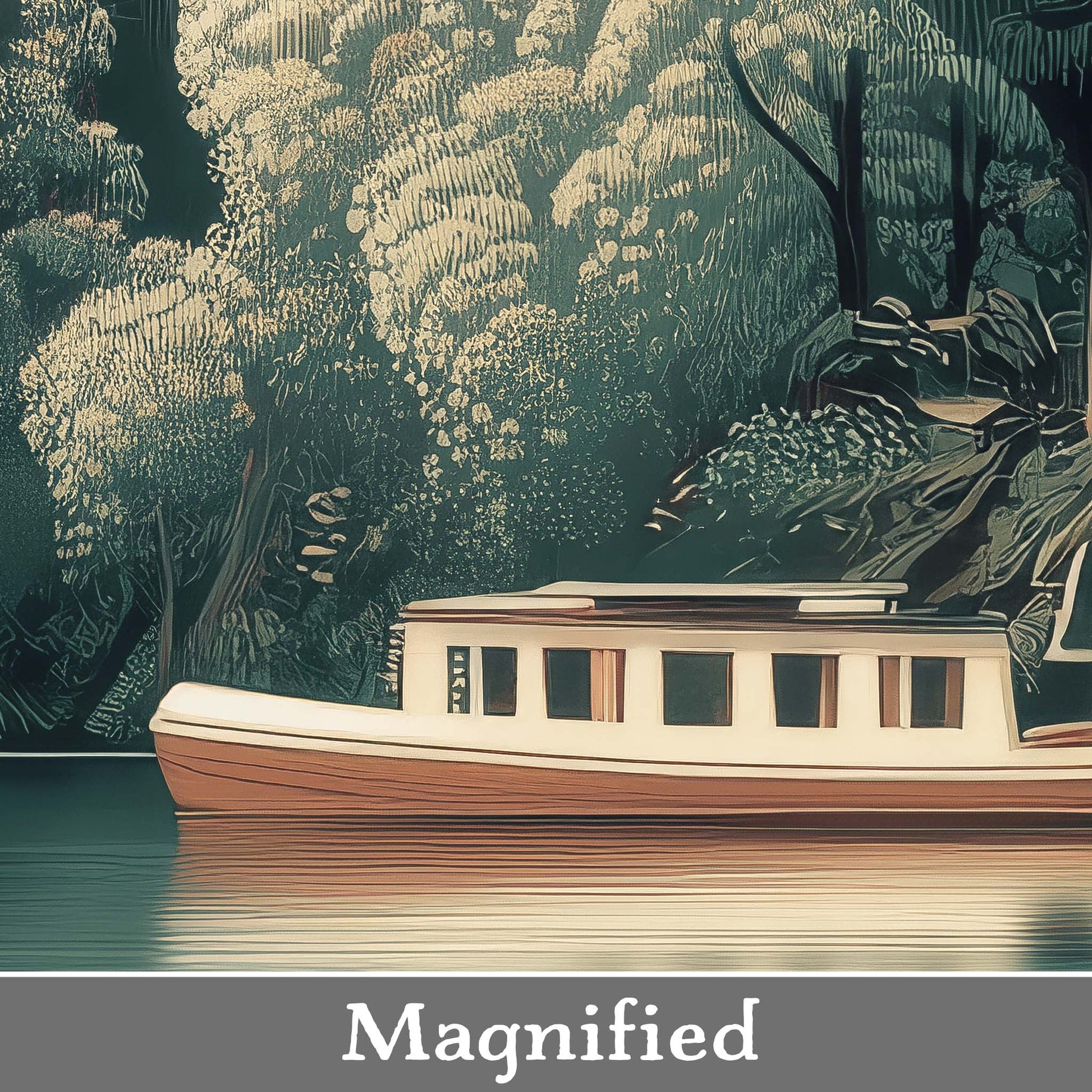 Enhance any space with this stunning giclee canvas print. A lone boat glides along the water at the base of a lush, forested hillside, capturing tranquility and natural beauty. Its versatile style complements almost any decor, bringing calm, interest, and elegance to your home or office.