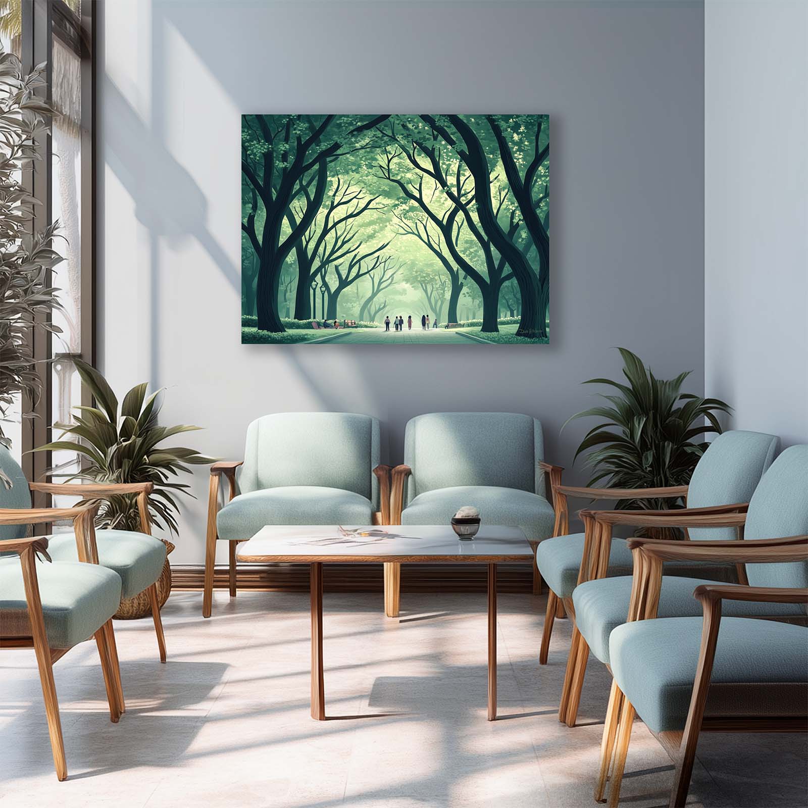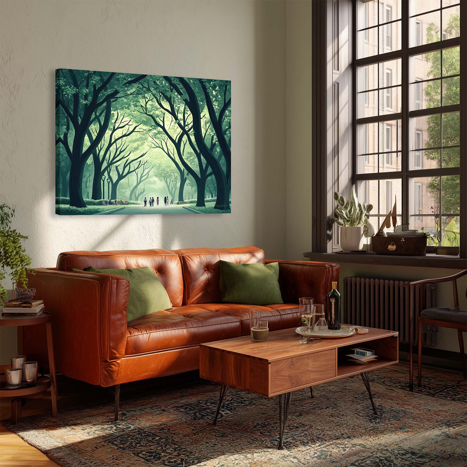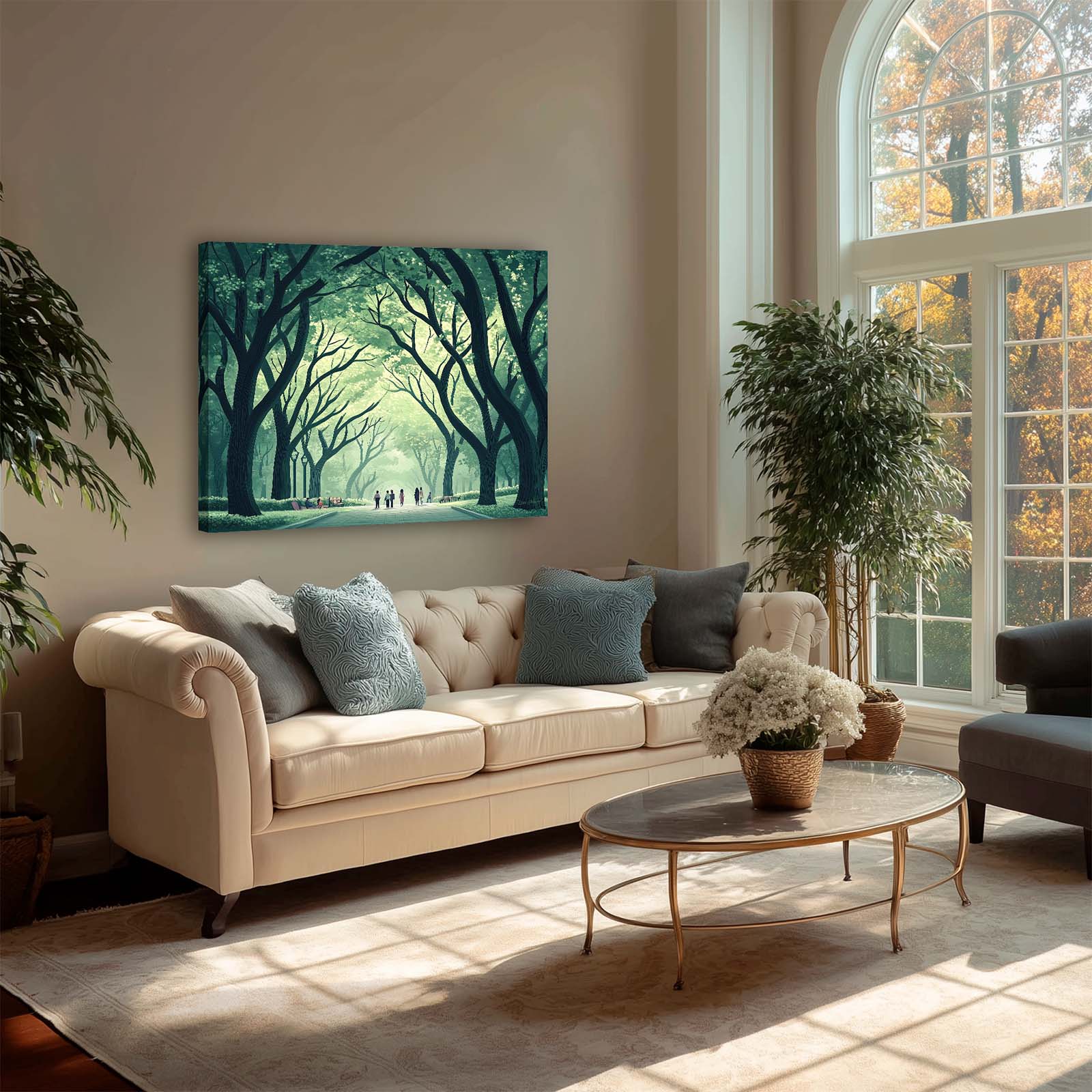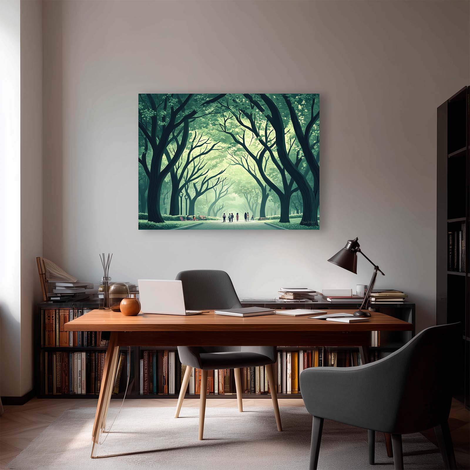 Capture the quiet joy of friendship and nature with this serene scene of friends walking through a lush city park. The towering trees and rich greenery create a sense of scale and calm that draws the viewer in. Printed with archival giclée inks on premium stretched canvas, this artwork enhances any home or office décor with its blend of warmth, harmony, and timeless beauty.