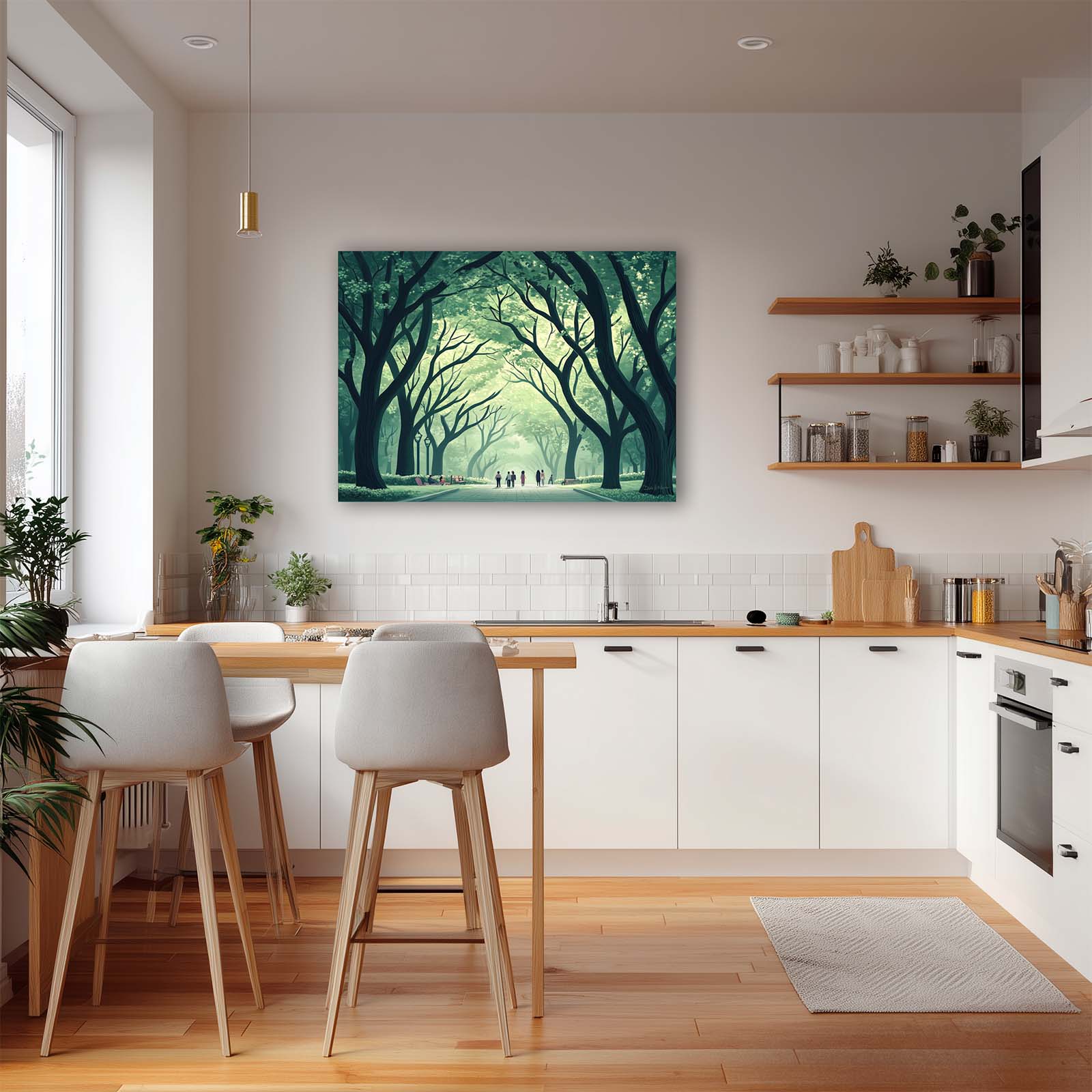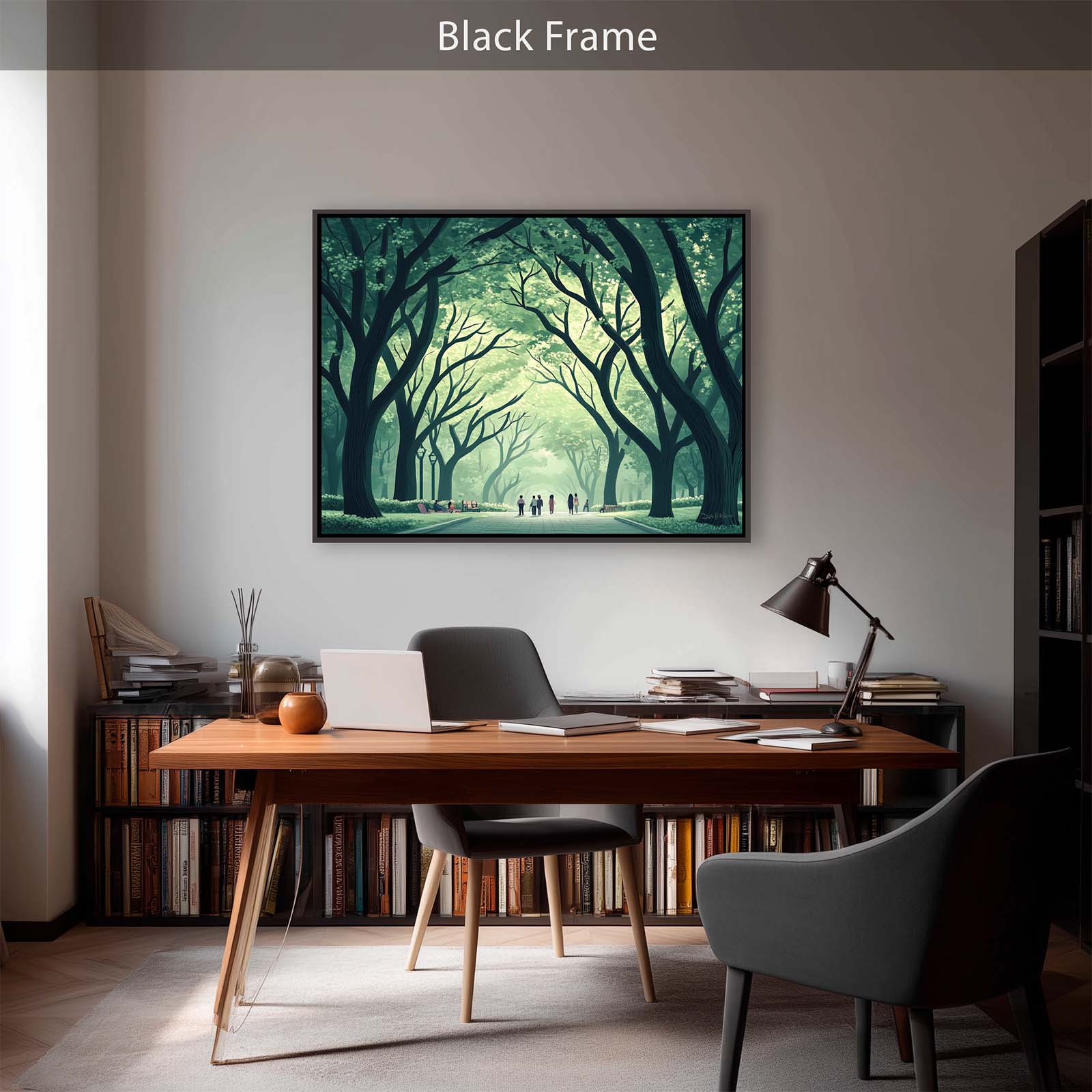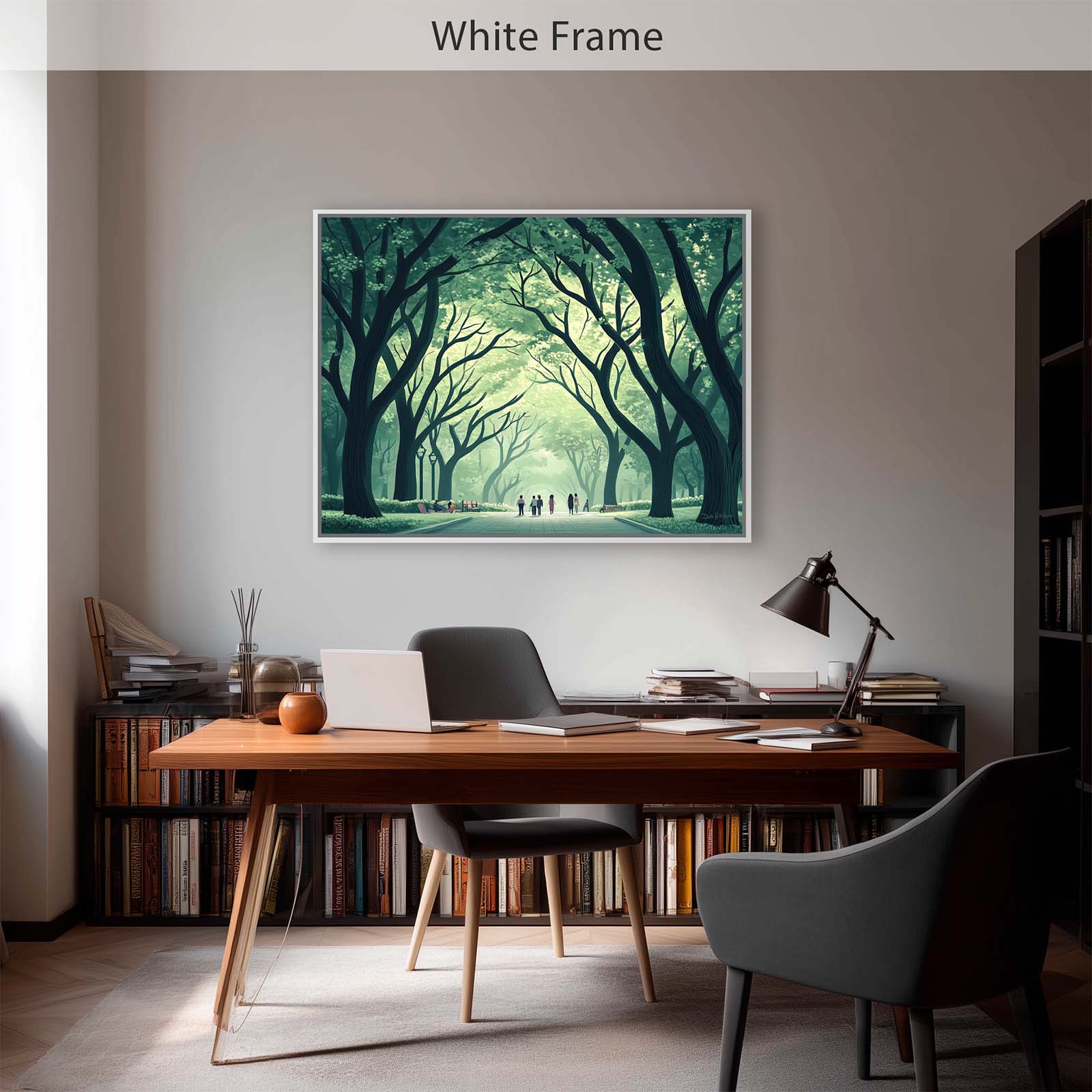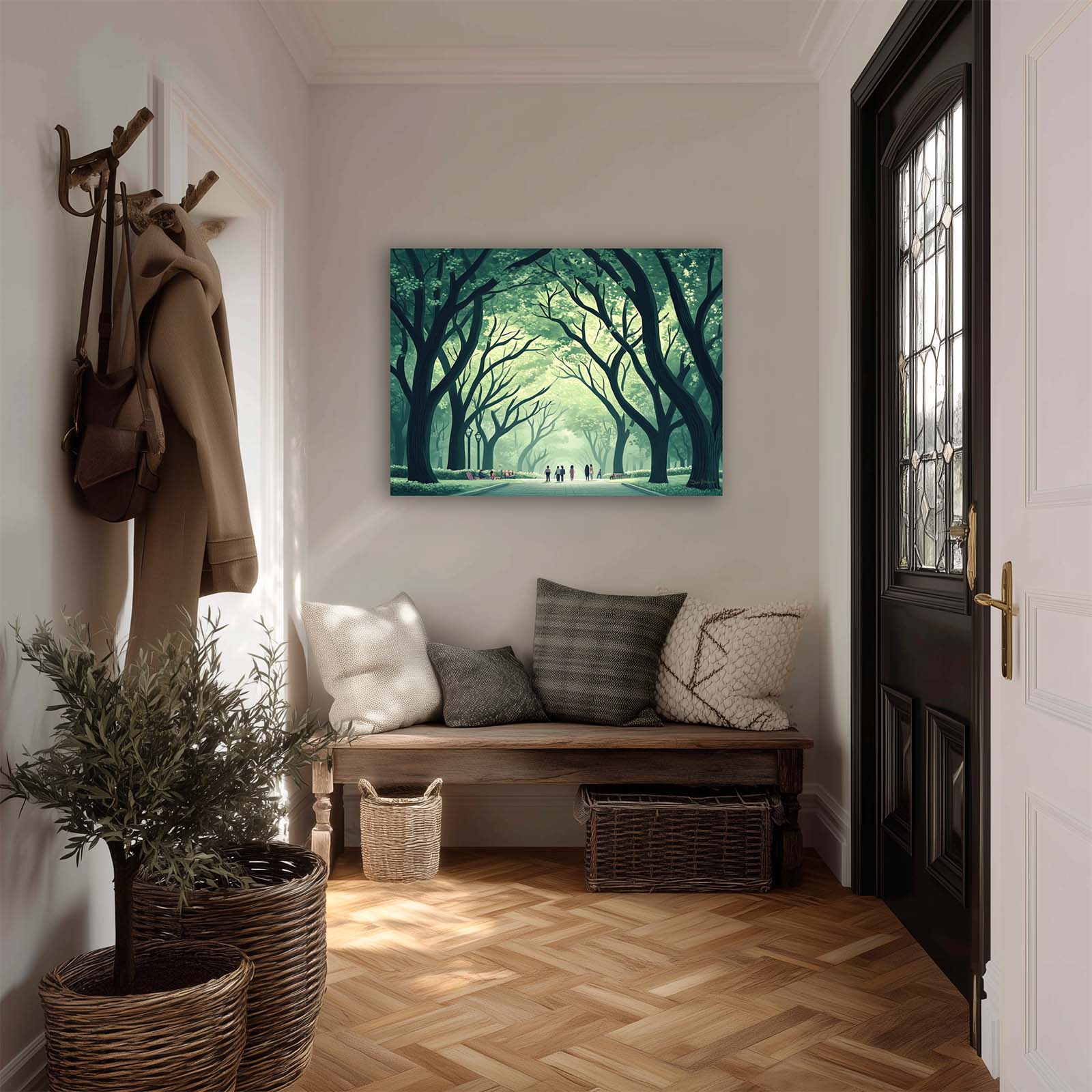 Capture the quiet joy of friendship and nature with this serene scene of friends walking through a lush city park. The towering trees and rich greenery create a sense of scale and calm that draws the viewer in. Printed with archival giclée inks on premium stretched canvas, this artwork enhances any home or office décor with its blend of warmth, harmony, and timeless beauty.