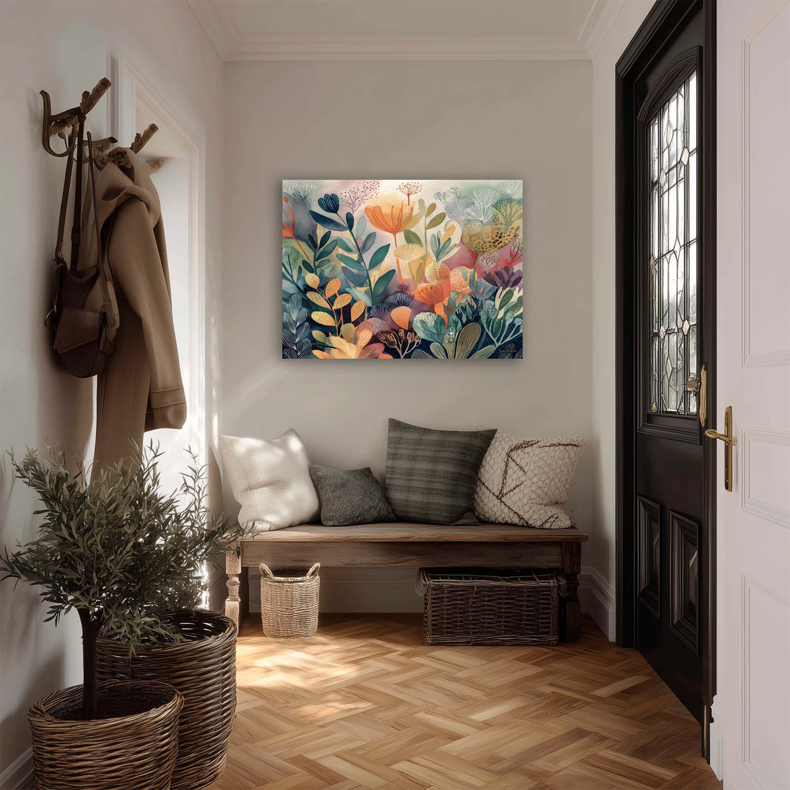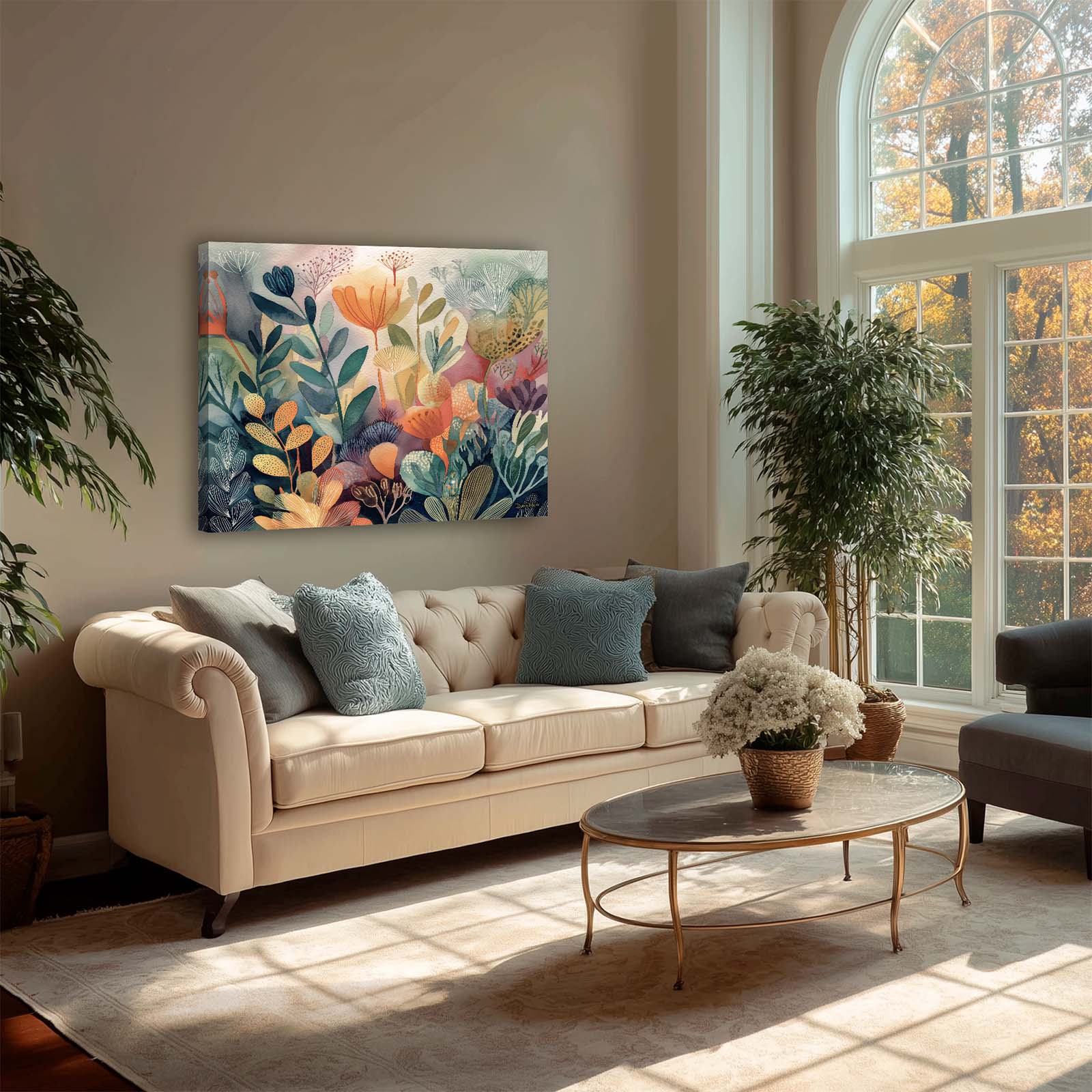 Bring a touch of charm and lightness into your space with Waterflowers, a whimsical watercolor-inspired stretched-canvas print. This graceful composition features blooming flowers and soft greenery, rendered in gentle, airy brushstrokes that capture the joy and simplicity of nature.