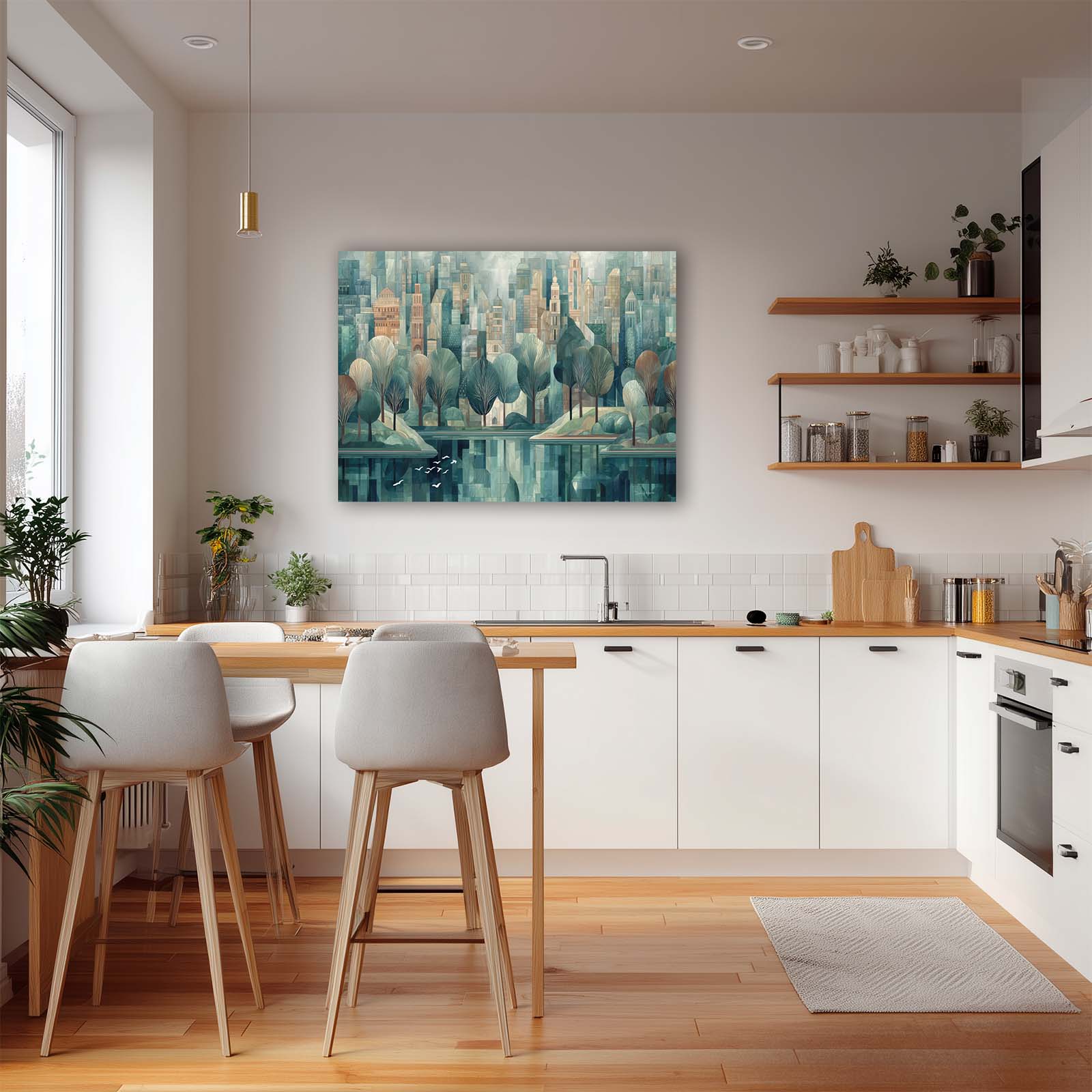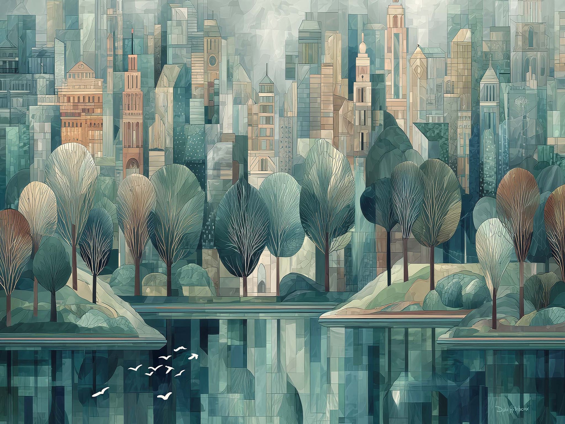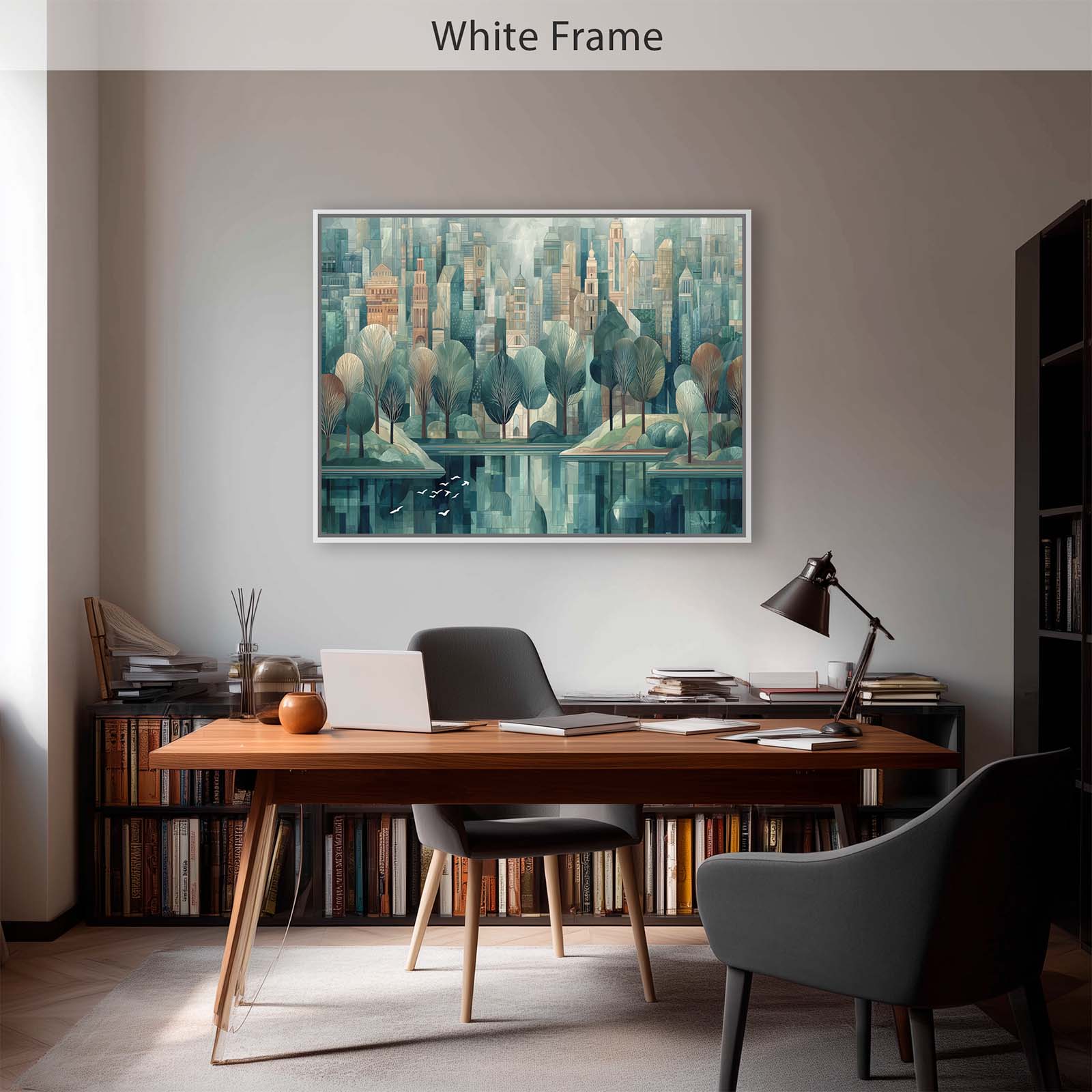 Bring serenity and movement into your space with this graceful scene of white birds taking flight over tranquil waters in a peaceful city park. Rendered in a pleasing artistic style, the composition adds calm beauty and visual interest to any room. Printed with archival giclée inks on premium stretched canvas, it’s a perfect accent for home or office décor.