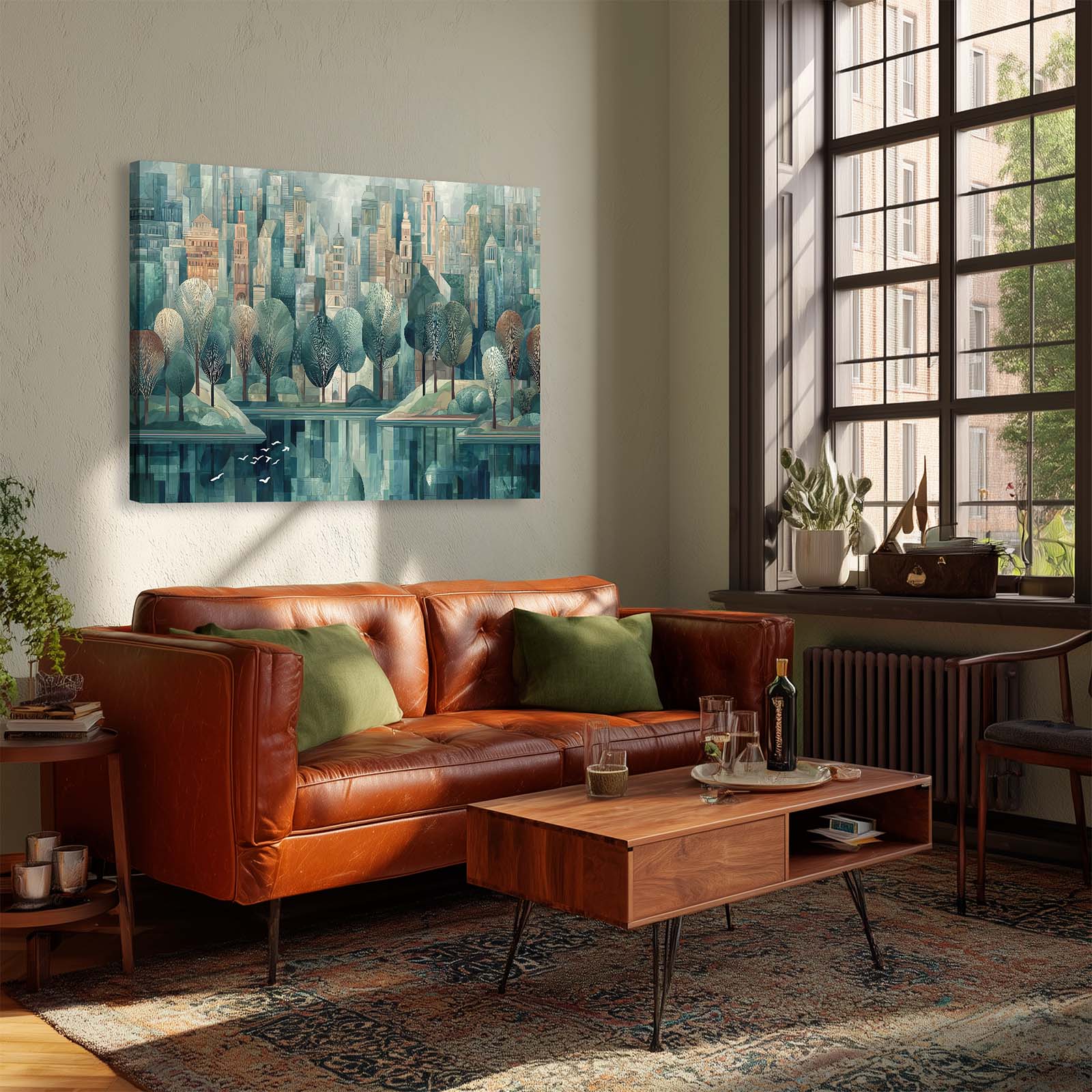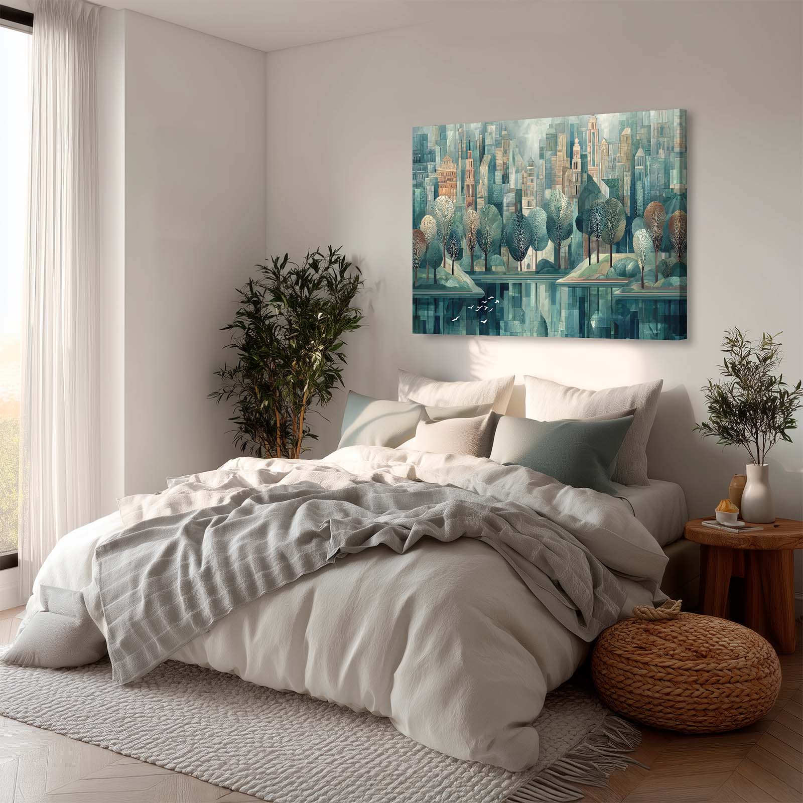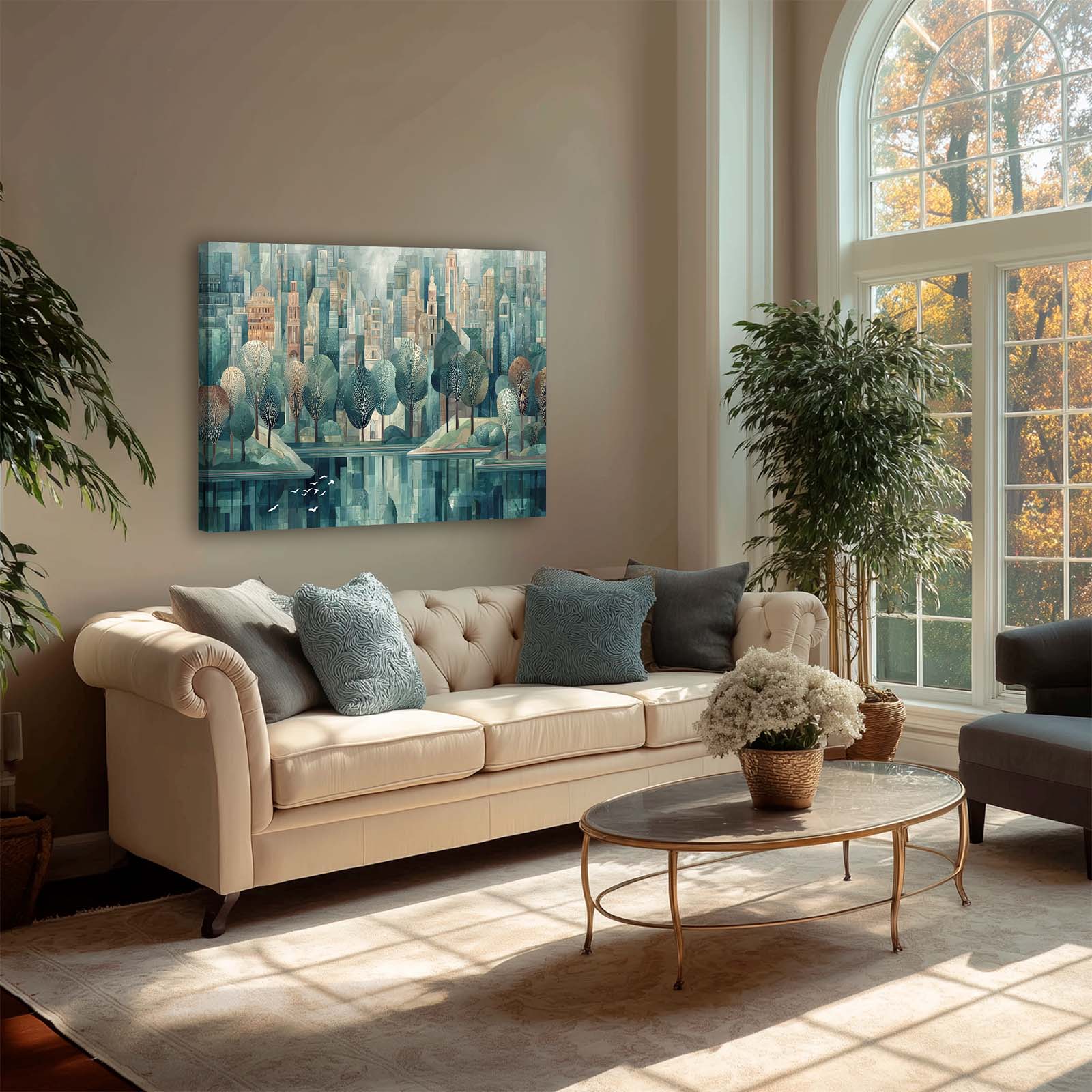 Bring serenity and movement into your space with this graceful scene of white birds taking flight over tranquil waters in a peaceful city park. Rendered in a pleasing artistic style, the composition adds calm beauty and visual interest to any room. Printed with archival giclée inks on premium stretched canvas, it’s a perfect accent for home or office décor.