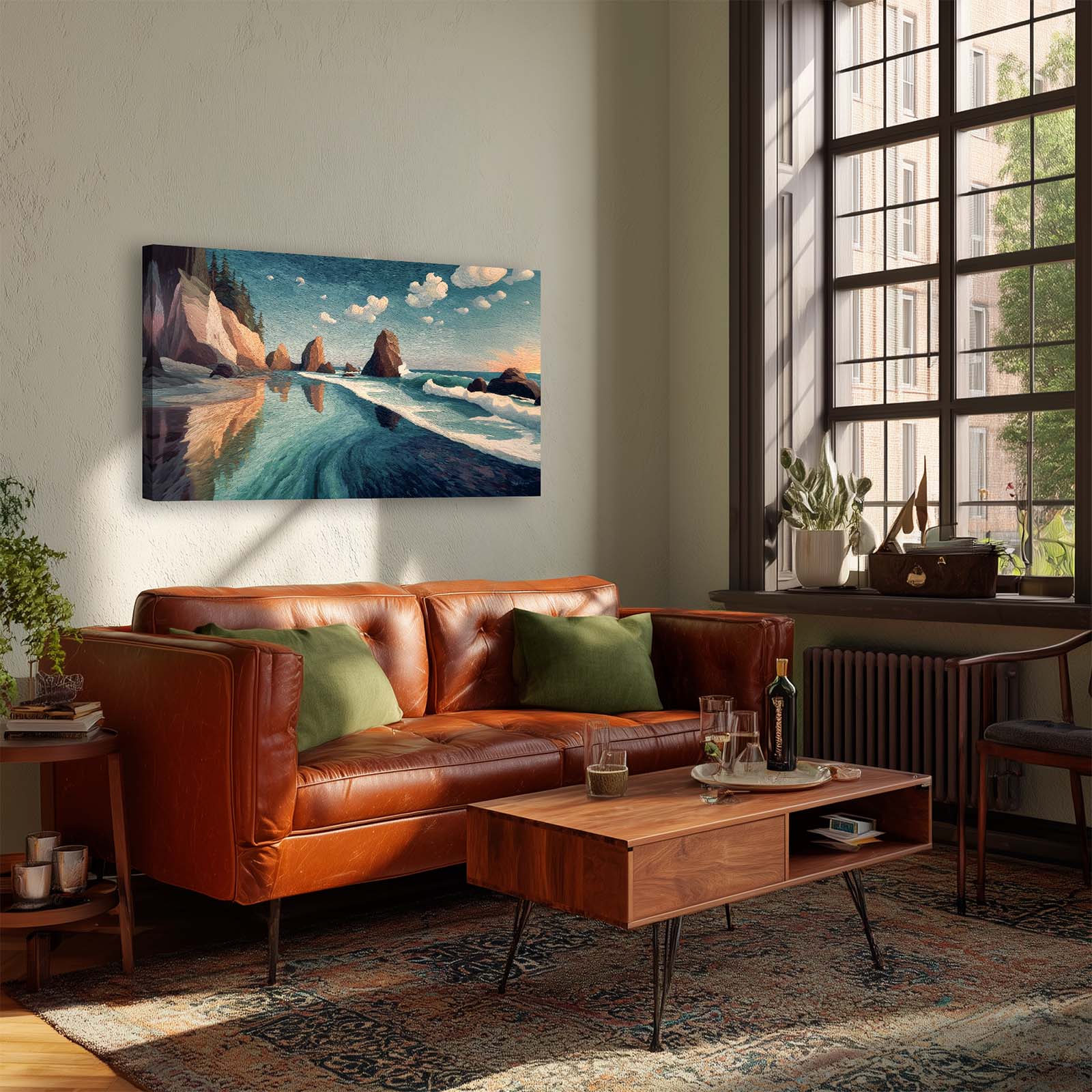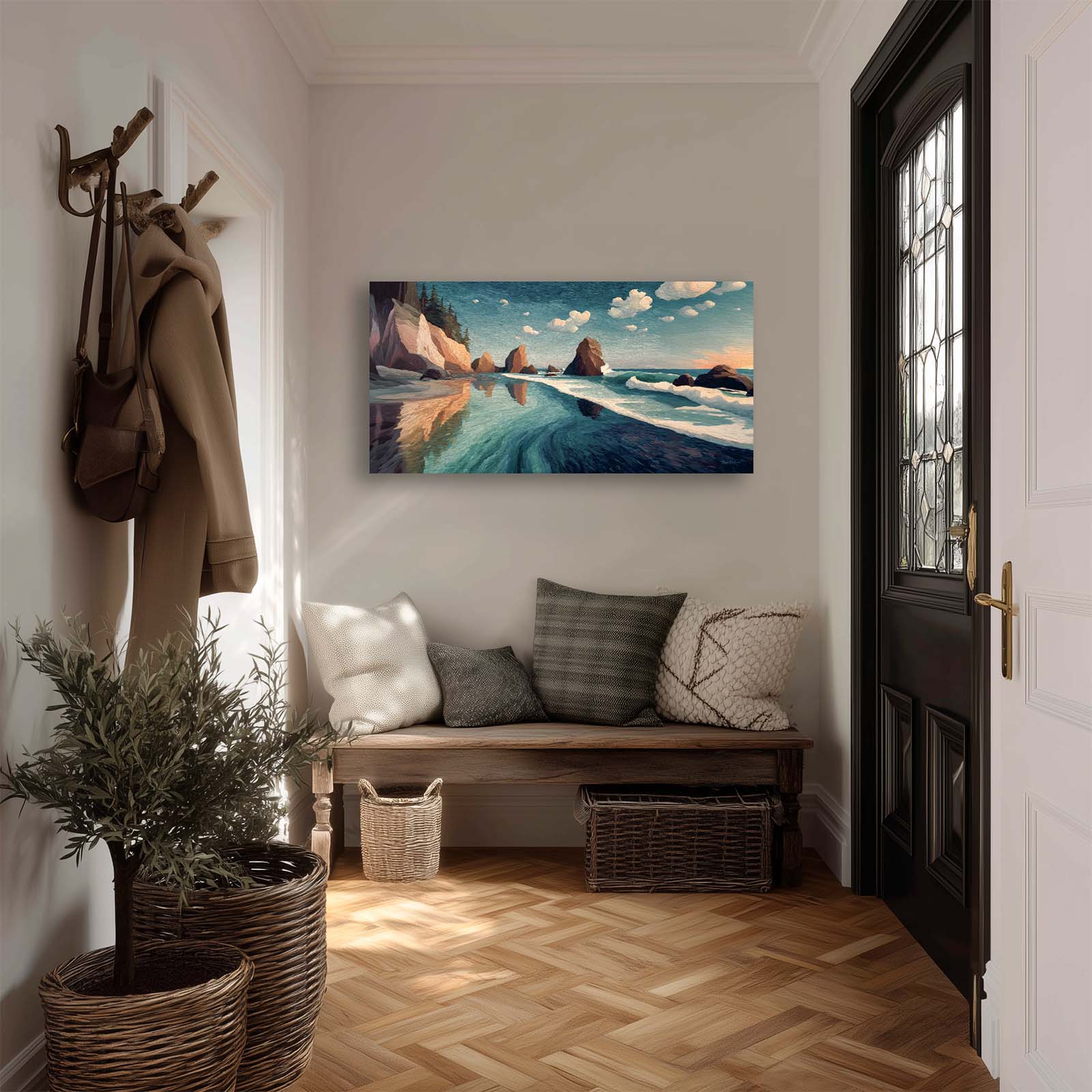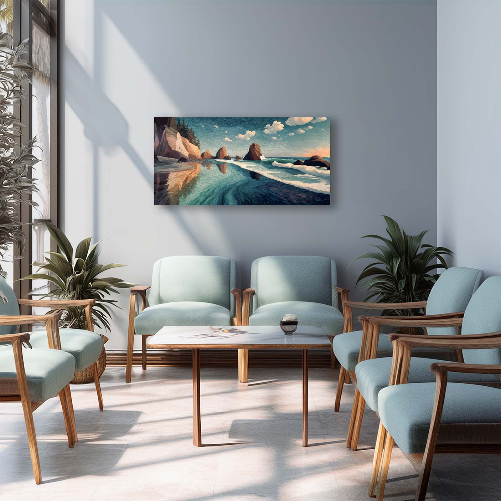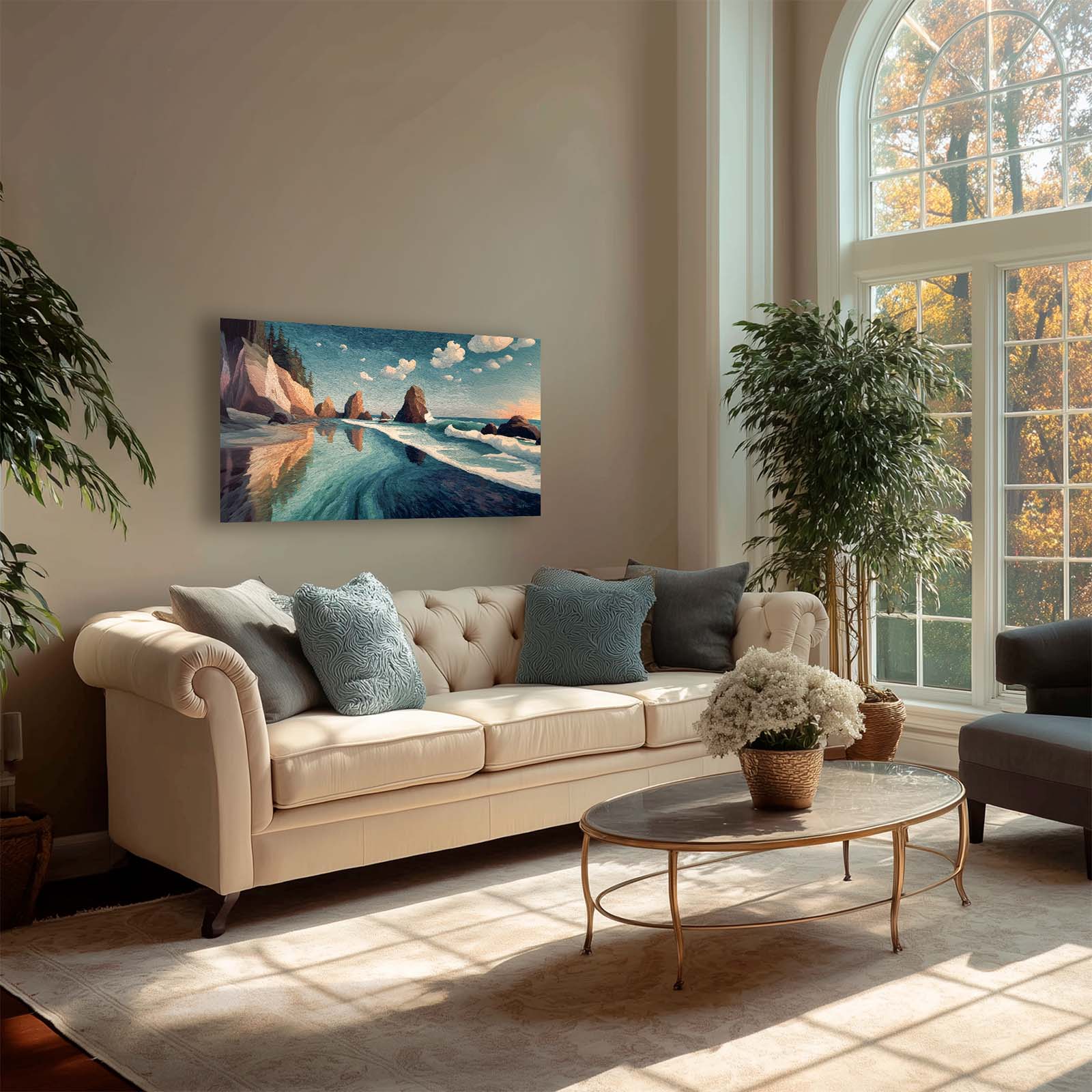 Bring the serene beauty of the coast into your space with this stretched-canvas art print. The image captures ocean surf meeting the shore in perfect harmony, adding natural calm to home or office's decor. Perfect for creating a peaceful, coastal-inspired ambiance.