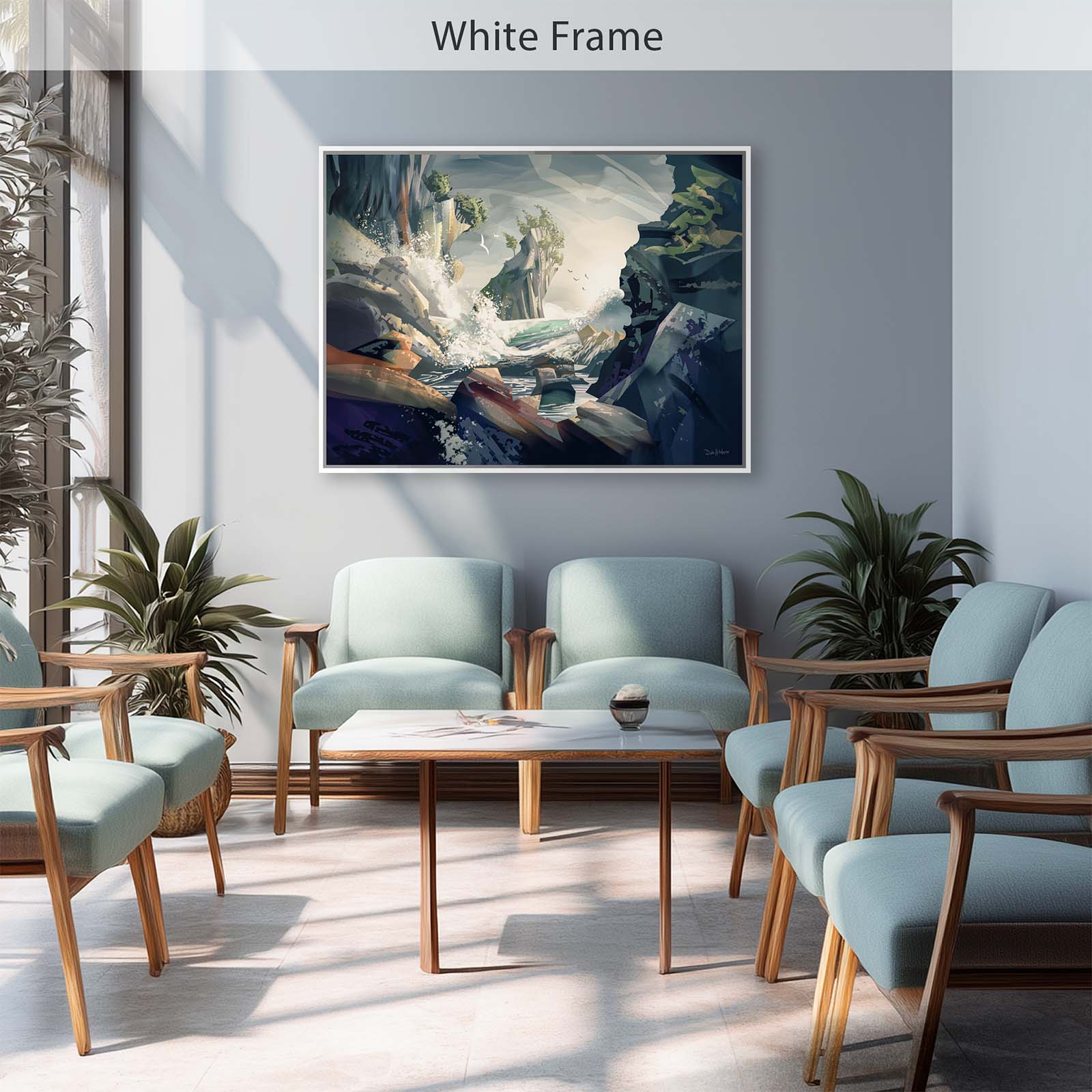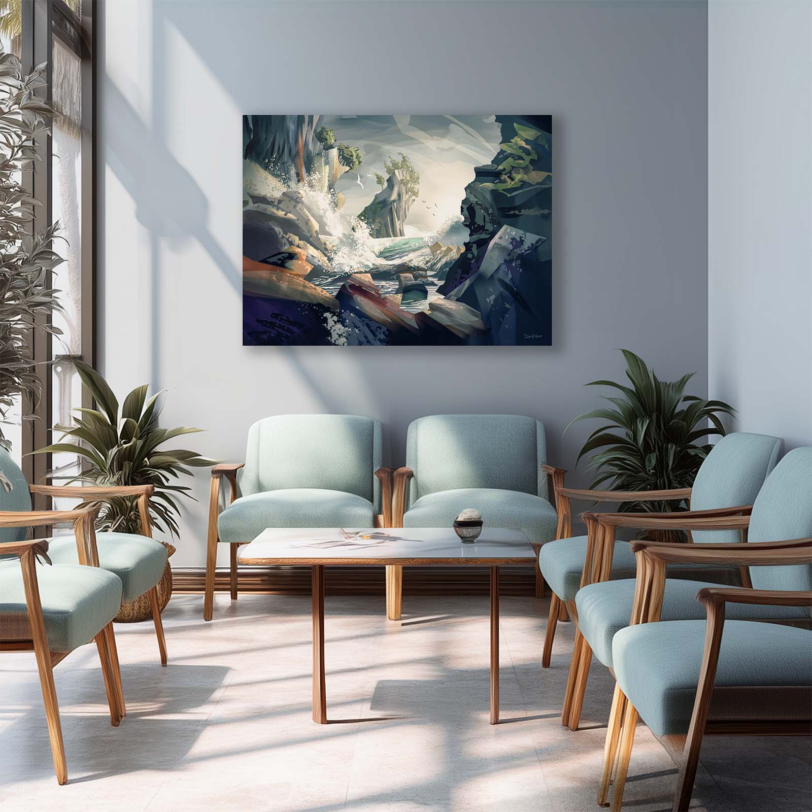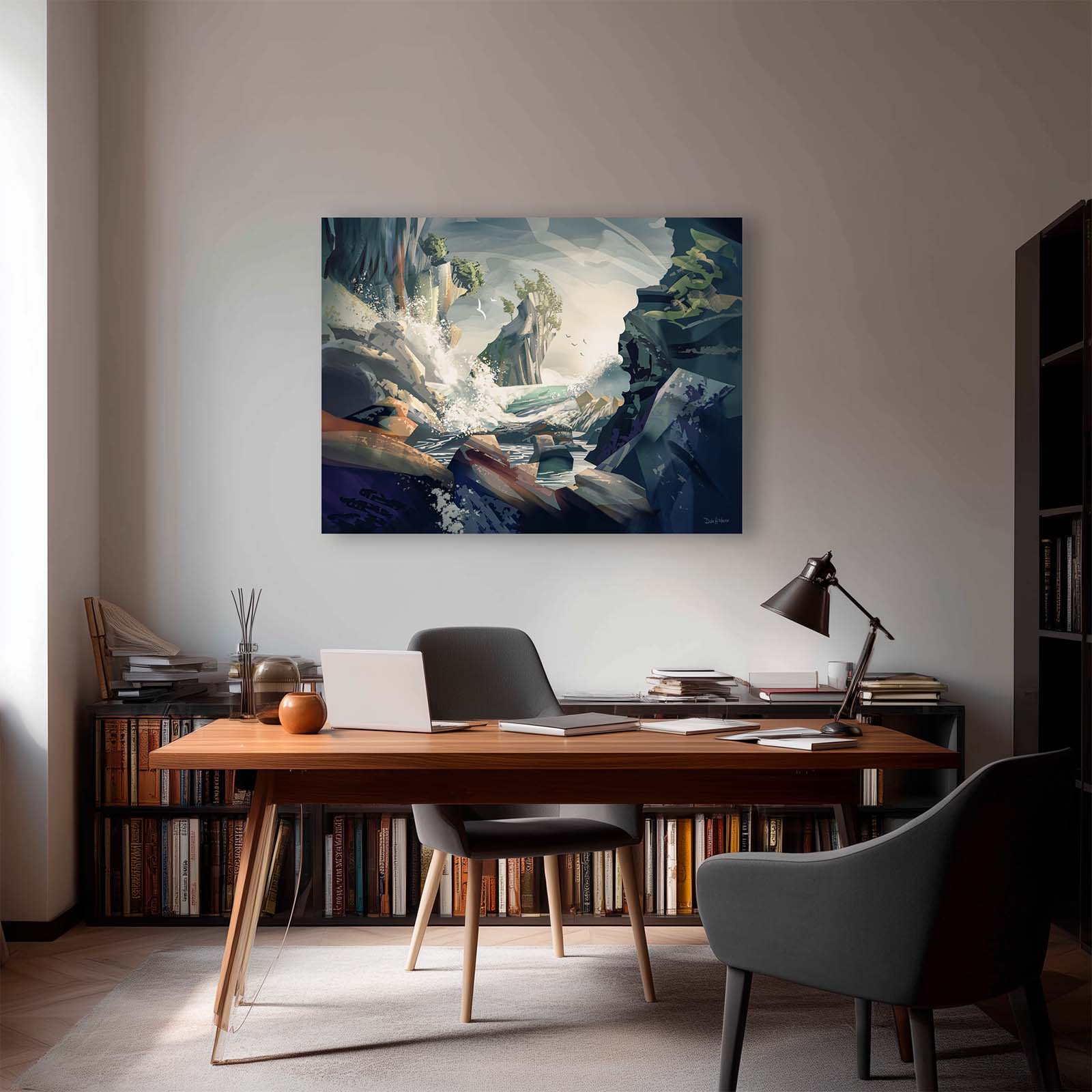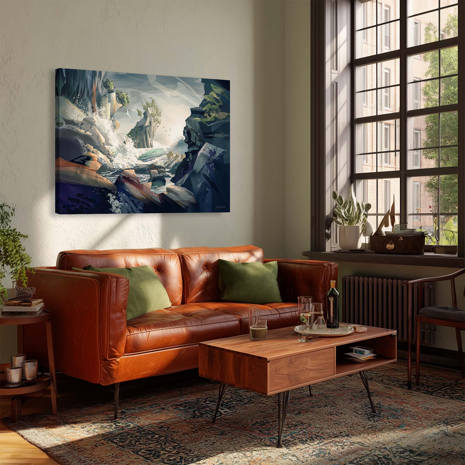 Celebrate the strength and rhythm of the sea with West Coast Waves, a bold cubist-inspired stretched-canvas print. This striking artwork captures the power and natural beauty of ocean, sky, and rocky coastline, rendered in strong geometric forms and dynamic movement.