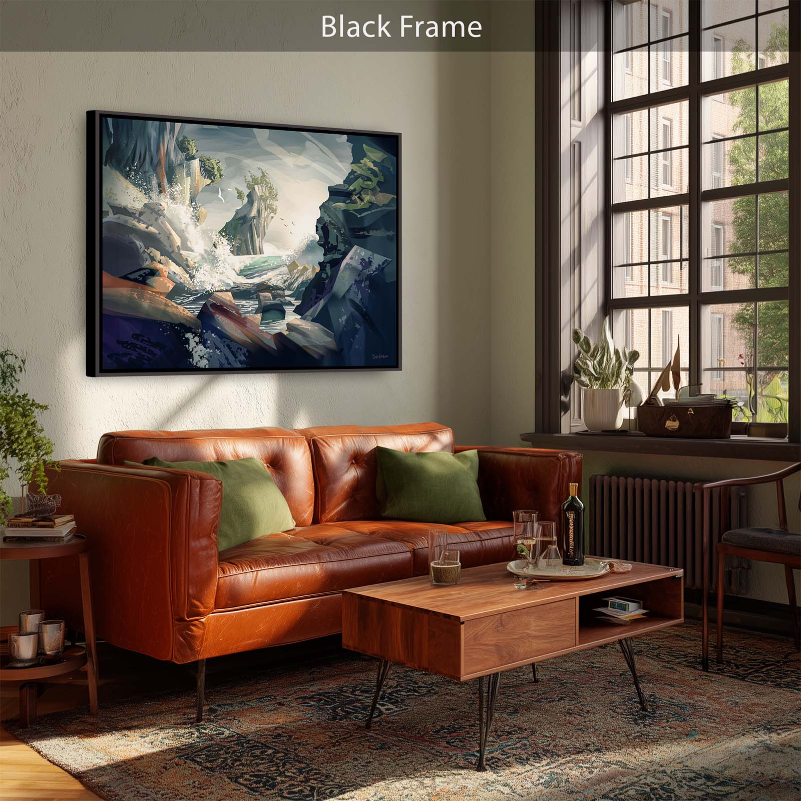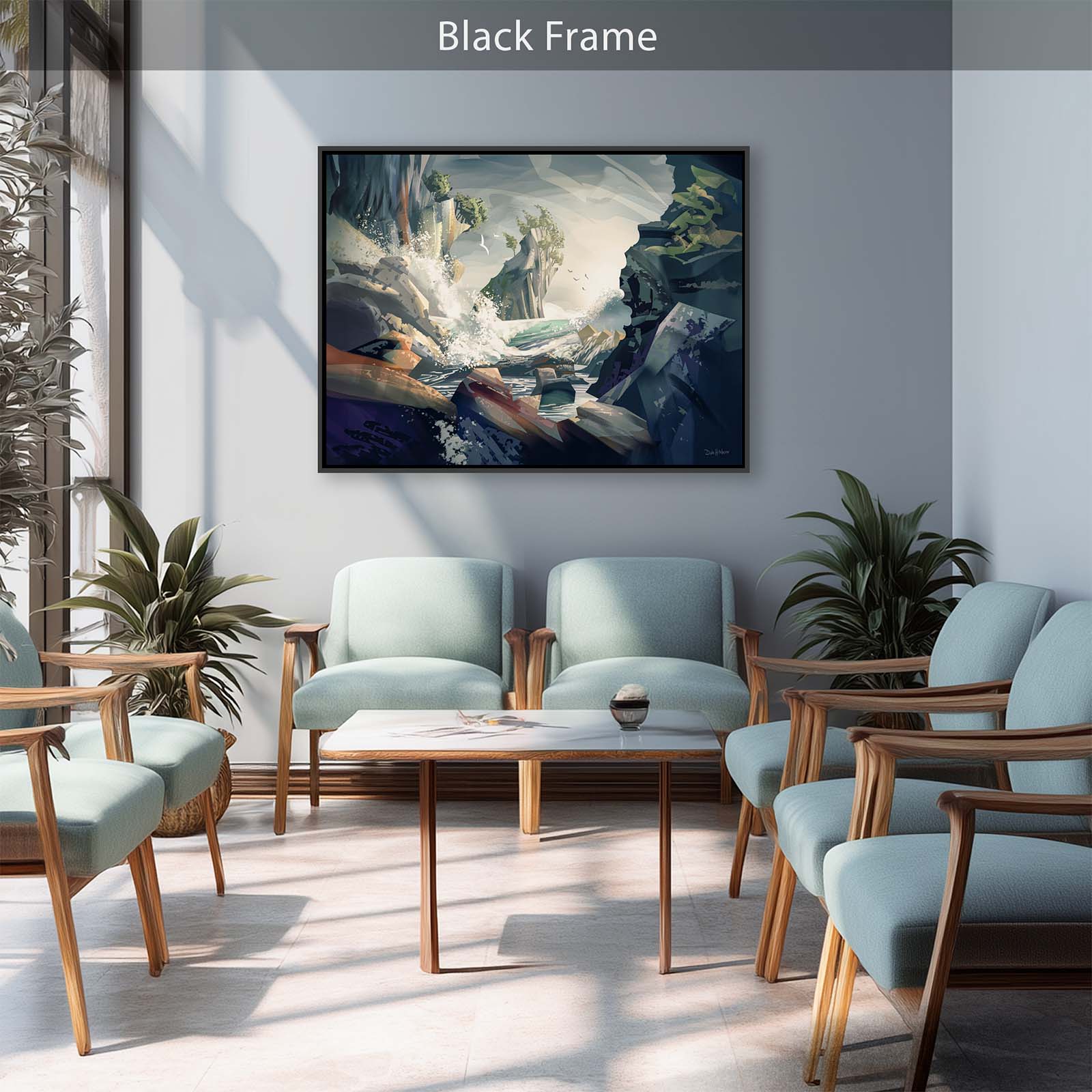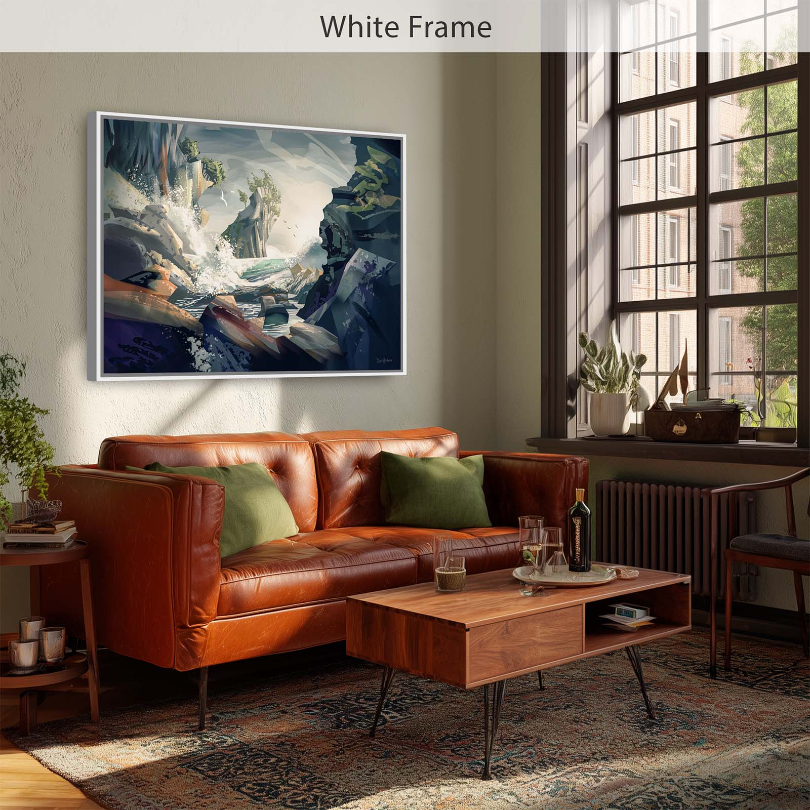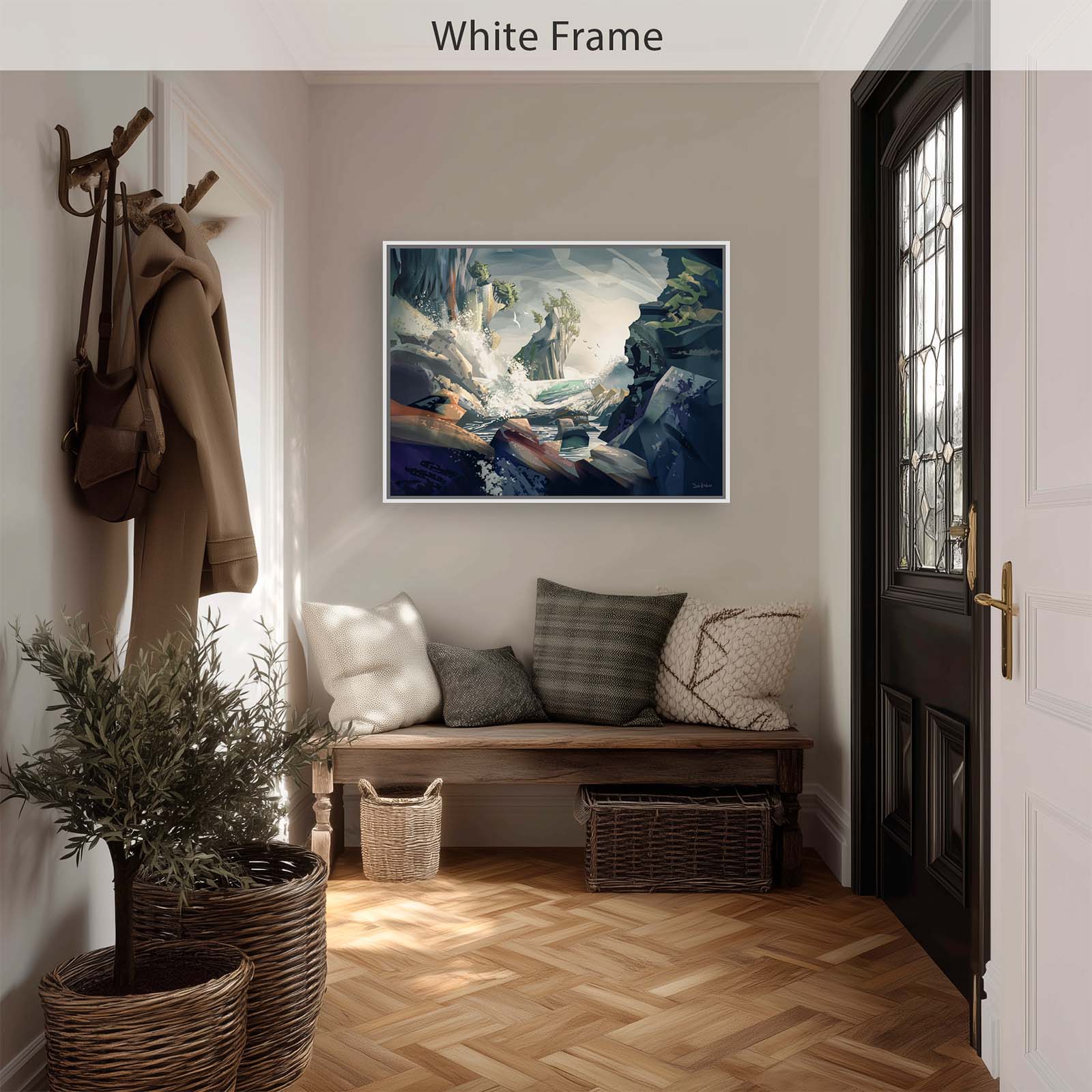 Celebrate the strength and rhythm of the sea with West Coast Waves, a bold cubist-inspired stretched-canvas print. This striking artwork captures the power and natural beauty of ocean, sky, and rocky coastline, rendered in strong geometric forms and dynamic movement.
