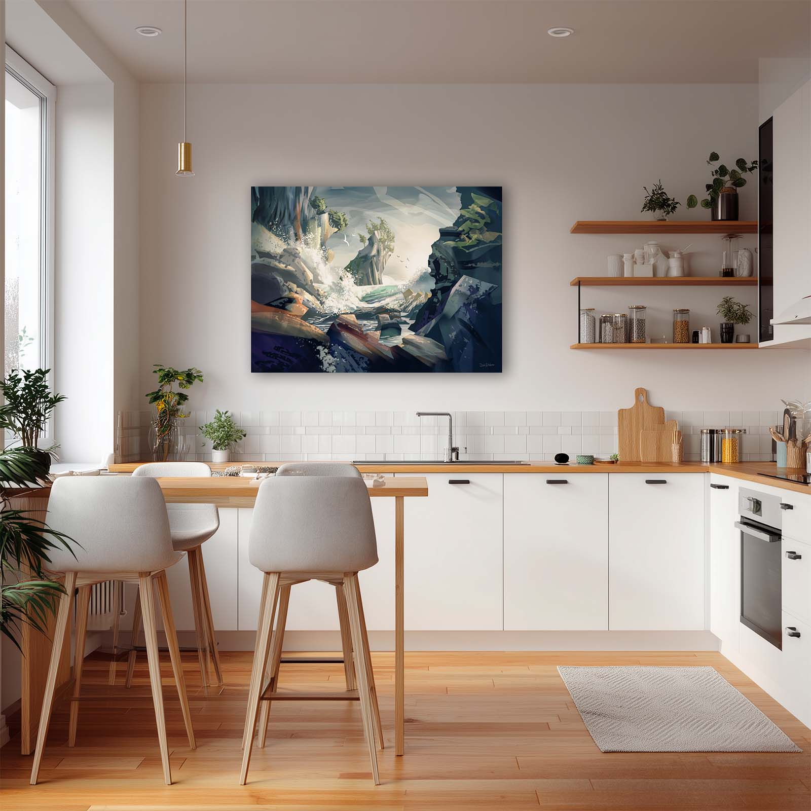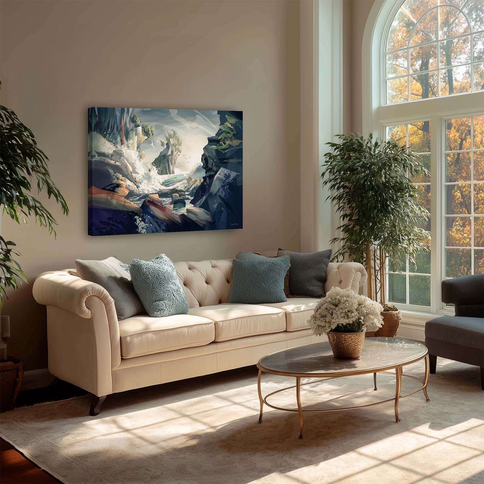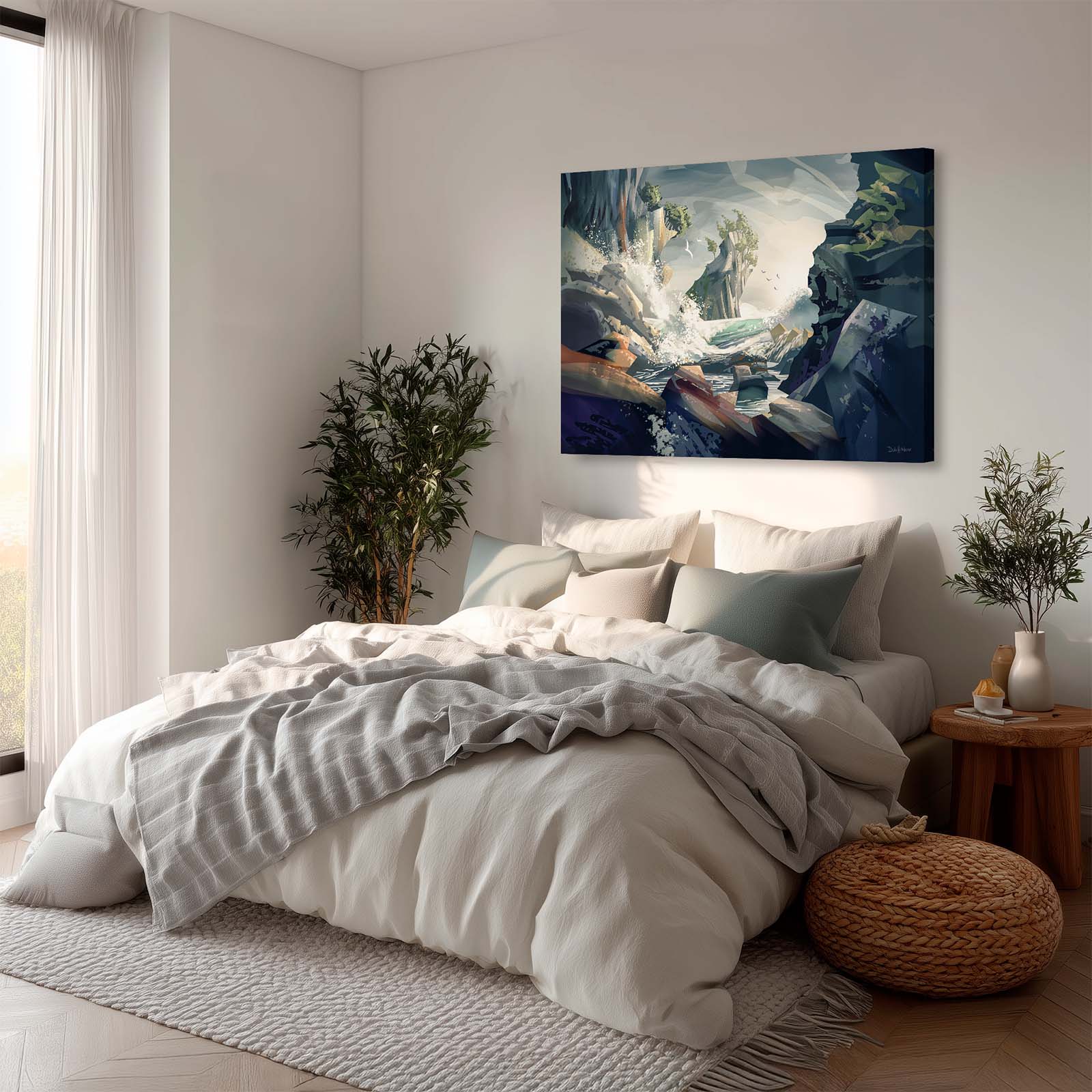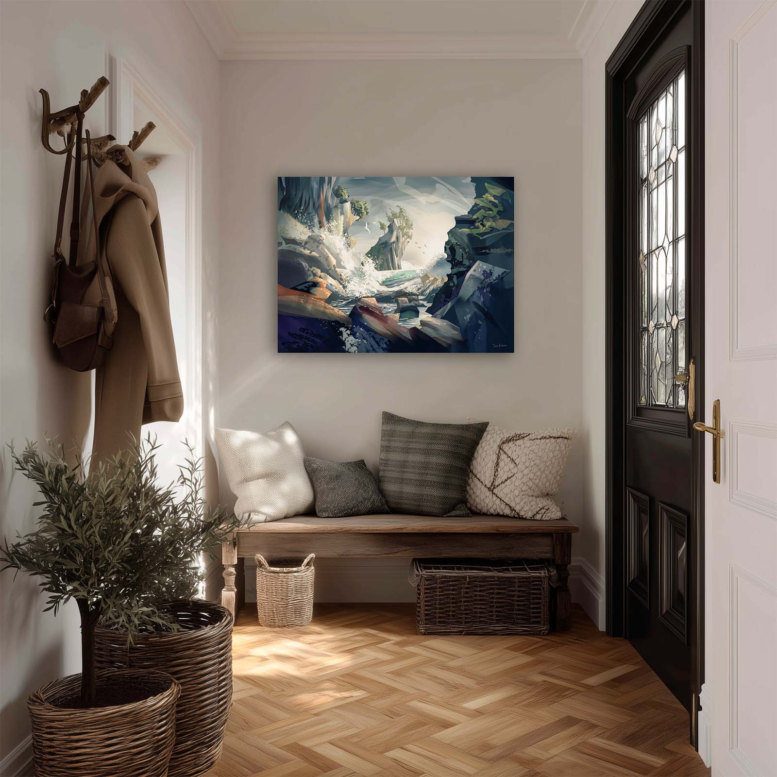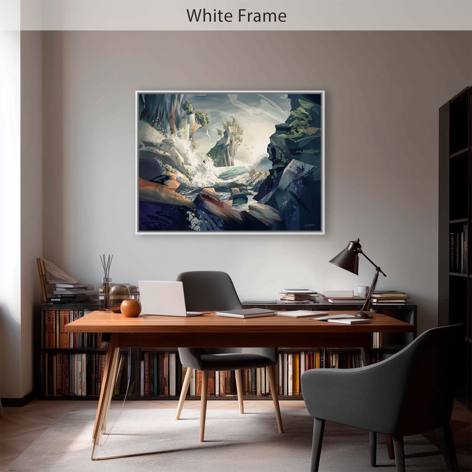 Celebrate the strength and rhythm of the sea with West Coast Waves, a bold cubist-inspired stretched-canvas print. This striking artwork captures the power and natural beauty of ocean, sky, and rocky coastline, rendered in strong geometric forms and dynamic movement.