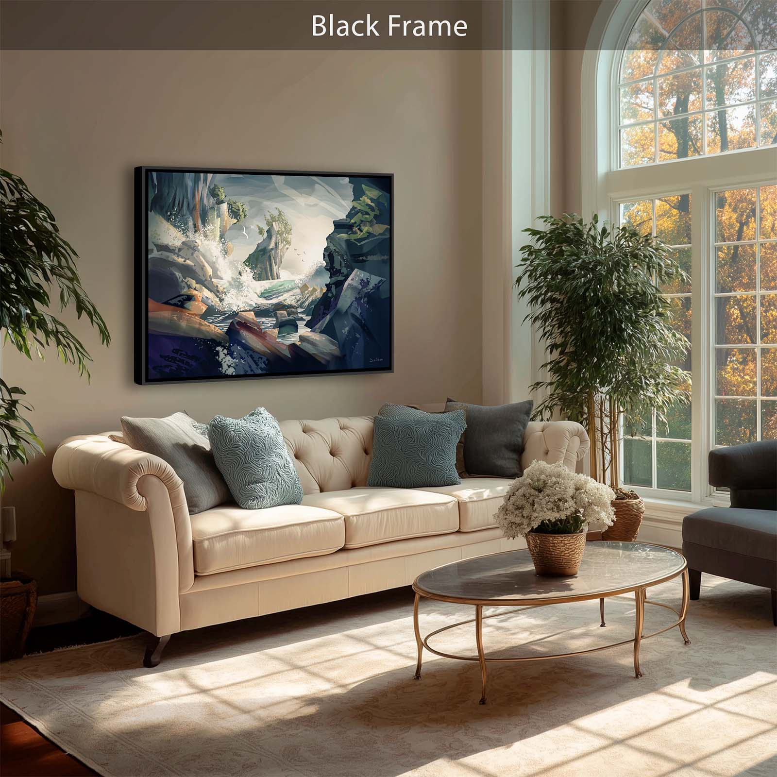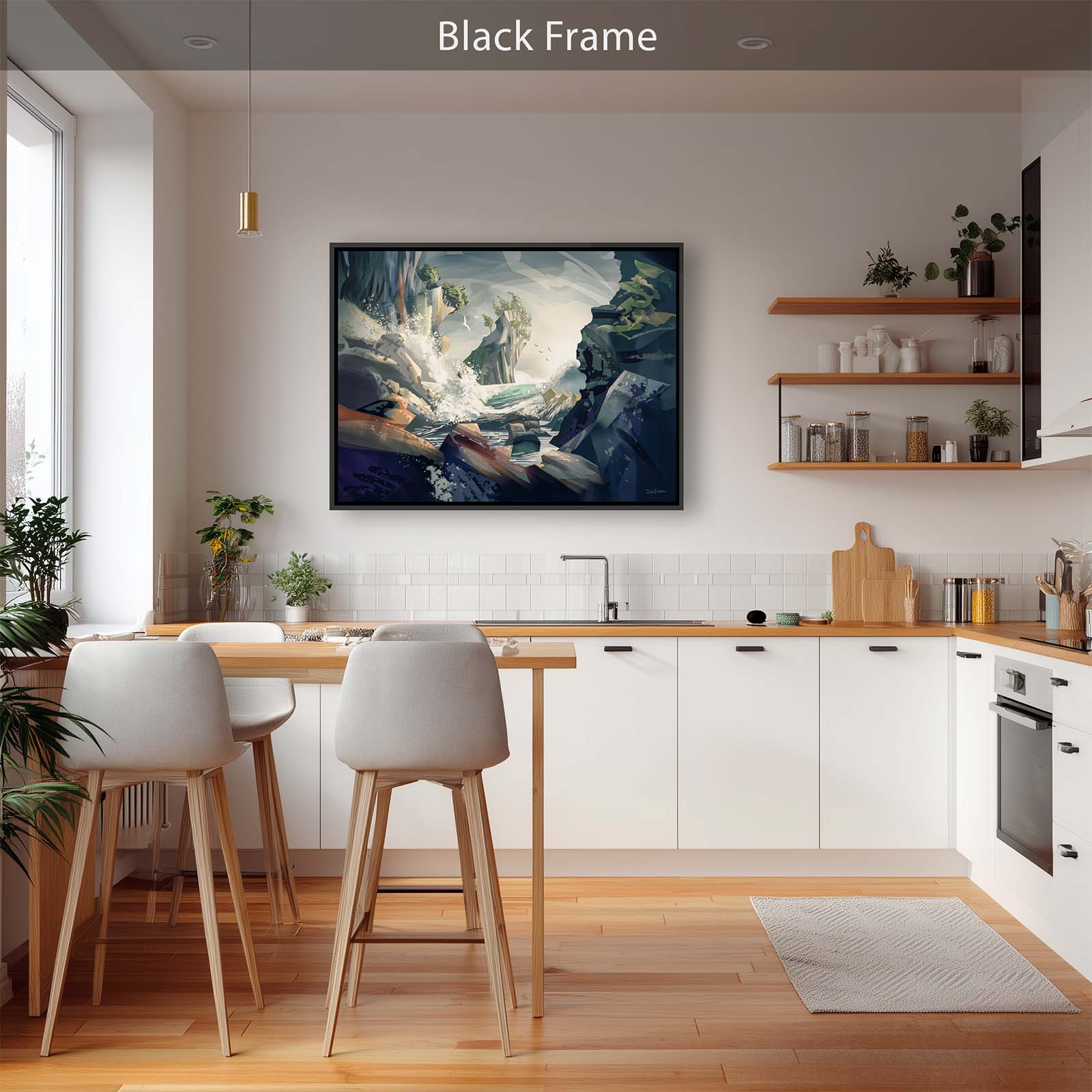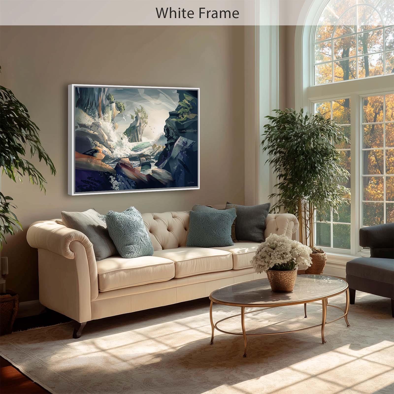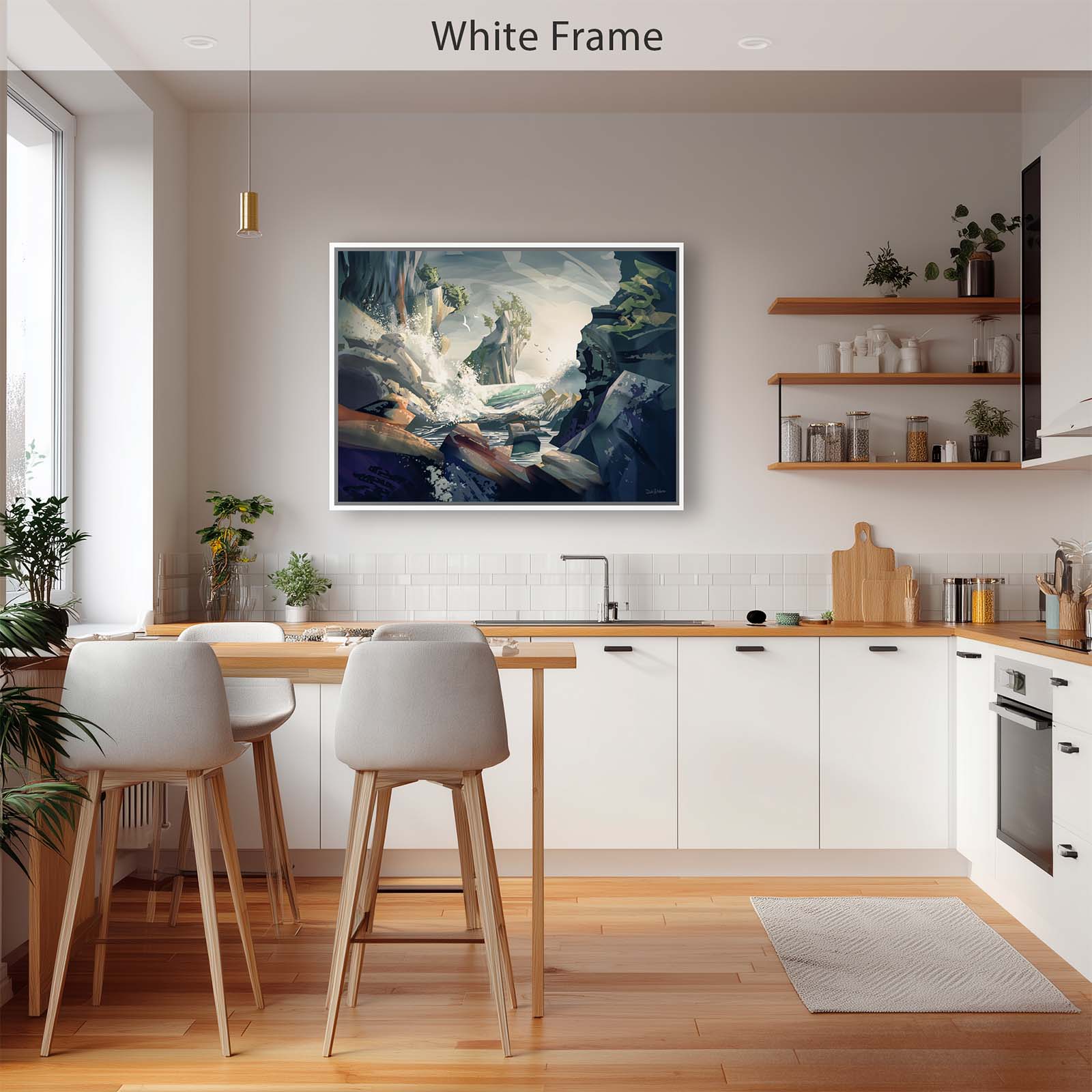 Celebrate the strength and rhythm of the sea with West Coast Waves, a bold cubist-inspired stretched-canvas print. This striking artwork captures the power and natural beauty of ocean, sky, and rocky coastline, rendered in strong geometric forms and dynamic movement.