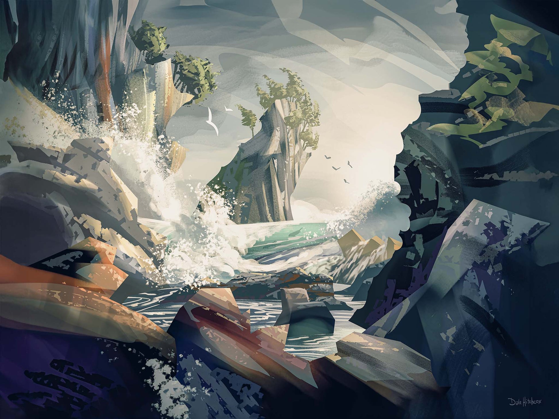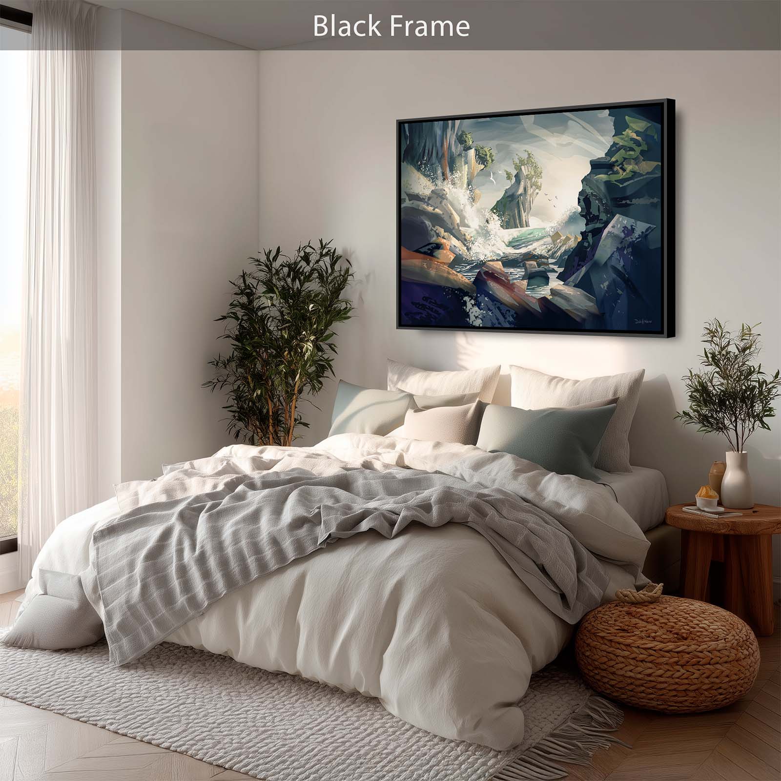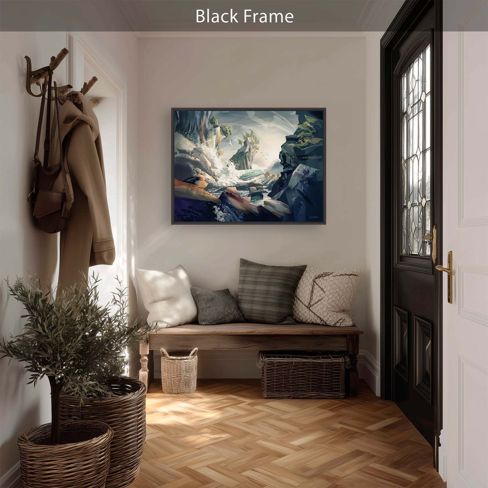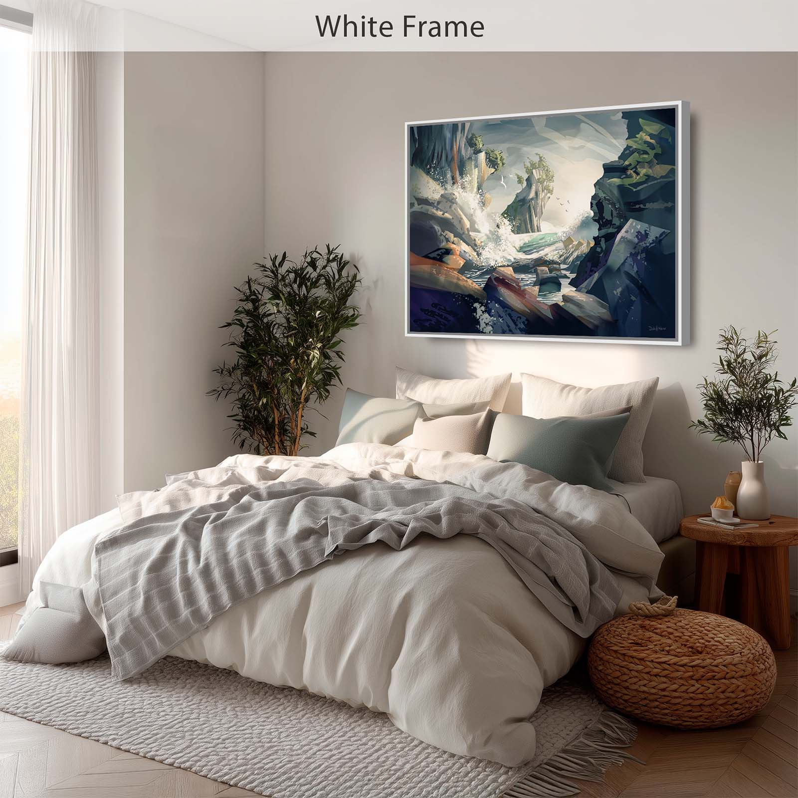 Celebrate the strength and rhythm of the sea with West Coast Waves, a bold cubist-inspired stretched-canvas print. This striking artwork captures the power and natural beauty of ocean, sky, and rocky coastline, rendered in strong geometric forms and dynamic movement.