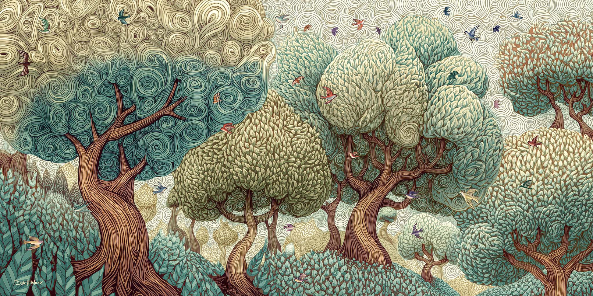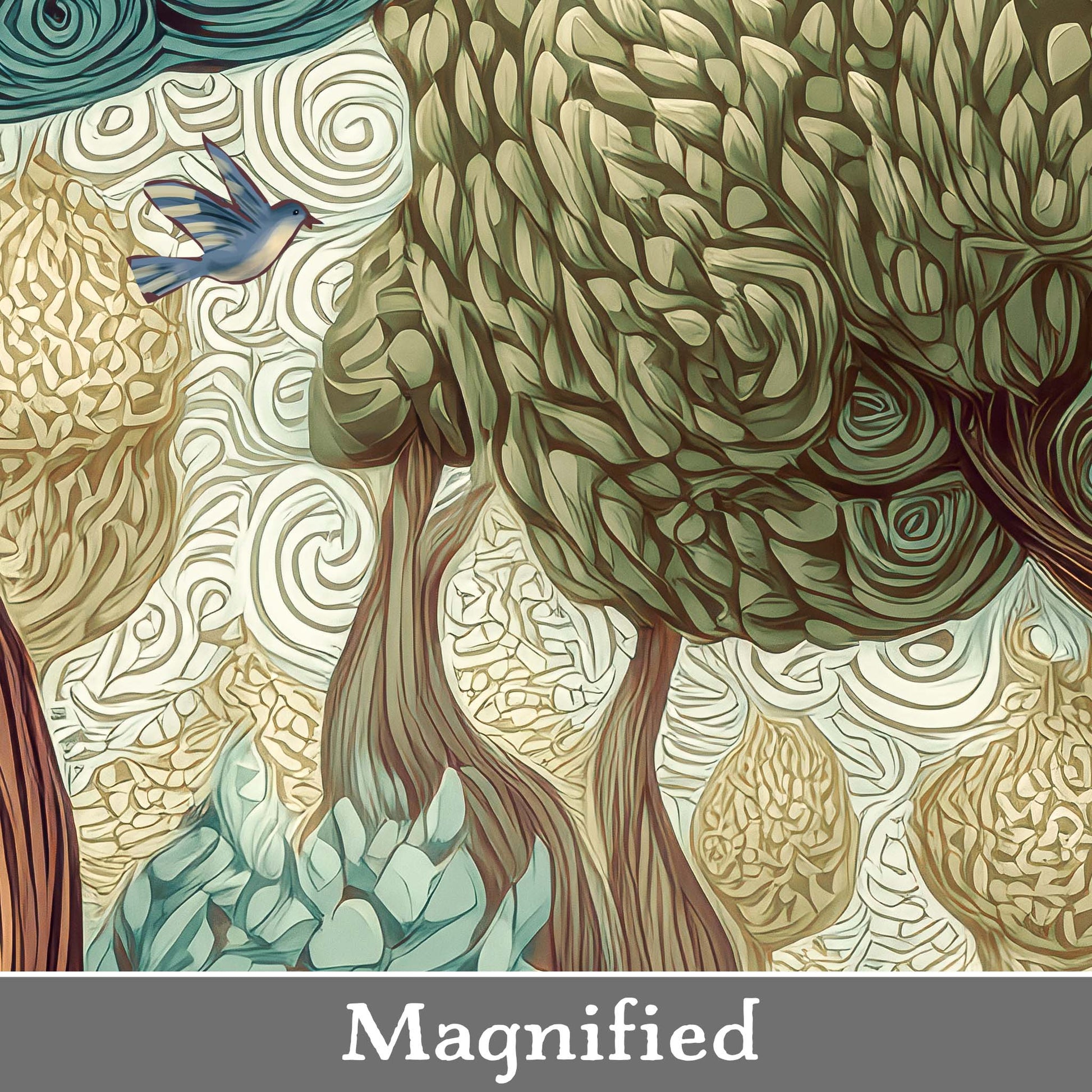 Bright, breezy, and full of charm, Whirly Birds captures the playful spirit of nature in motion. Little birds flutter among gracefully swirling trees on a blustery day, creating a scene that feels both whimsical and uplifting.
