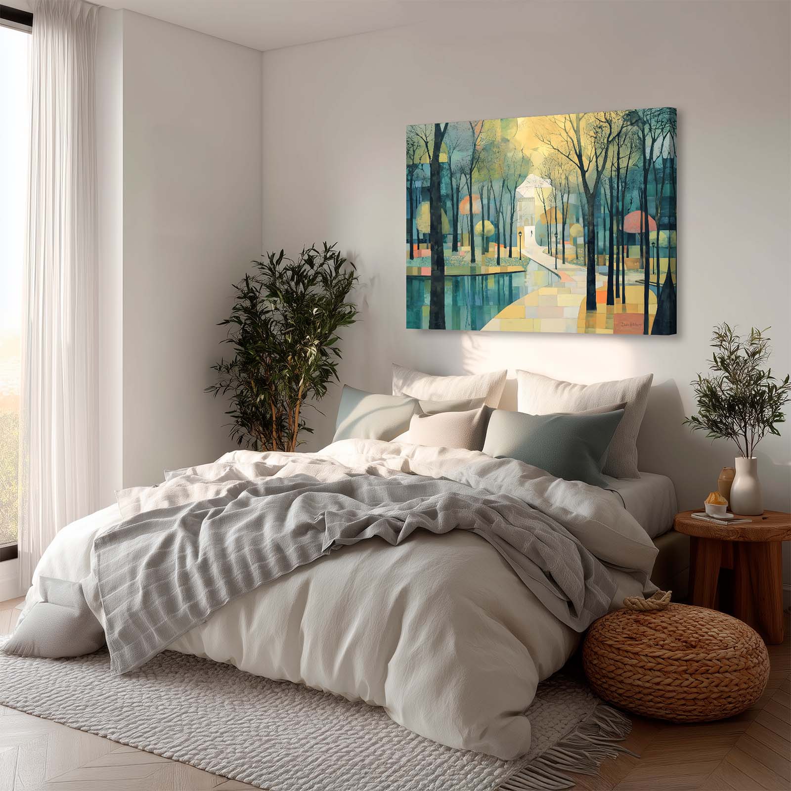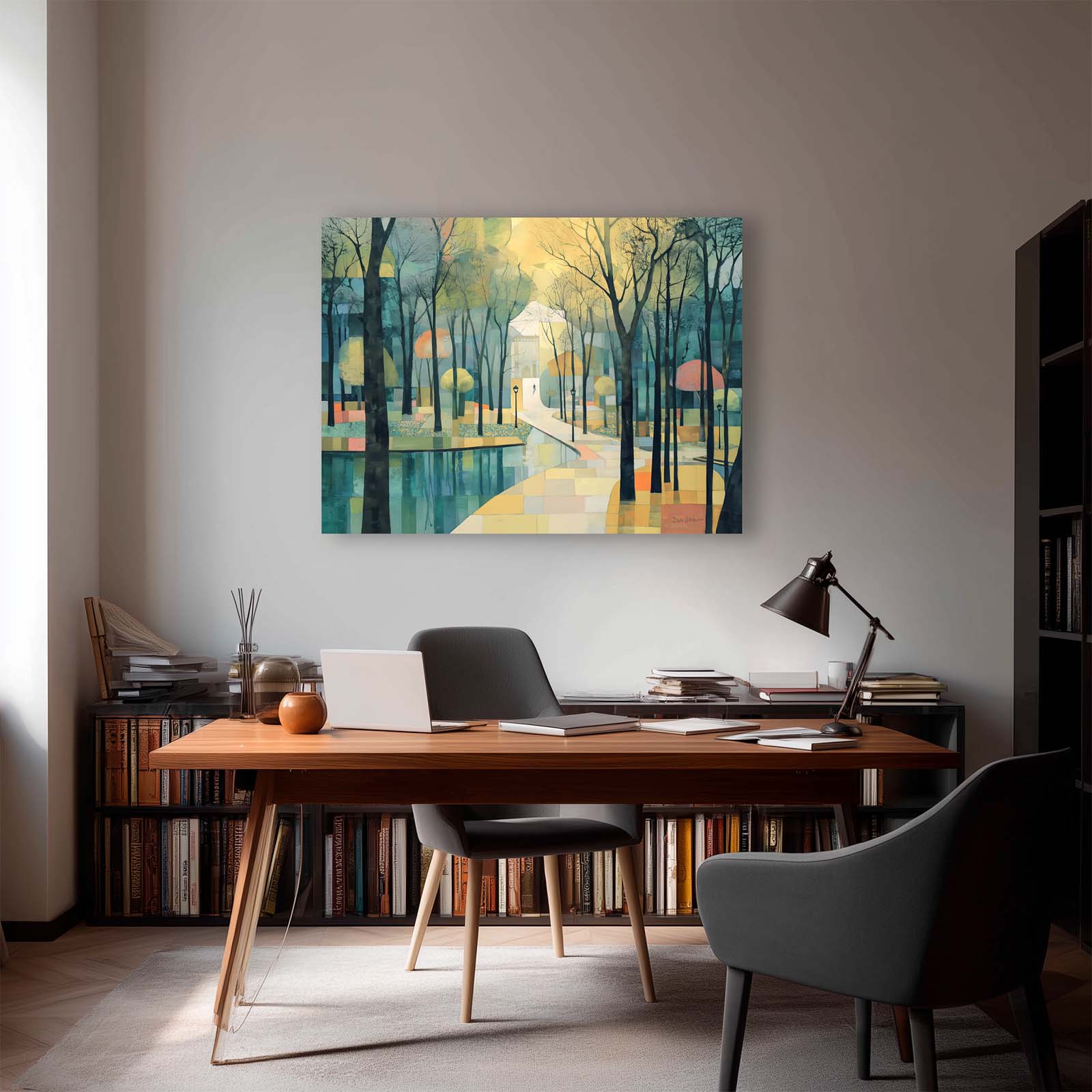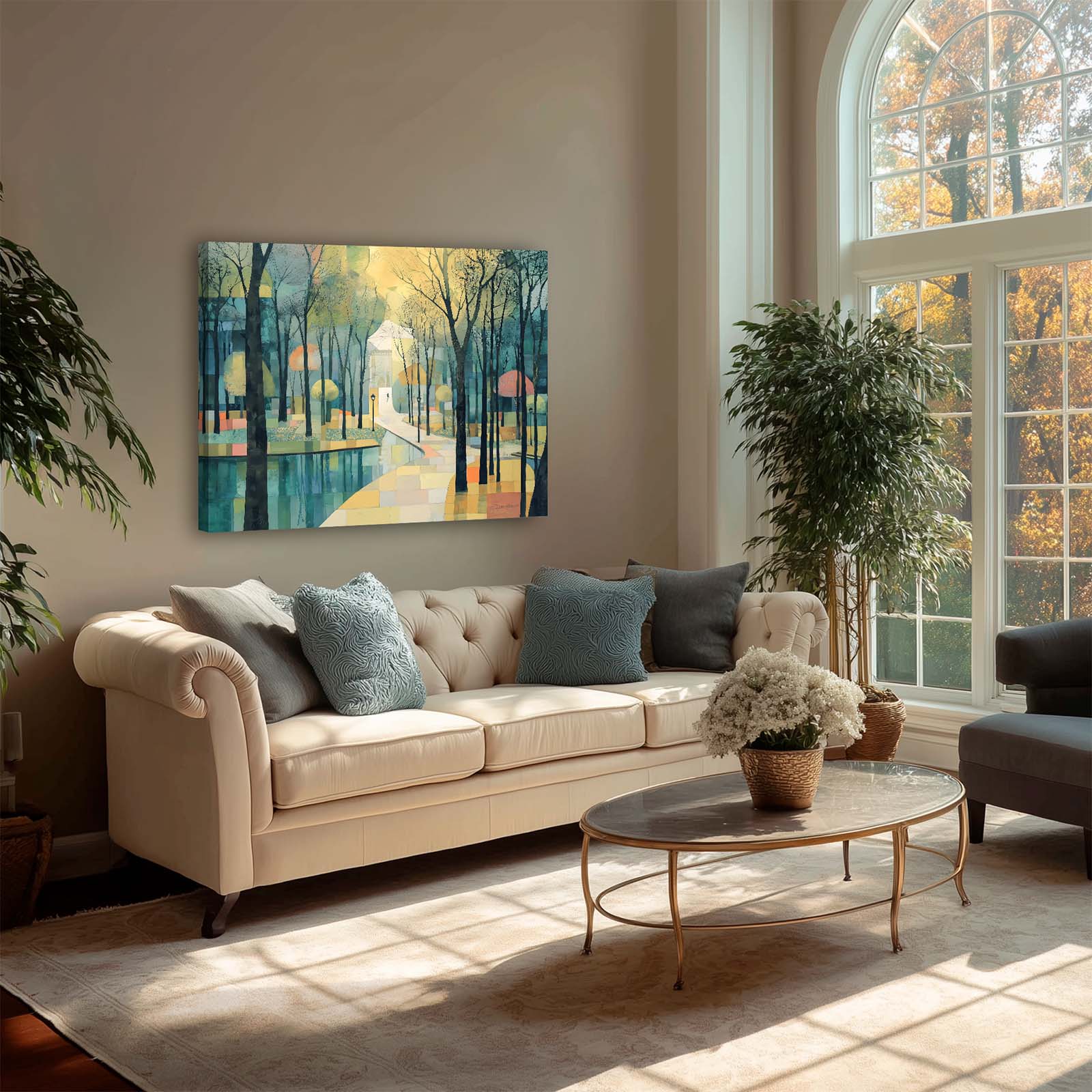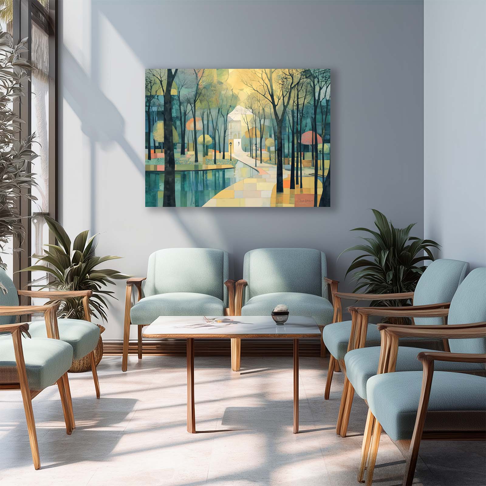 Bring warmth and charm to any room with this impressionistic canvas print. Subtle yellows highlight a serene park scene, perfect for home or office decor.