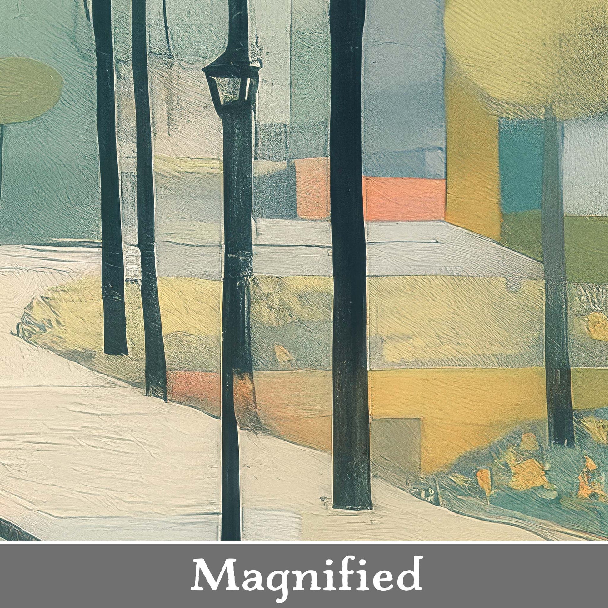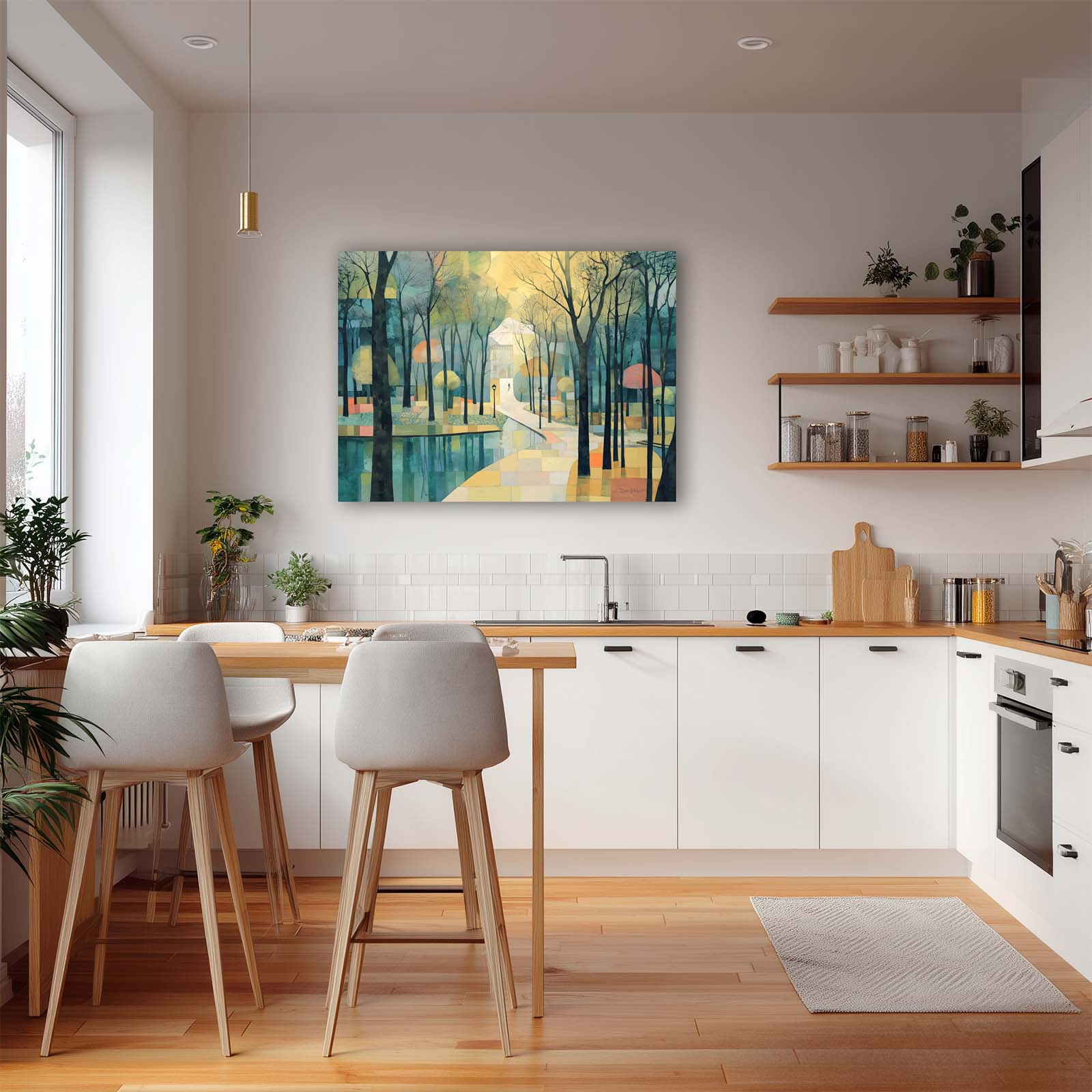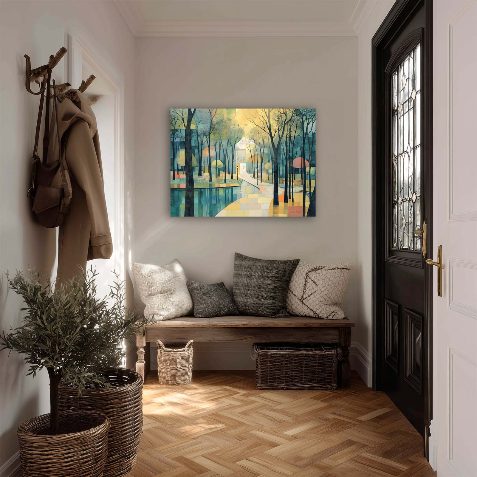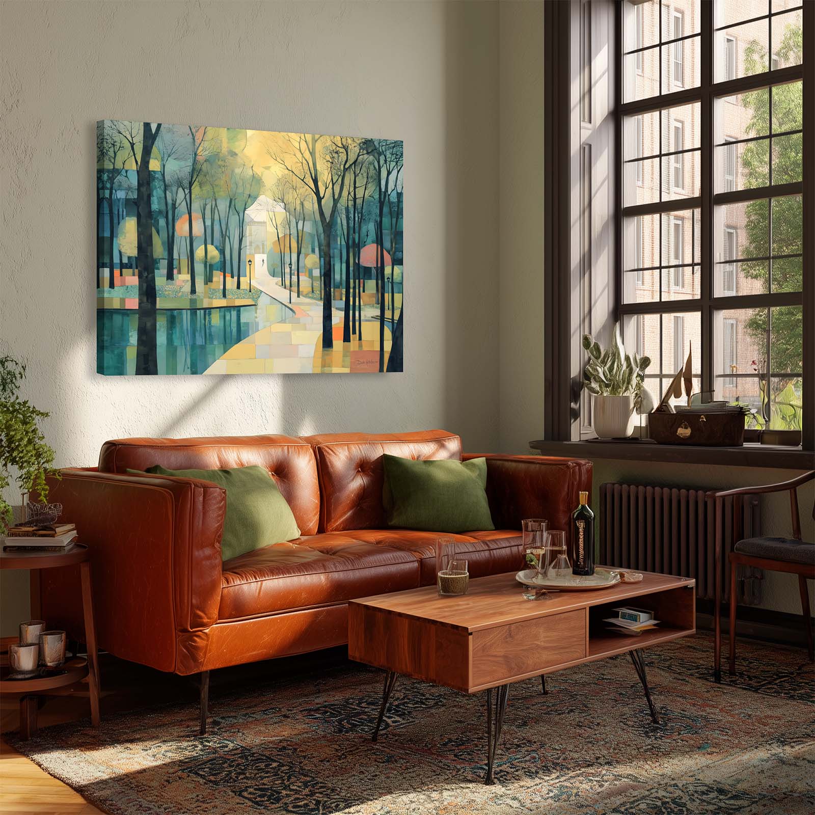 Bring warmth and charm to any room with this impressionistic canvas print. Subtle yellows highlight a serene park scene, perfect for home or office decor.