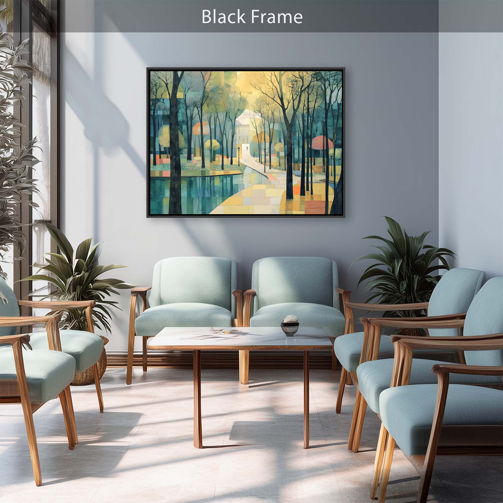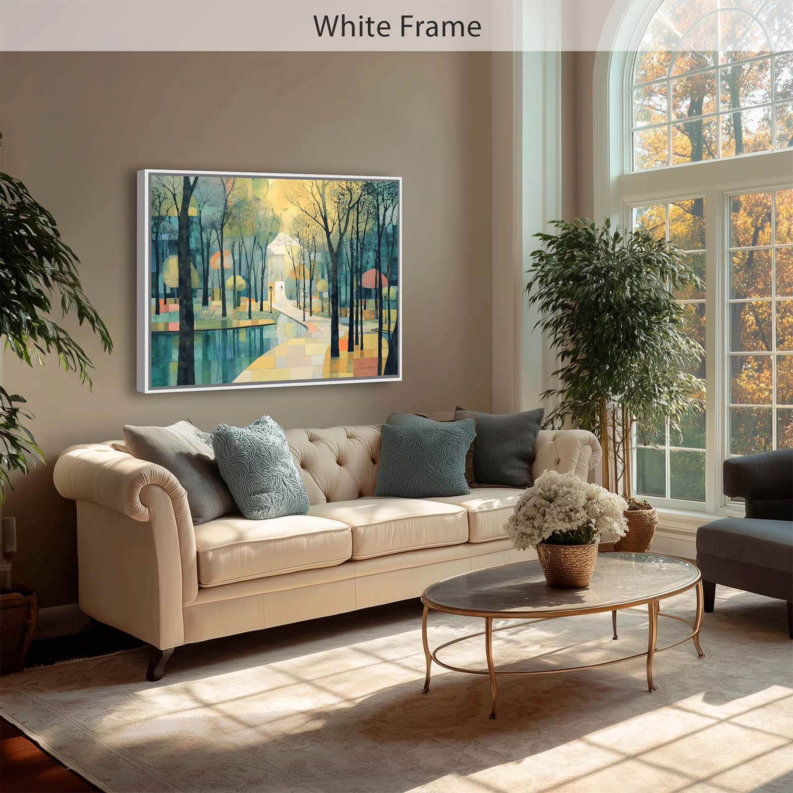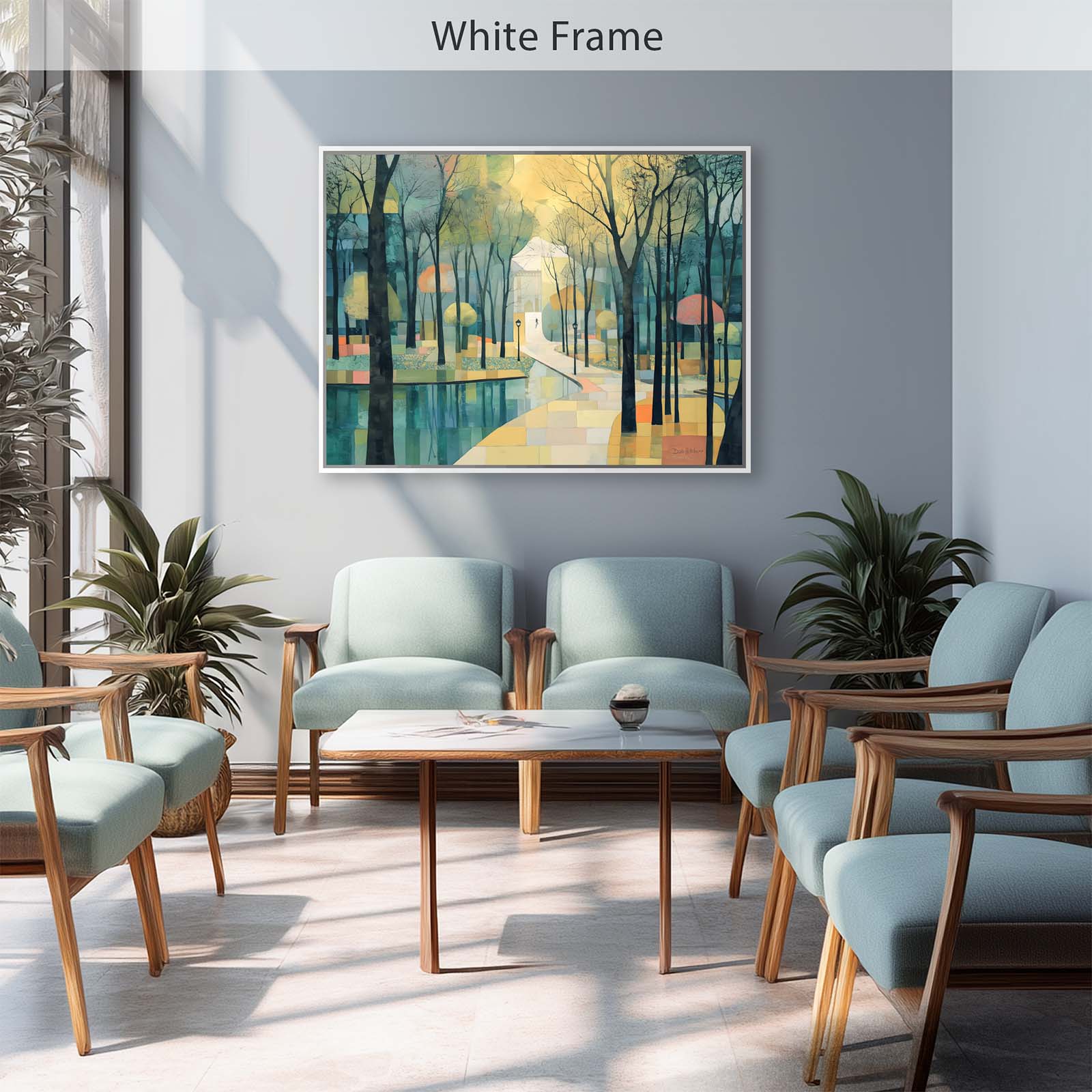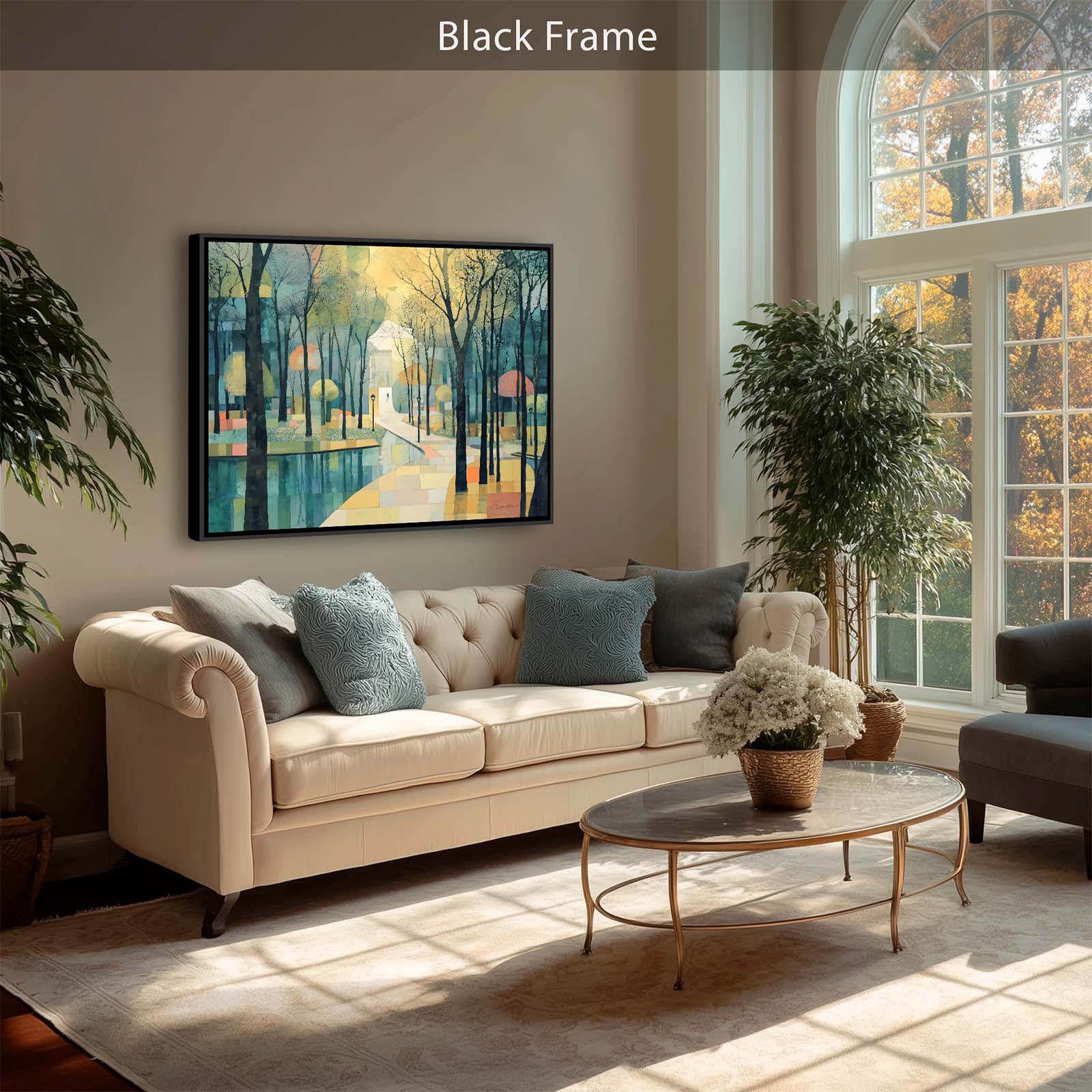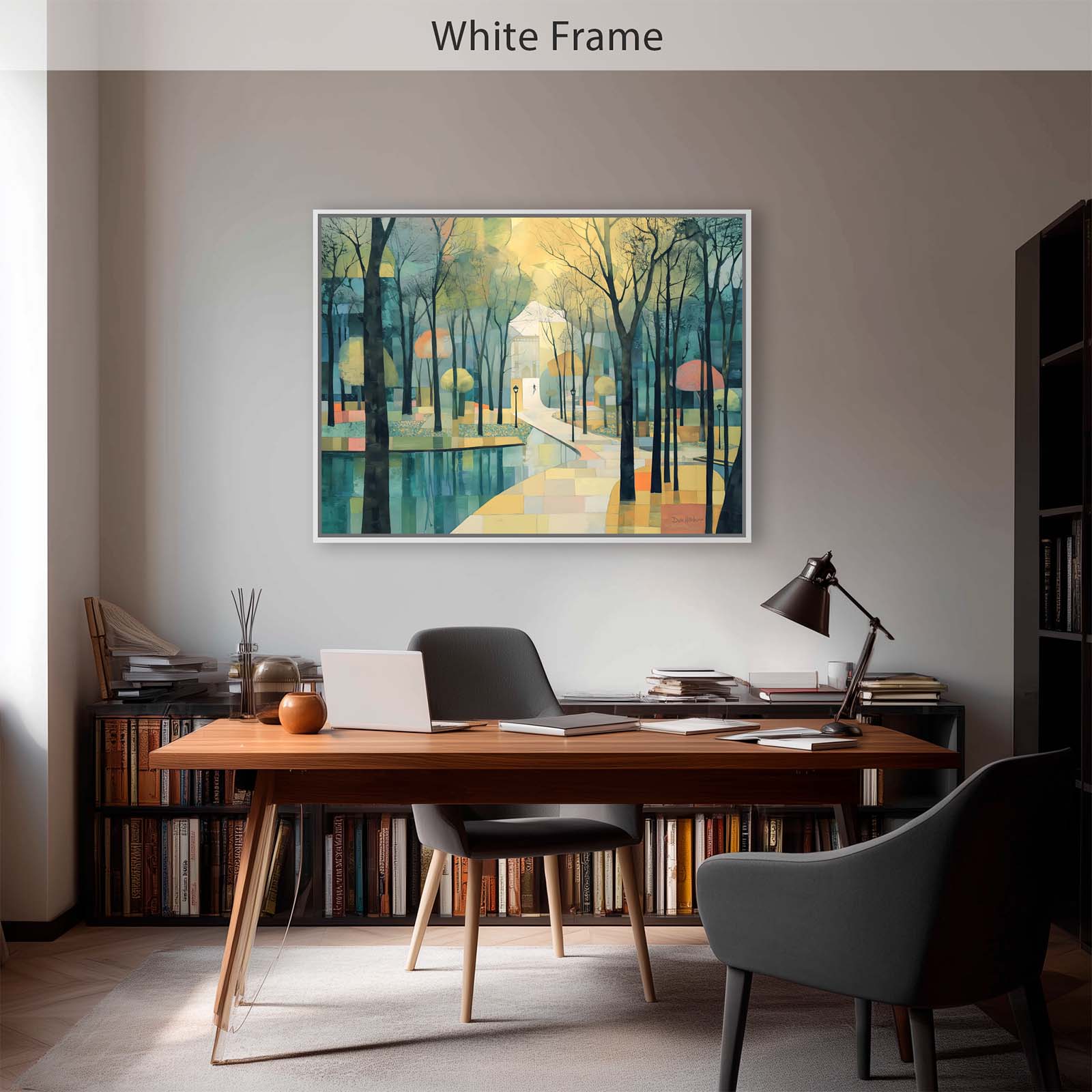 Bring warmth and charm to any room with this impressionistic canvas print. Subtle yellows highlight a serene park scene, perfect for home or office decor.